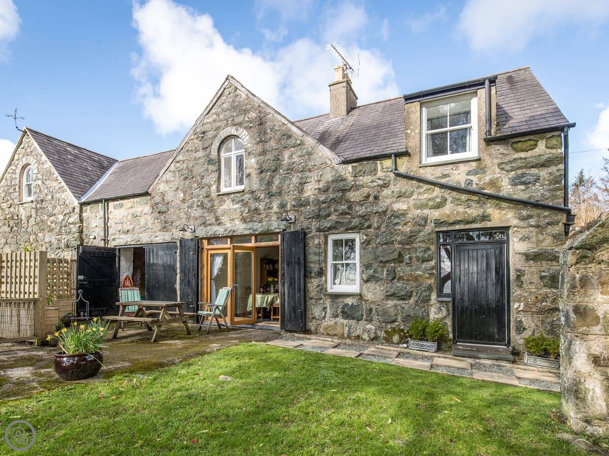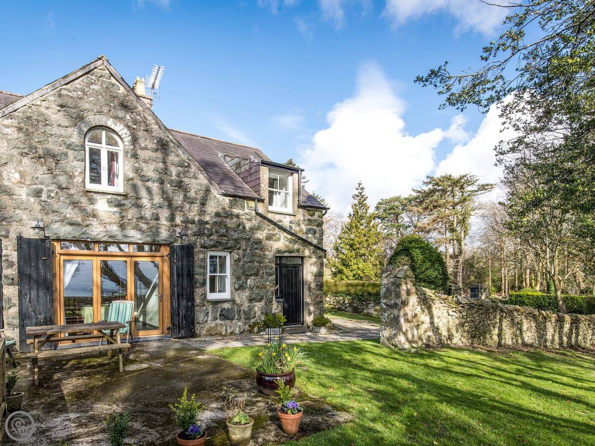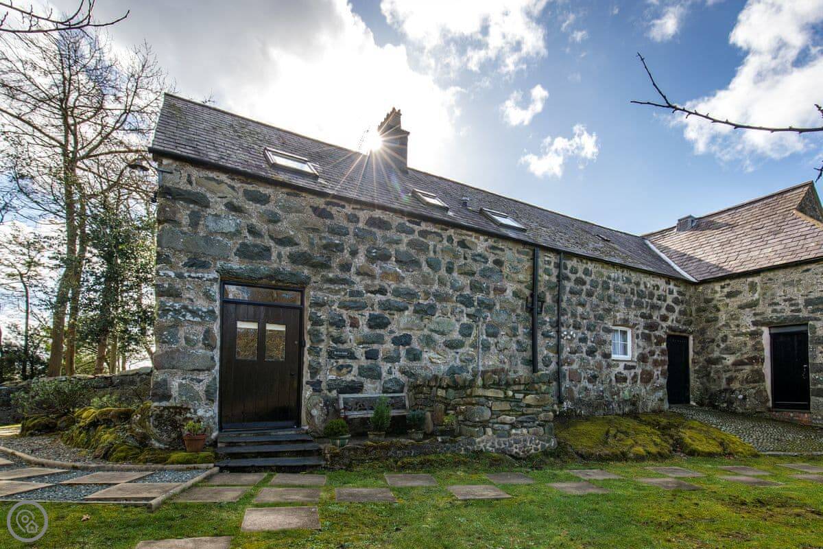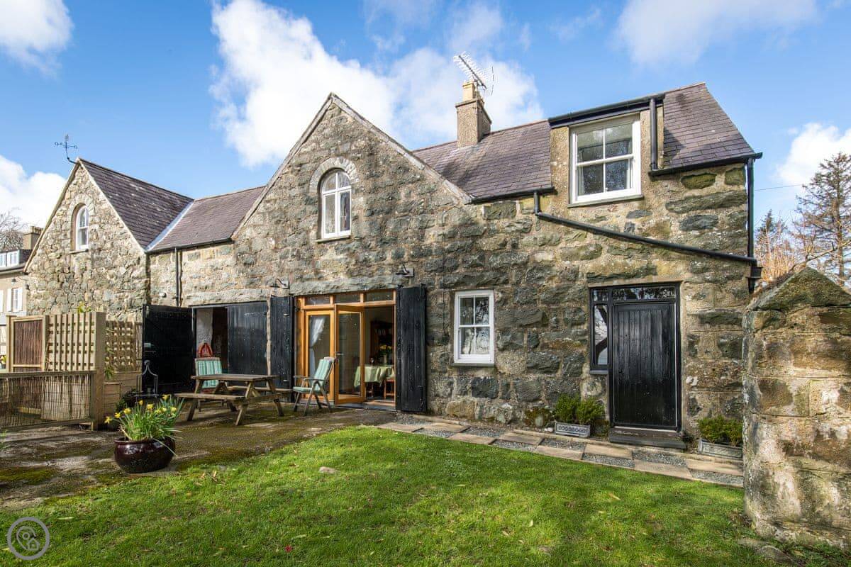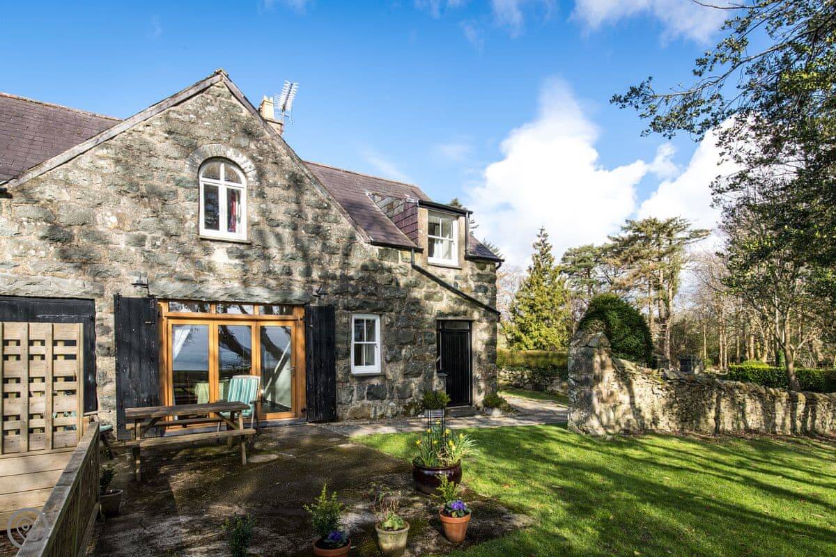 Bwthyn Stabal is on the edge of Criccieth, up on the hill. It's a converted stable block, so it's stone built and solid. The main thing is the view from the kitchen and garden out over the woods to the sea. It's quiet up here.