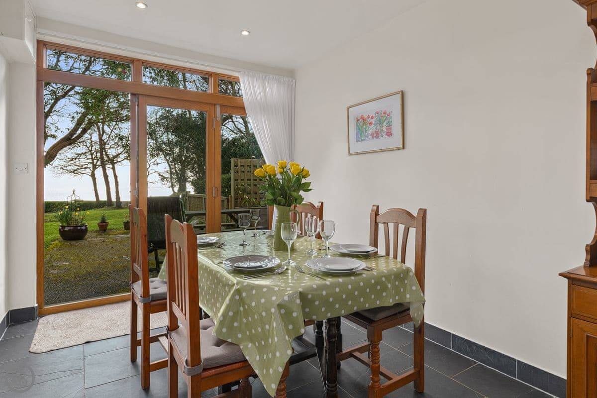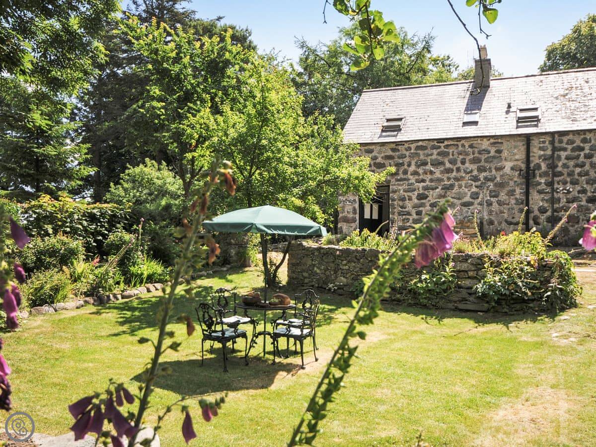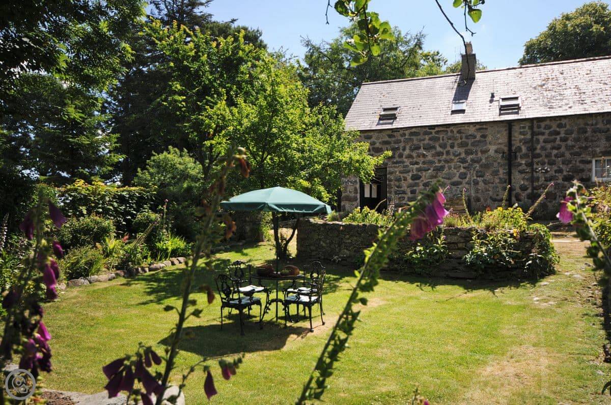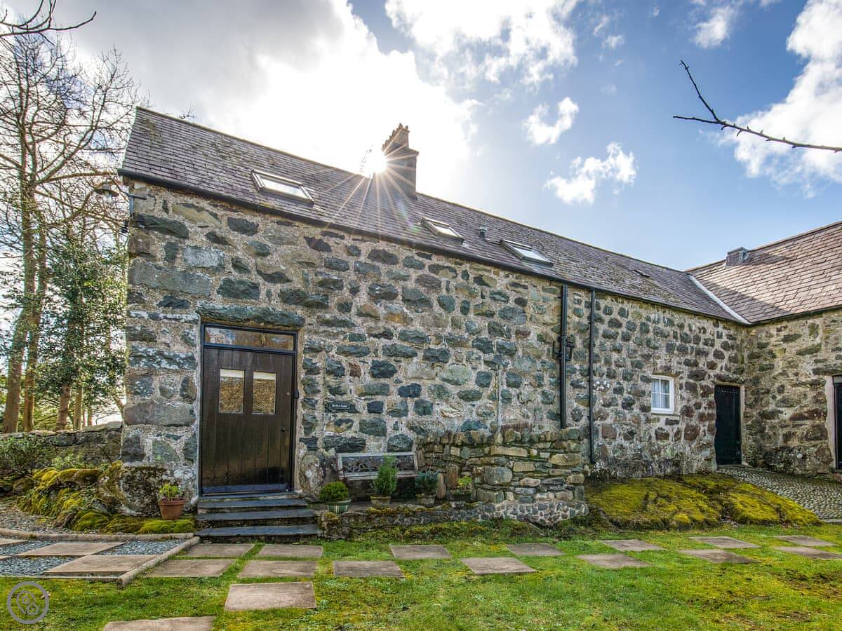 Bwthyn Stabal is on the edge of Criccieth, up on the hill. It's a converted stable block, so it's stone built and solid. The main thing is the view from the kitchen and garden out over the woods to the sea. It's quiet up here.