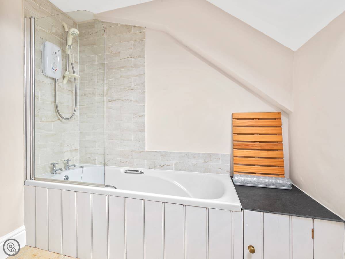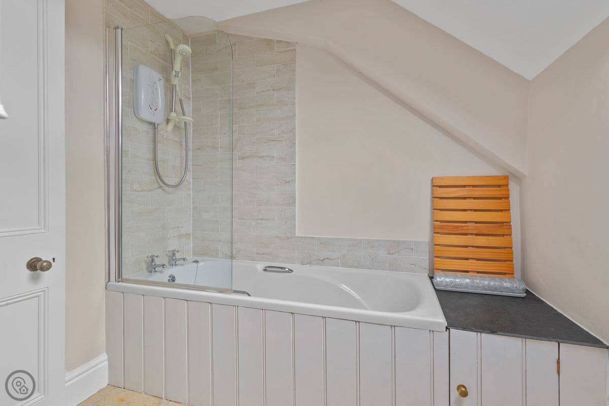 The garden is walled, which is good if you've got a dog or kids. There's parking right there, and an electric car charger if you need it. Inside, it's a mix of old and new. The living room is a bit snug with a Victorian fireplace. The kitchen is more modern, with big doors that open onto the patio.