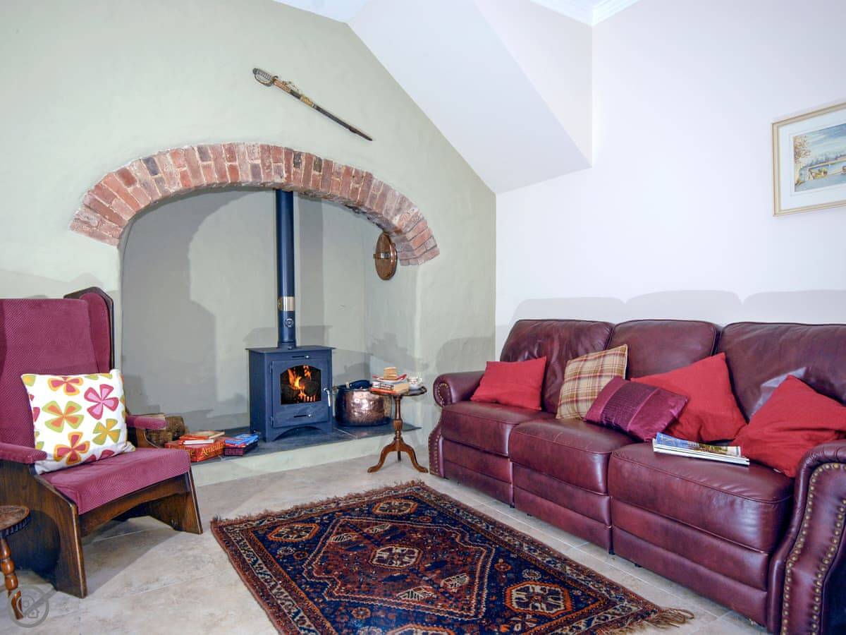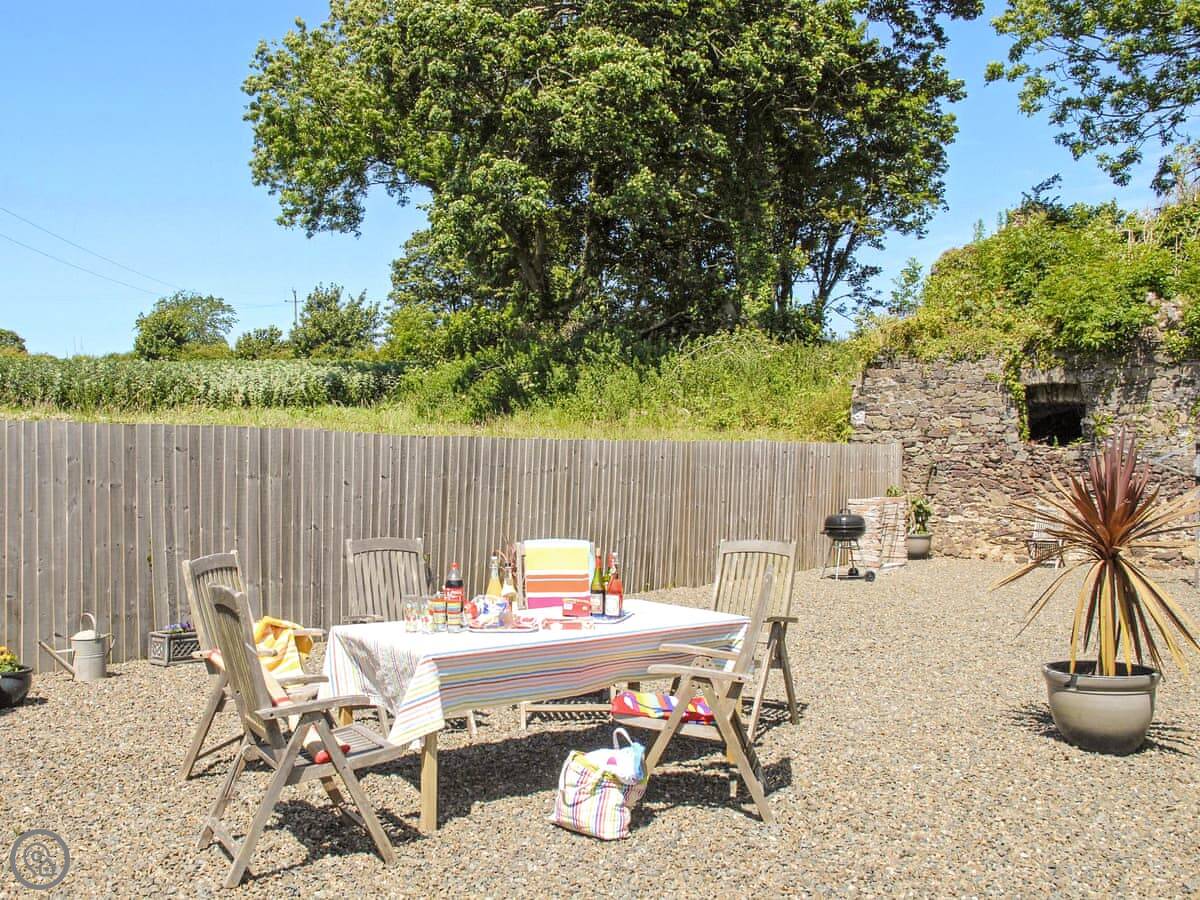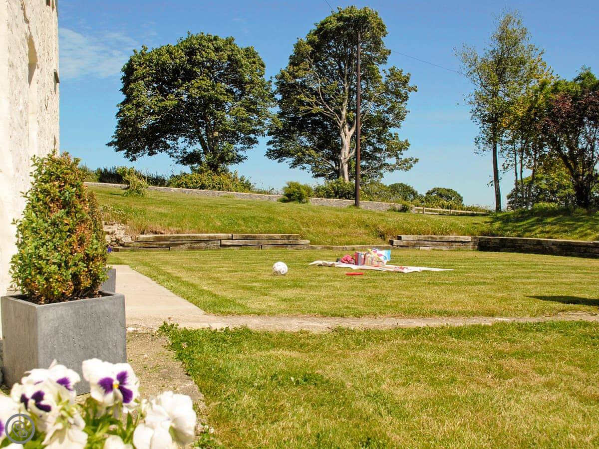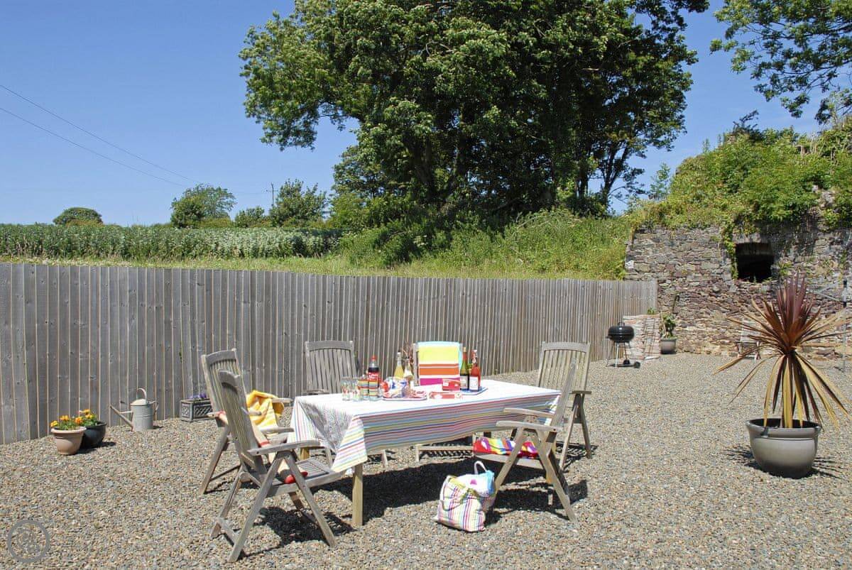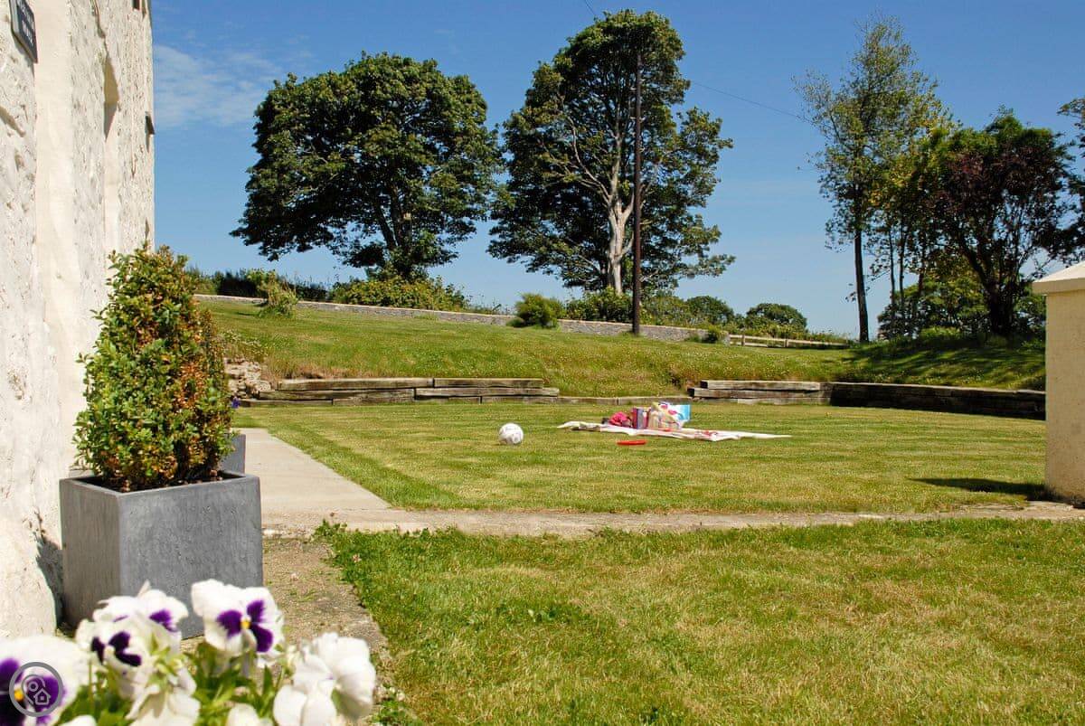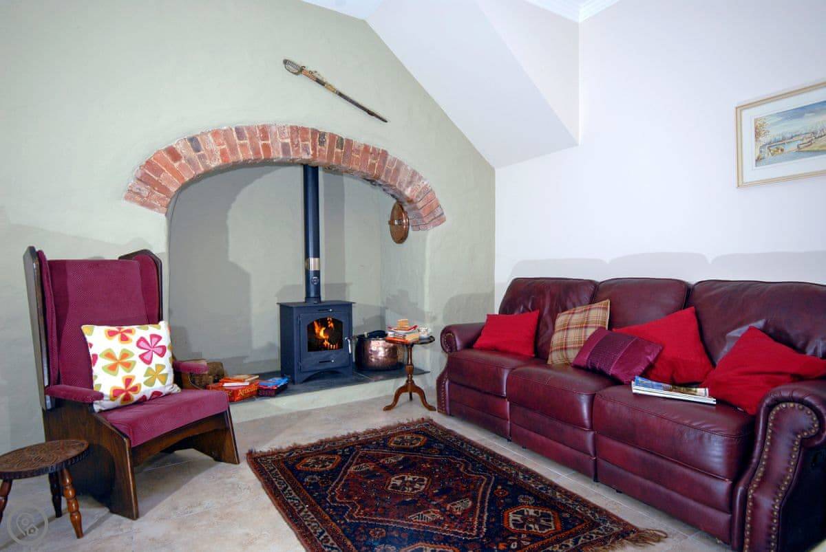 You get a wood burner and underfloor heating, so it's warm. There's a front and side lawn, and a sheltered patio area with some walls around it. Good for eating outside.