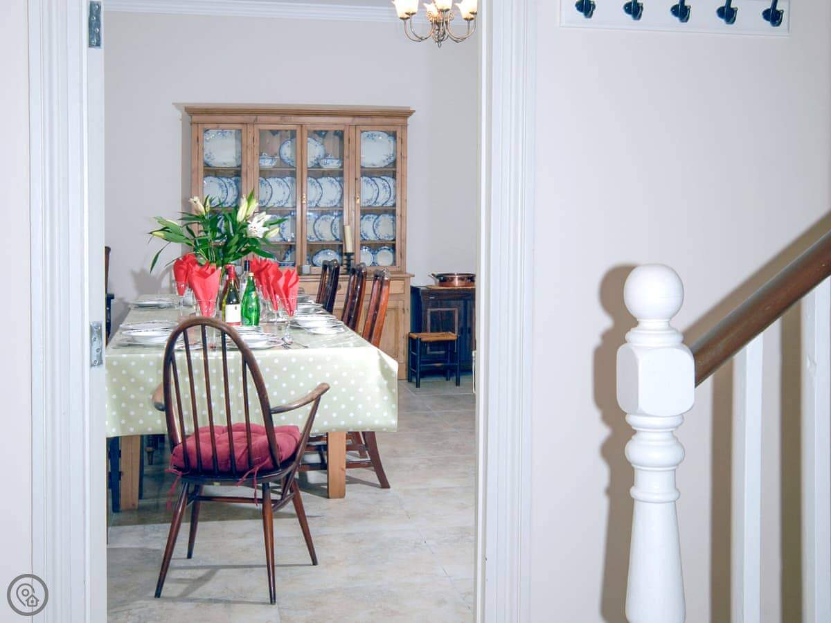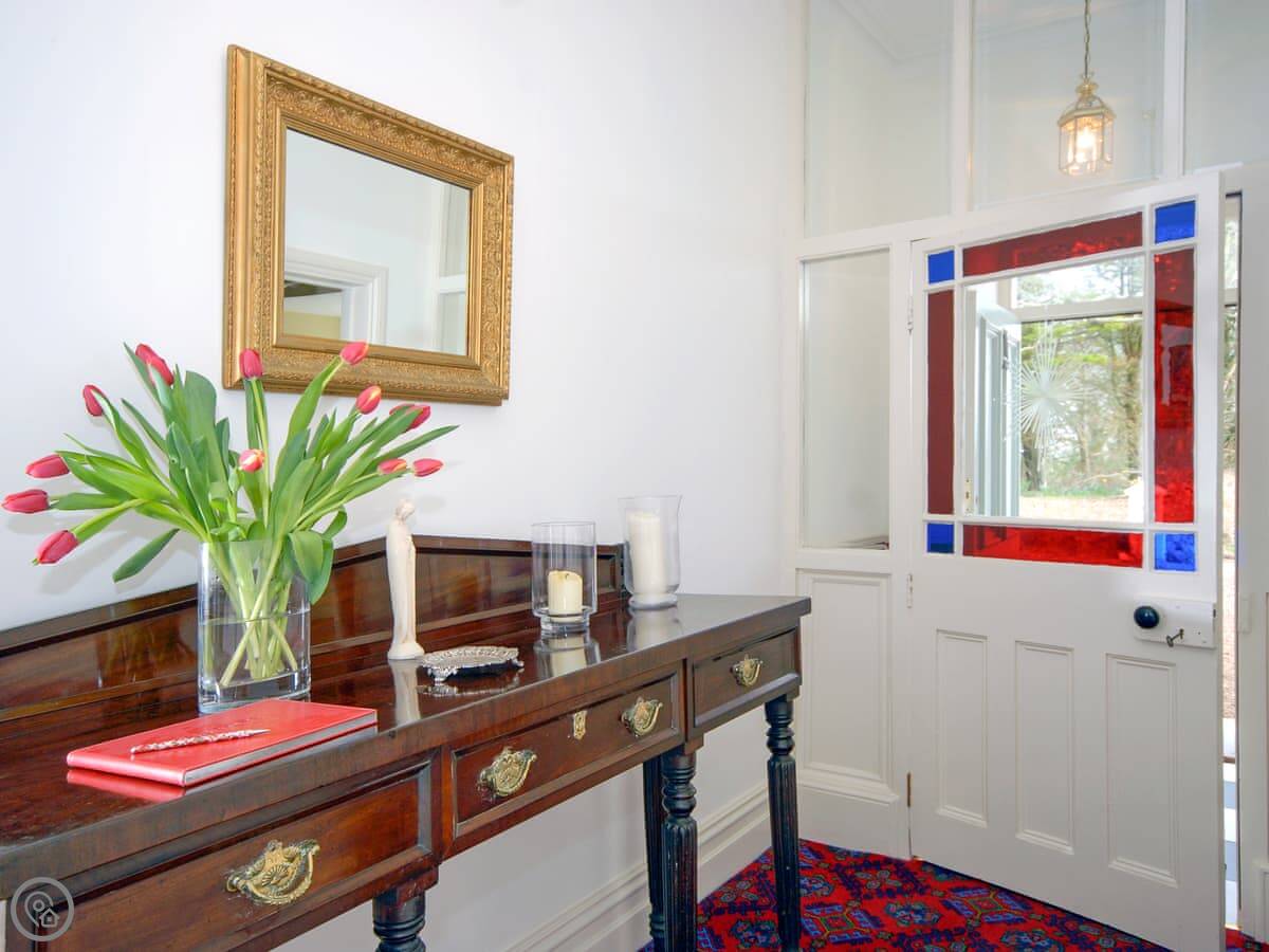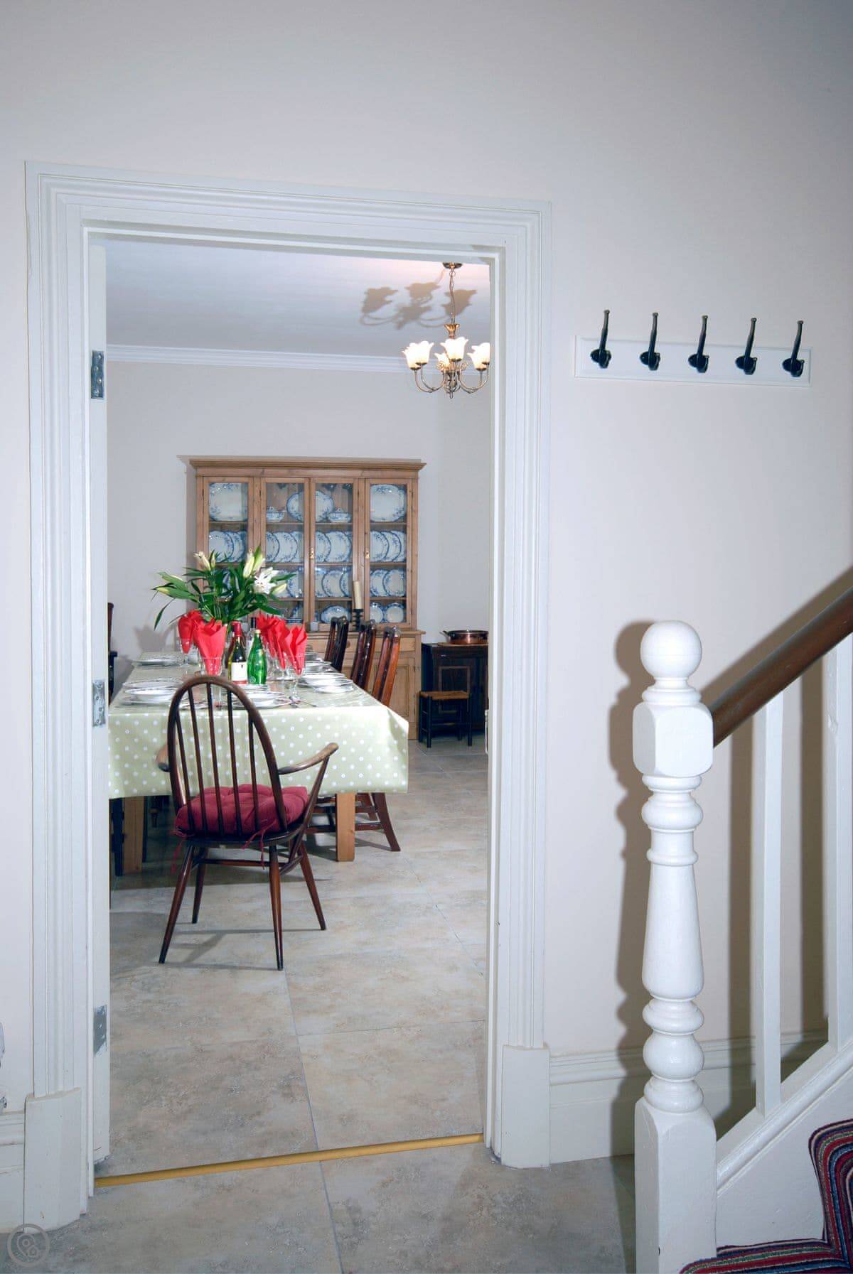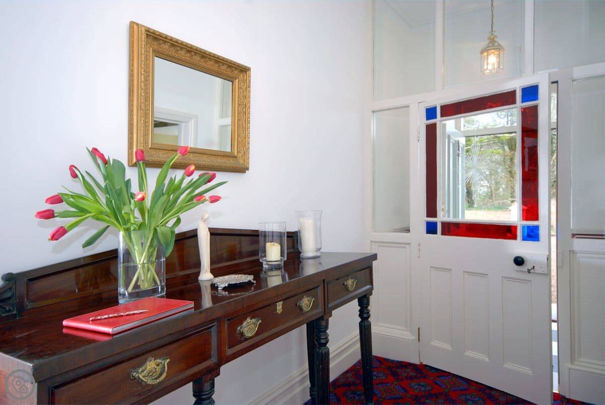 It sleeps ten people. There are five bedrooms and two bathrooms. One of the bedrooms is on the ground floor. The stairs are a proper turning staircase, quite grand. There's a stained glass window on the half landing. The place is furnished with a mix of old and new things, some local art.