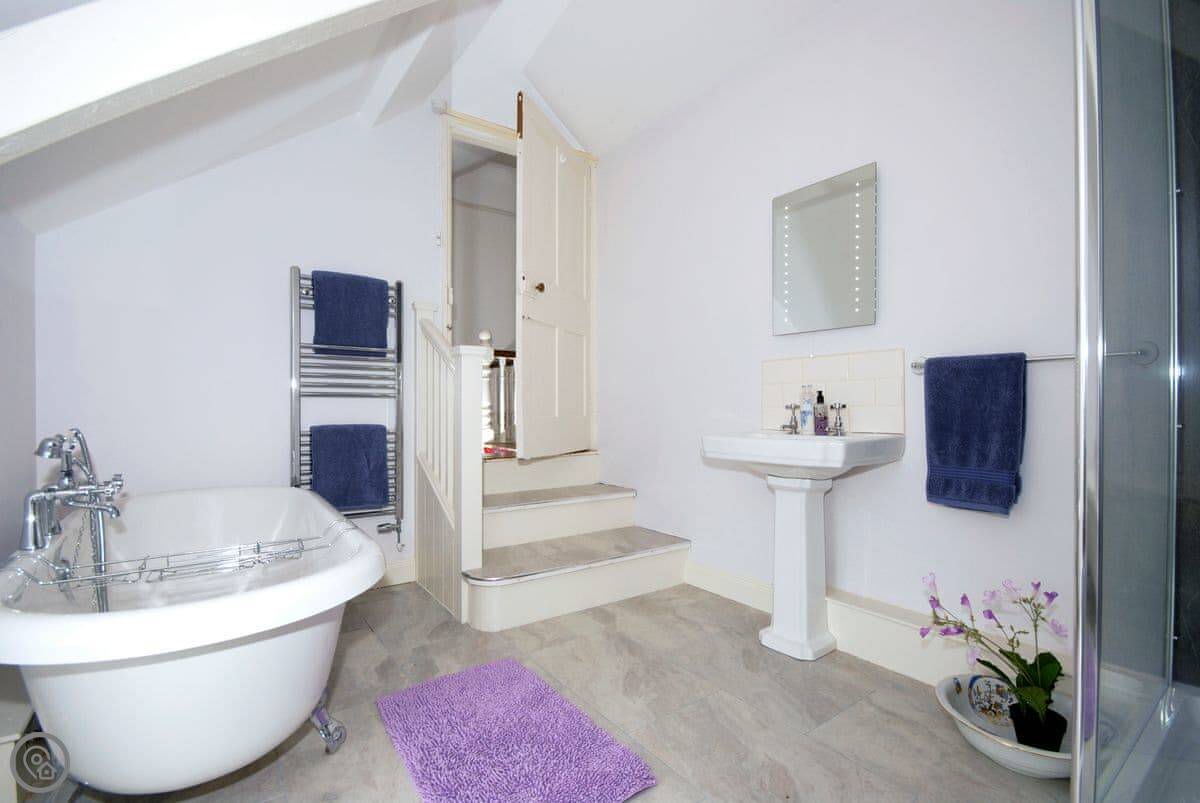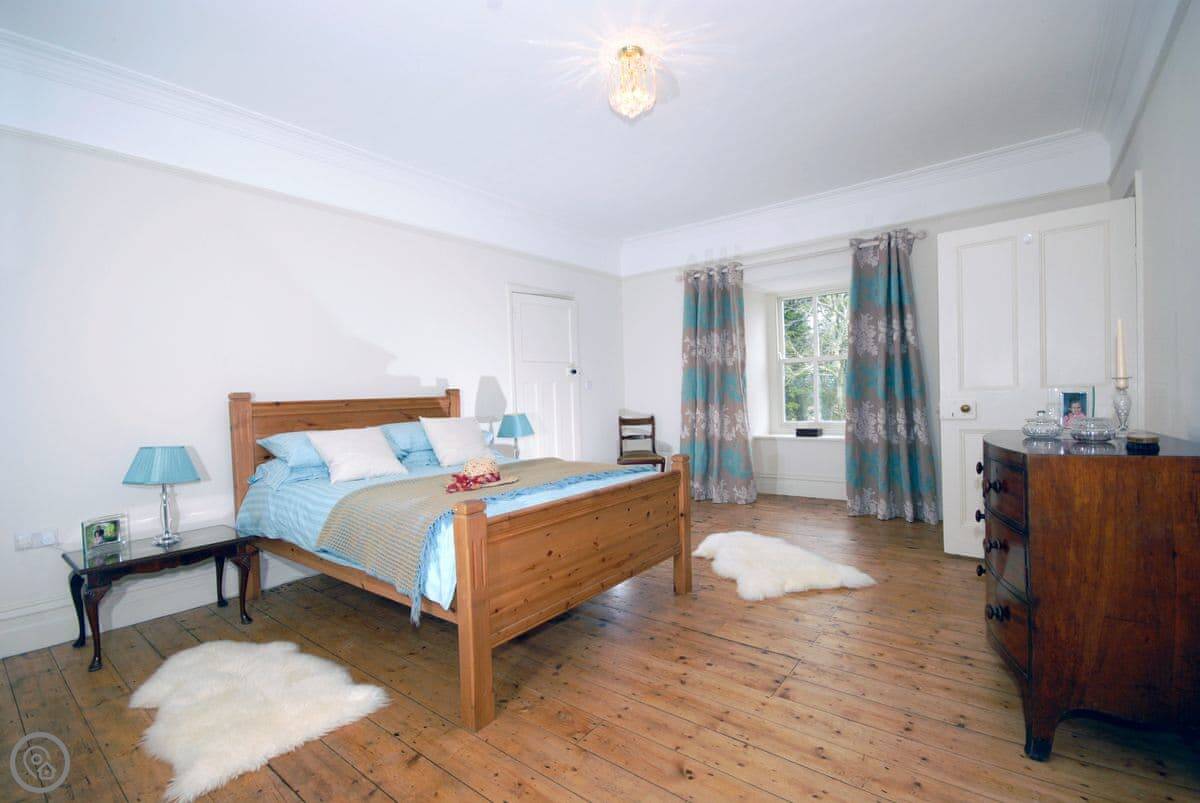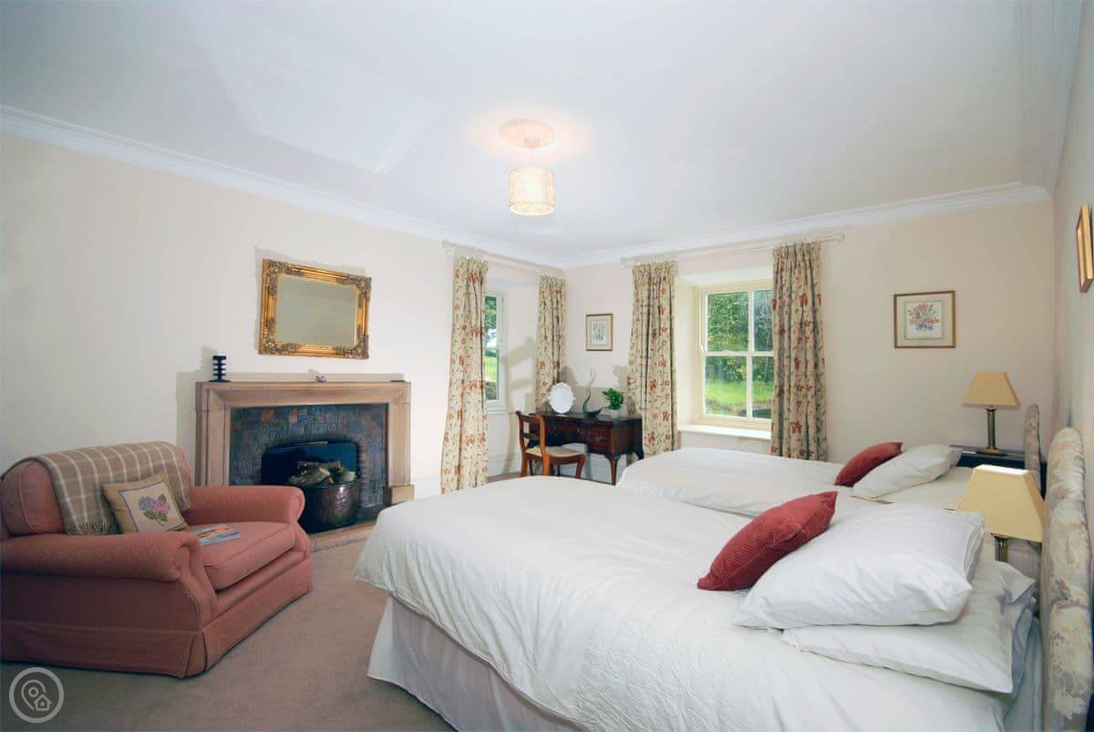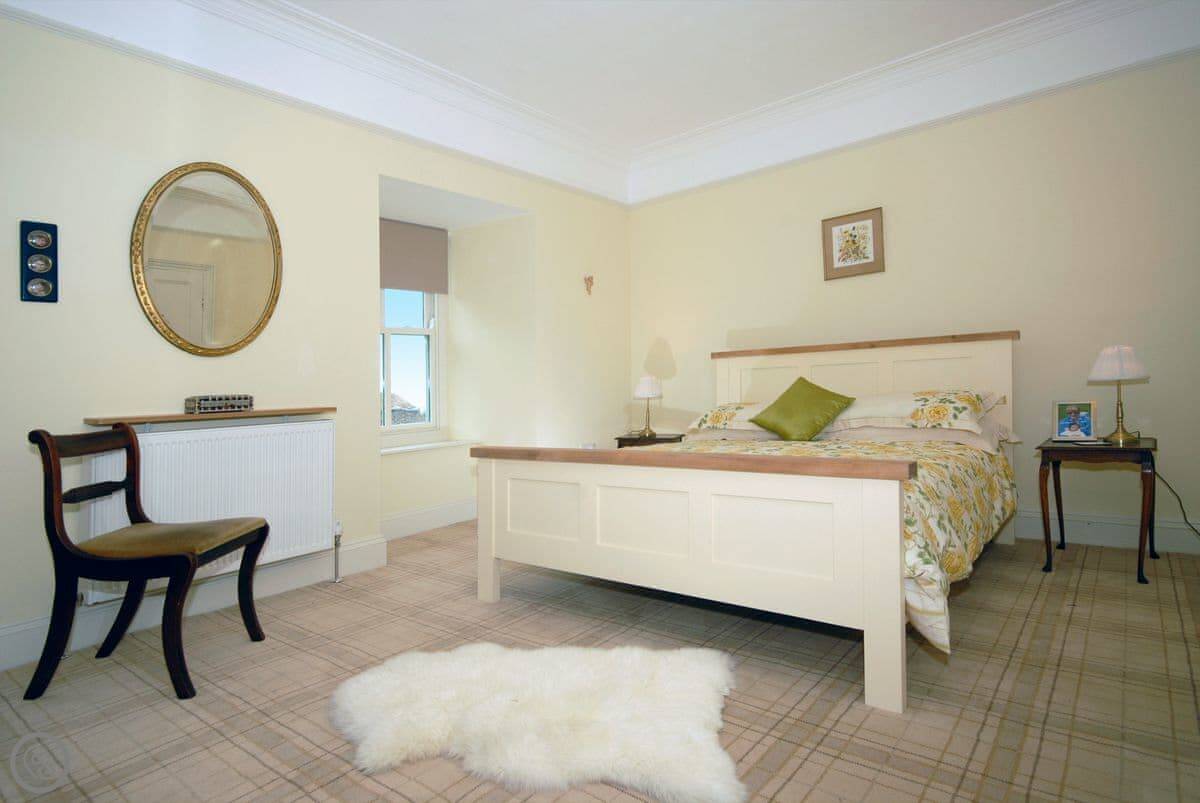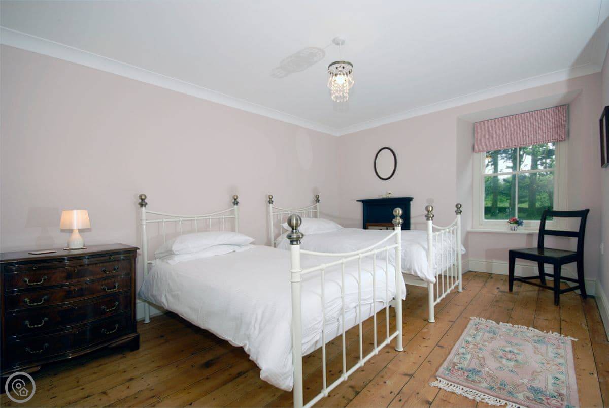 It sleeps ten people. There are five bedrooms and two bathrooms. One of the bedrooms is on the ground floor. The stairs are a proper turning staircase, quite grand. There's a stained glass window on the half landing. The place is furnished with a mix of old and new things, some local art.