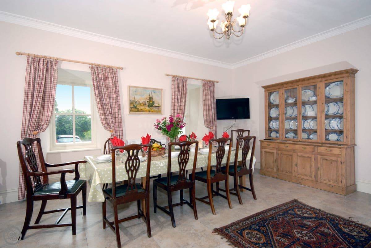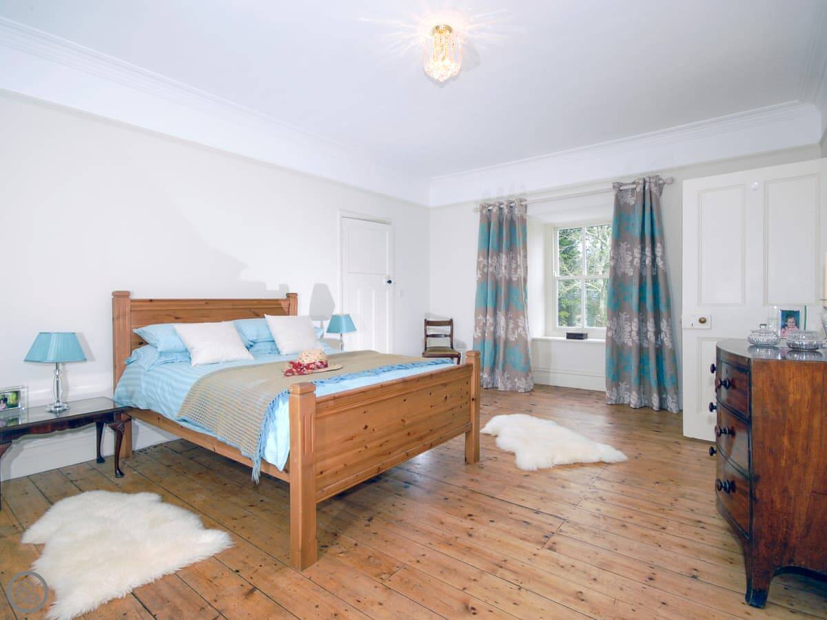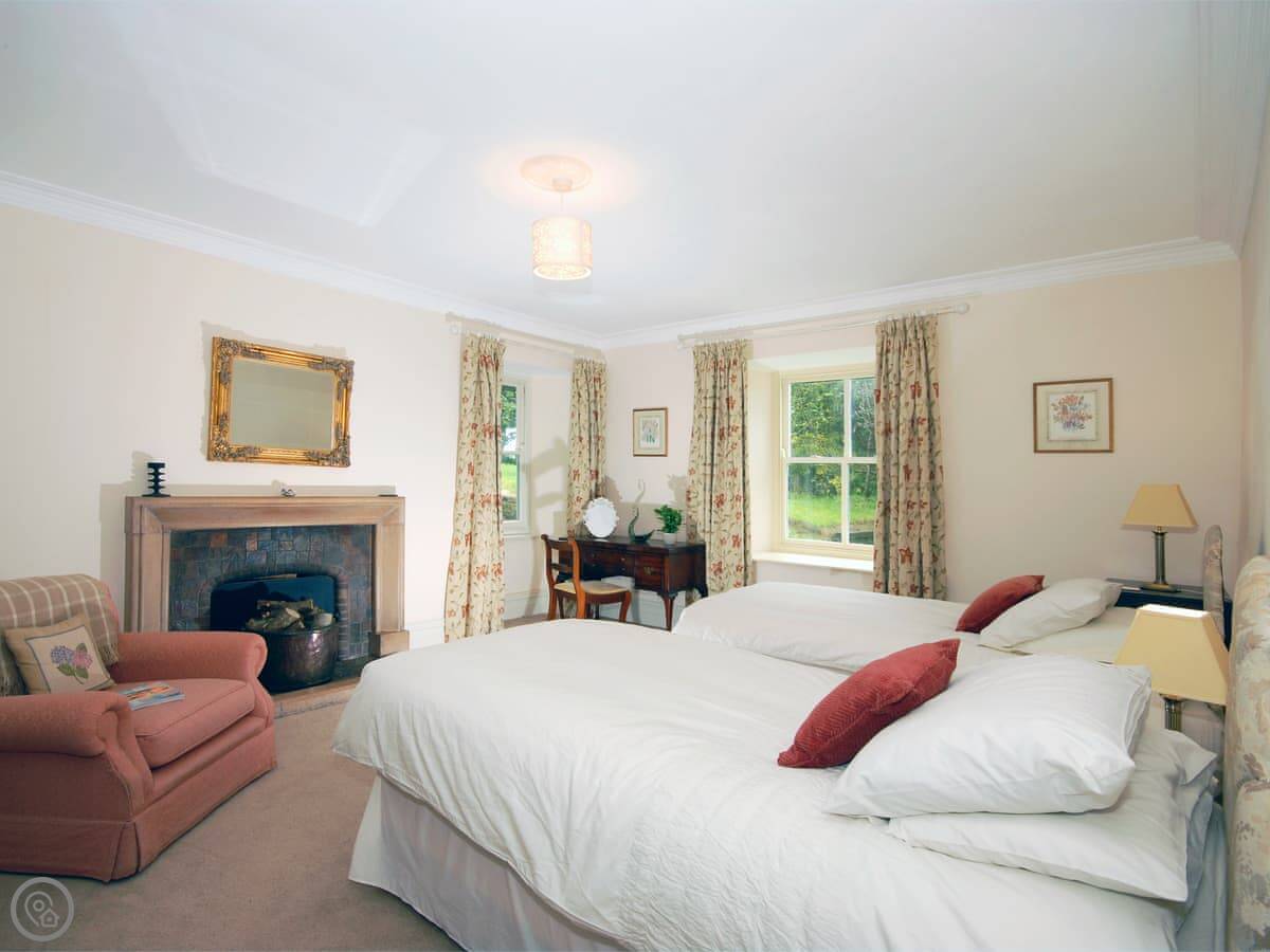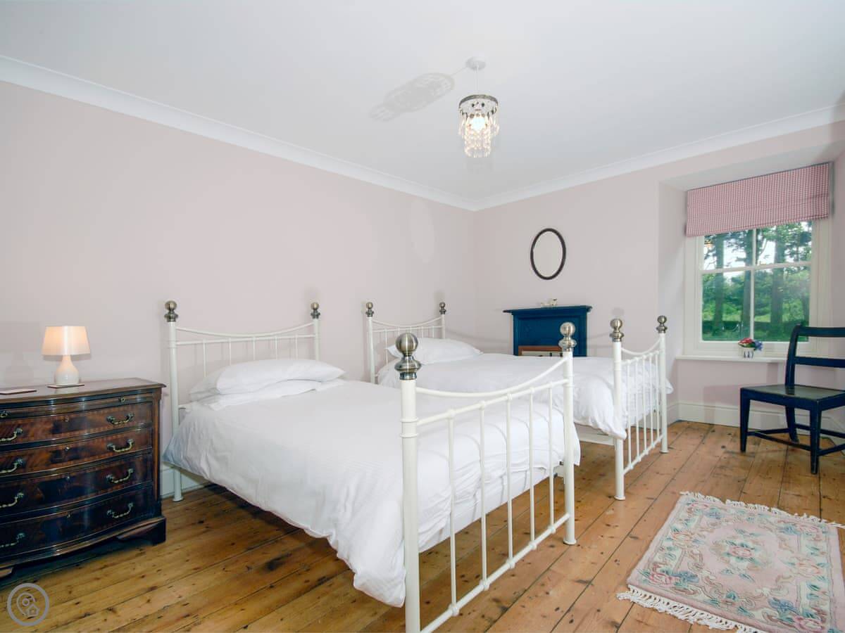 It sleeps ten people. There are five bedrooms and two bathrooms. One of the bedrooms is on the ground floor. The stairs are a proper turning staircase, quite grand. There's a stained glass window on the half landing. The place is furnished with a mix of old and new things, some local art.