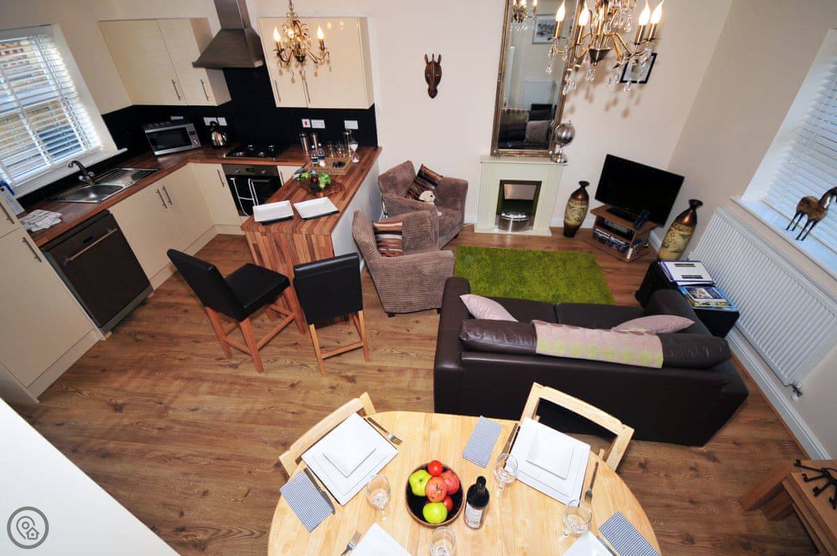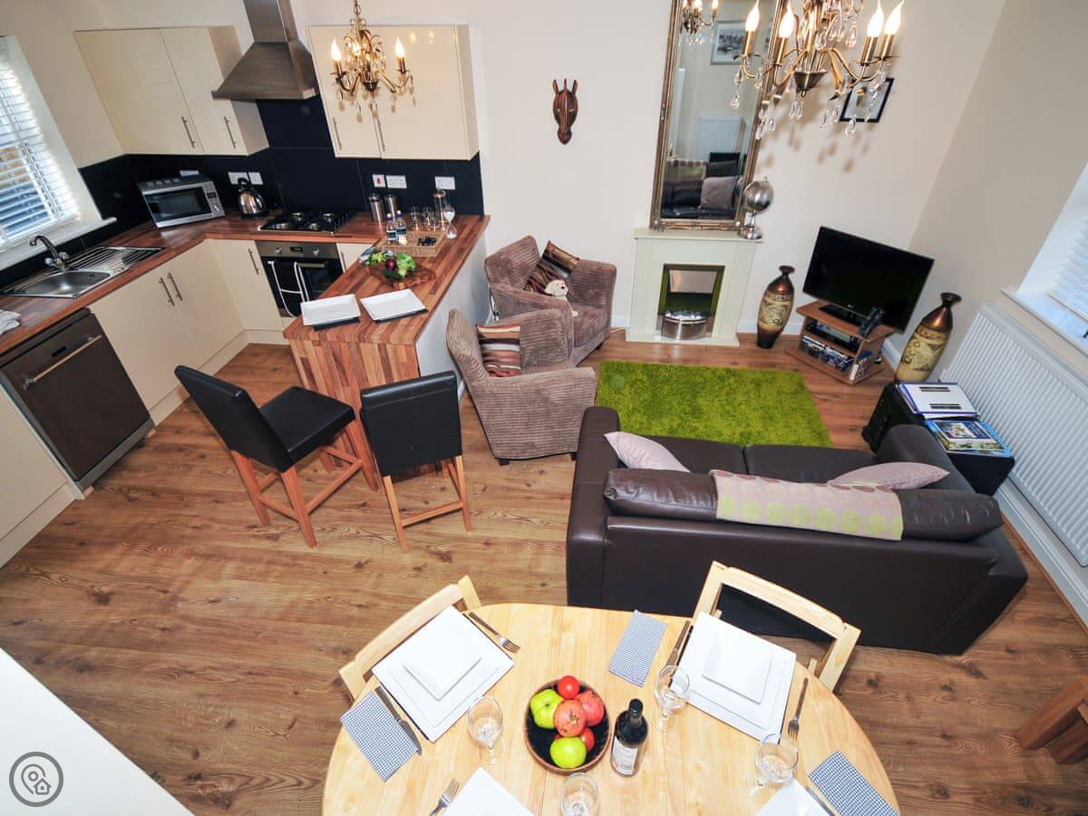 The bedrooms are on the first floor. There's Egyptian cotton bedding on the beds. Downstairs is all open plan, with a TV and a breakfast bar with stools. The chairs are a sort of corduroy.