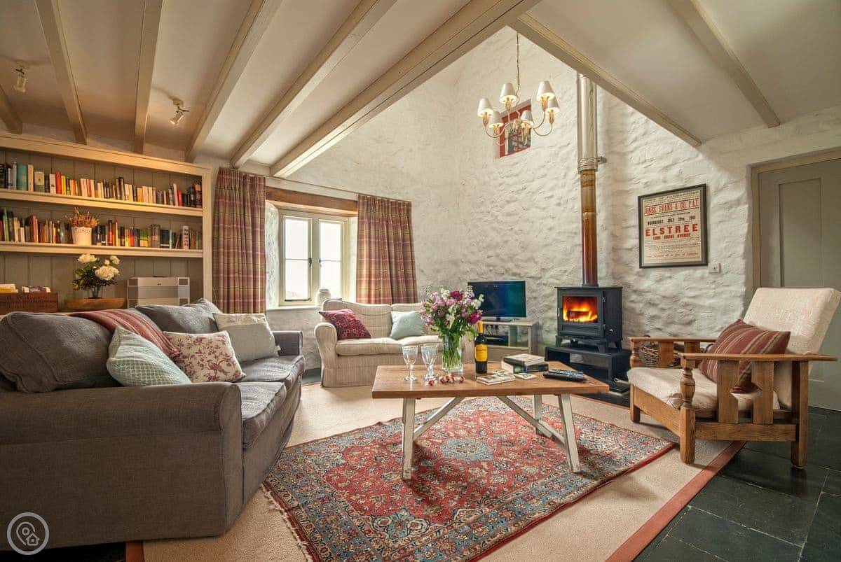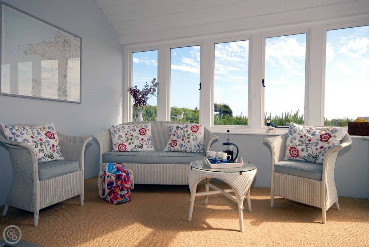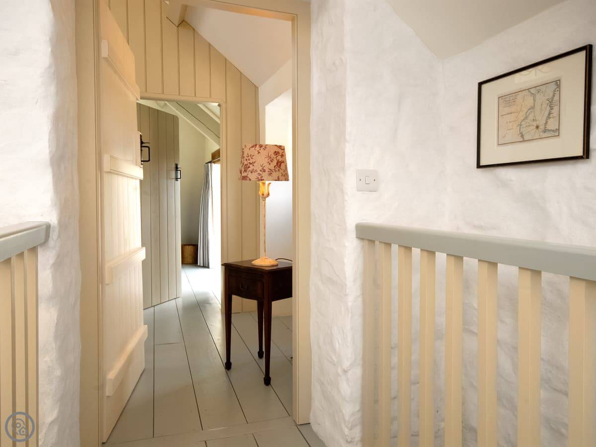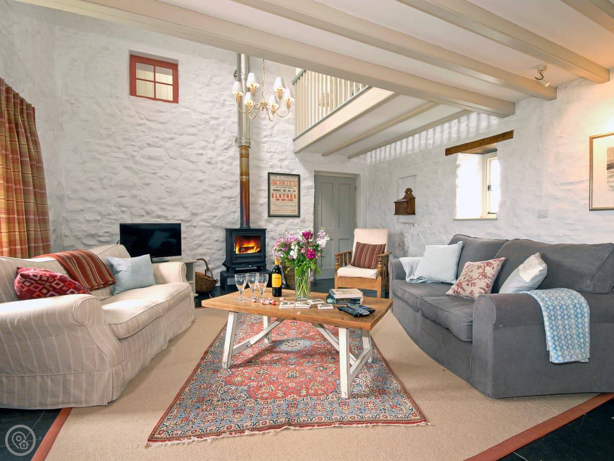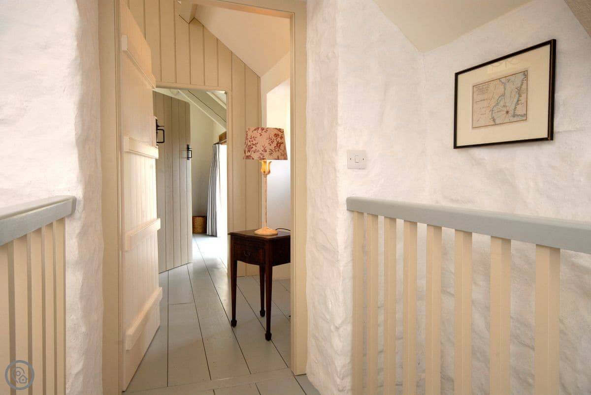 Set down a woodland drive on the edge of Solva, Carreg Wen is very stylishly furnished with an eclectic mix of antique and modern pieces and original art work. The open plan living space on the ground floor has a Welsh slate floor throughout, a luxury galley style kitchen and a living area with wood burner overlooked by a galleried landing with Welsh dresser, antique settle and Bose Air wave audio system . Opening out from the dining area is a small sun room with doors out onto the rear garden overlooking the bay, great for sun downers.