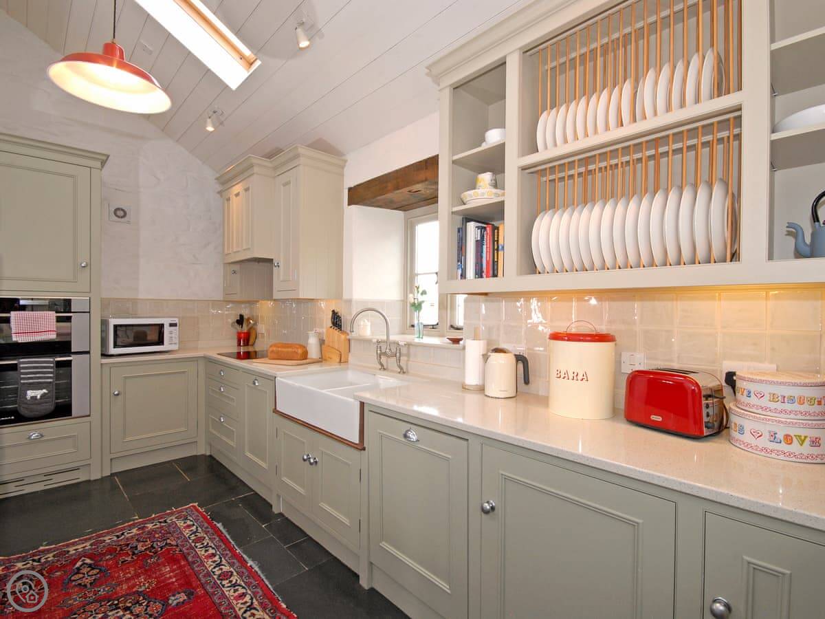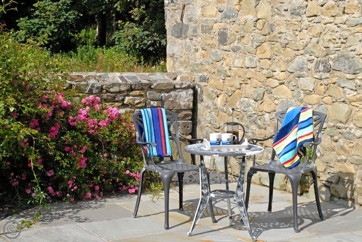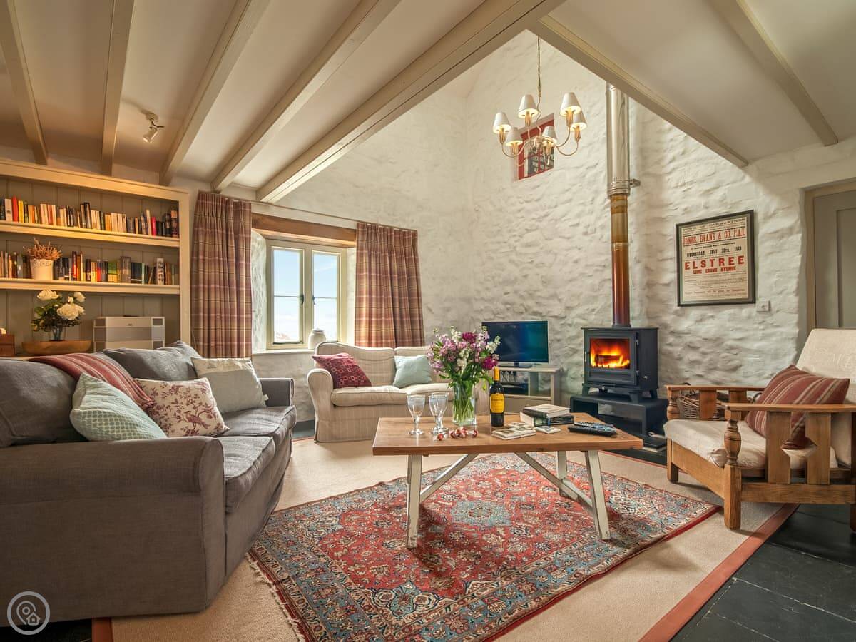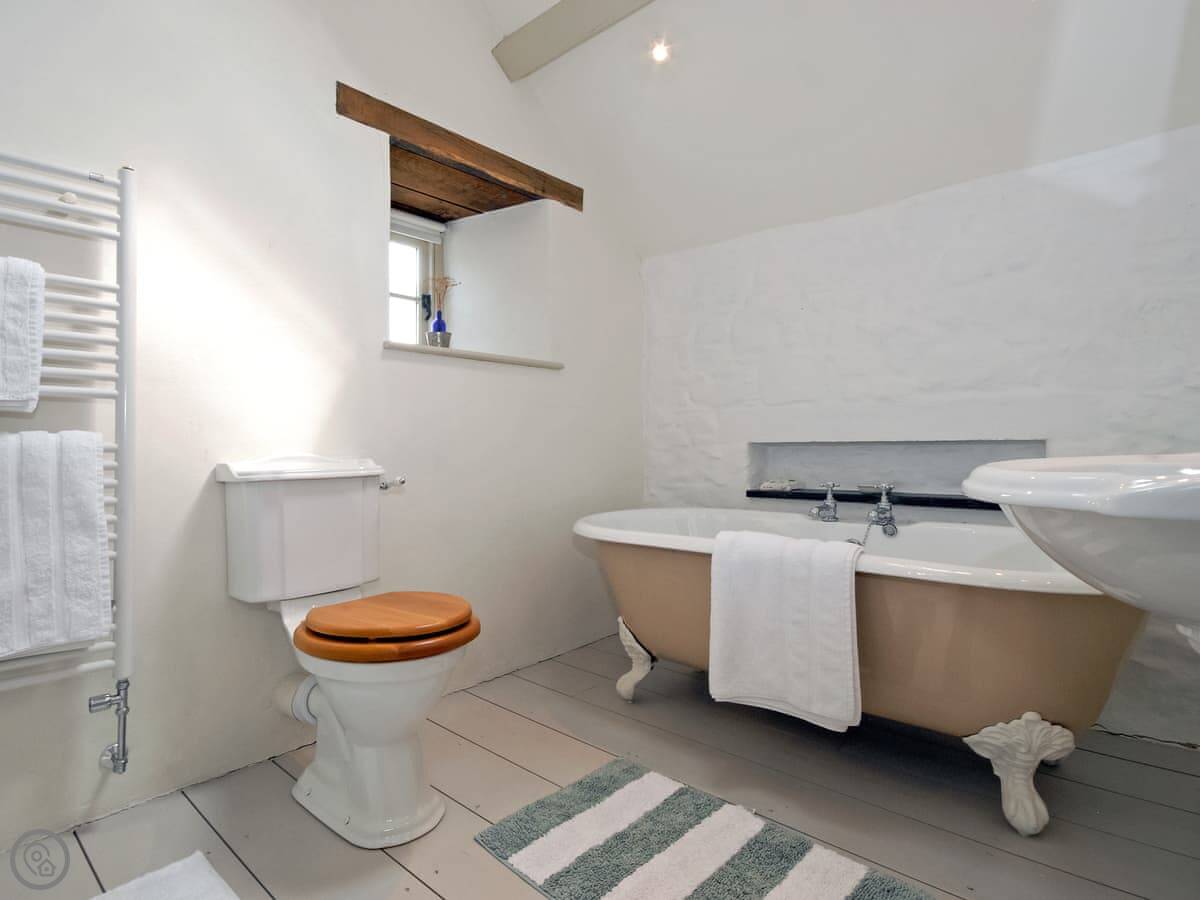 Set down a woodland drive on the edge of Solva, Carreg Wen is very stylishly furnished with an eclectic mix of antique and modern pieces and original art work. The open plan living space on the ground floor has a Welsh slate floor throughout, a luxury galley style kitchen and a living area with wood burner overlooked by a galleried landing with Welsh dresser, antique settle and Bose Air wave audio system . Opening out from the dining area is a small sun room with doors out onto the rear garden overlooking the bay, great for sun downers.