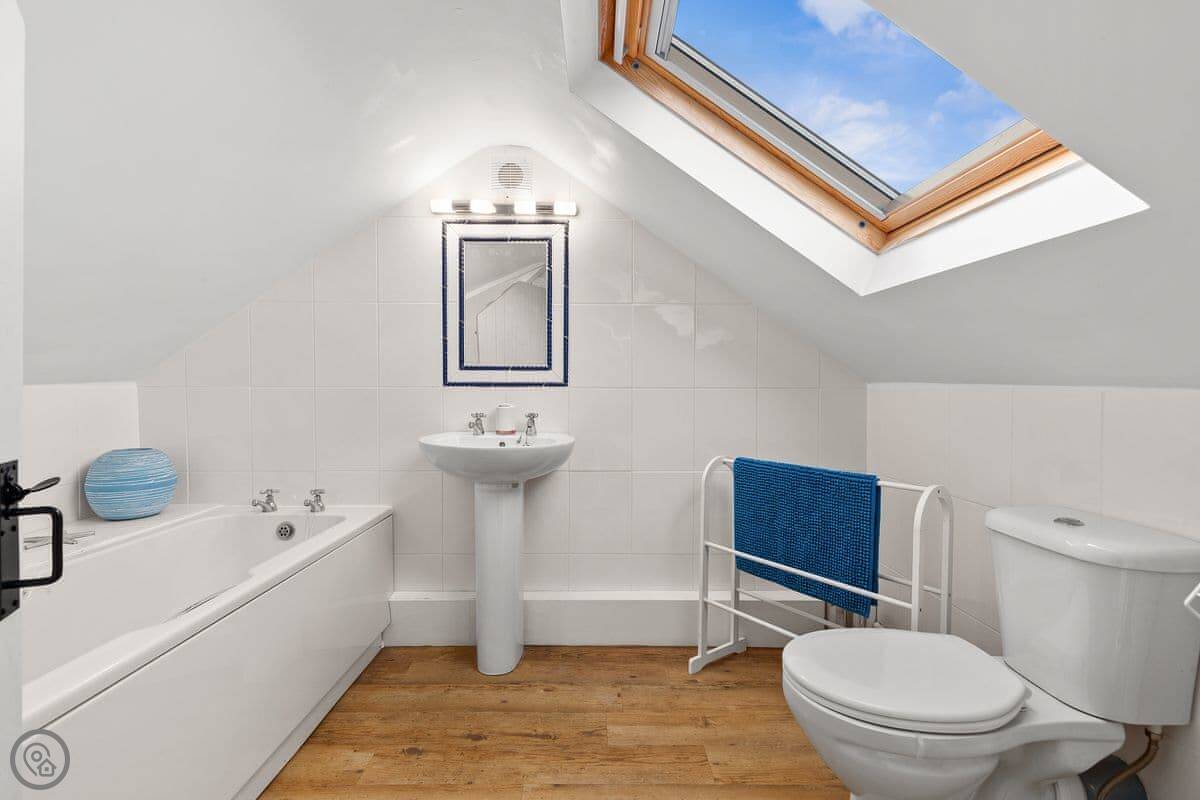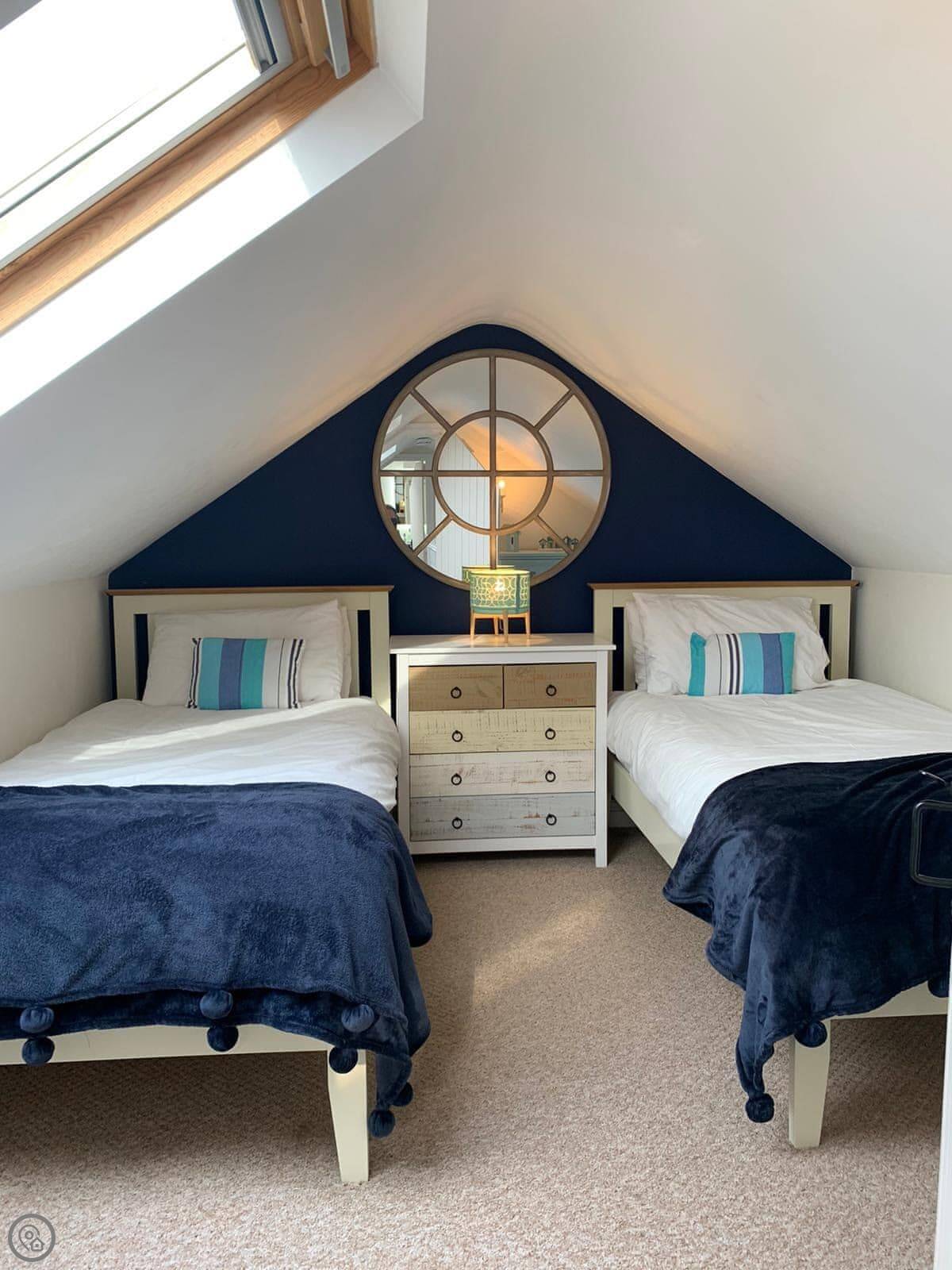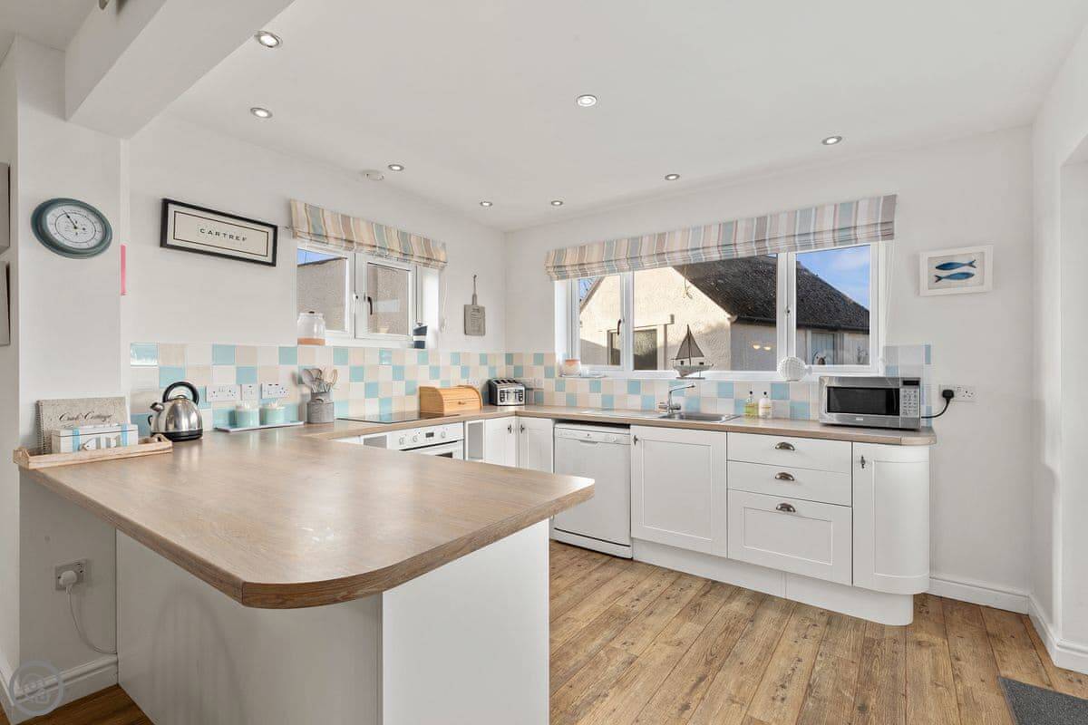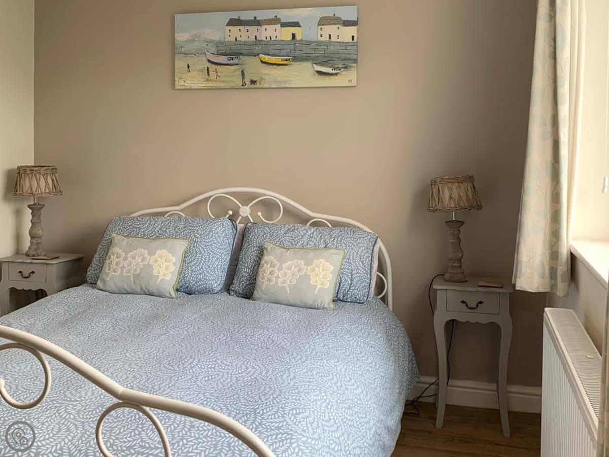 Crab Cottage is in Morfa Nefyn, right near the top of the Llŷn Peninsula. It's a detached house, so no one attached to either side. It sleeps six, with three bedrooms and two bathrooms. One bedroom and a shower room are on the ground floor, which might suit someone who doesn't want to do stairs. The other bathroom and a twin bedroom are upstairs.