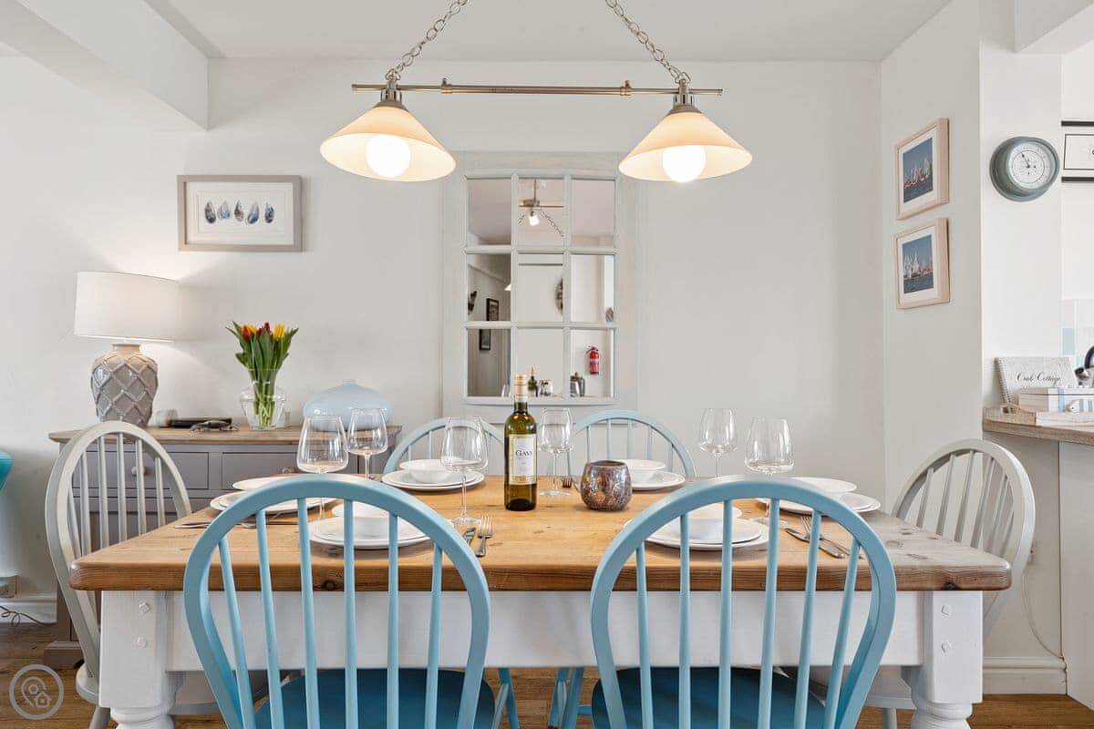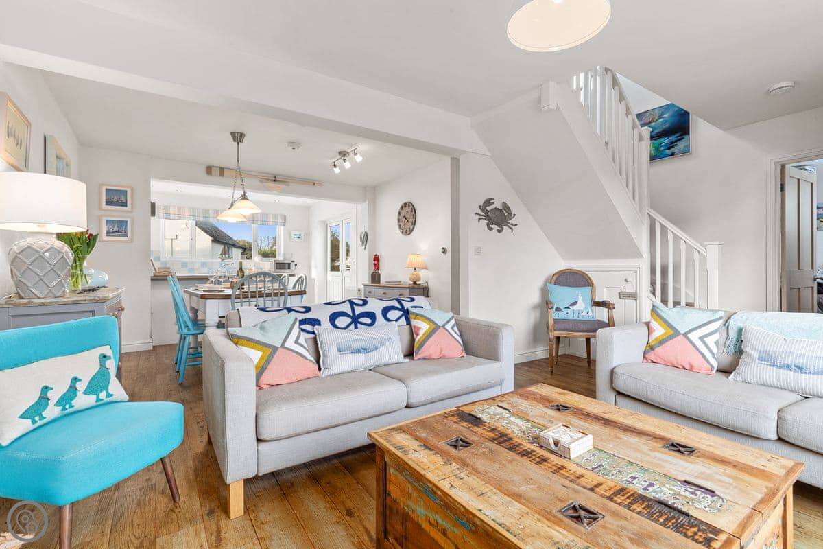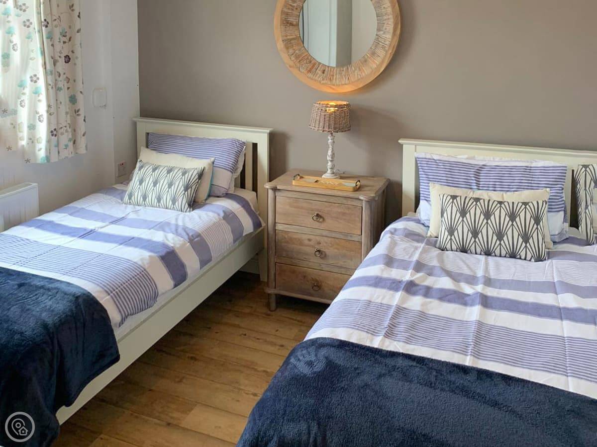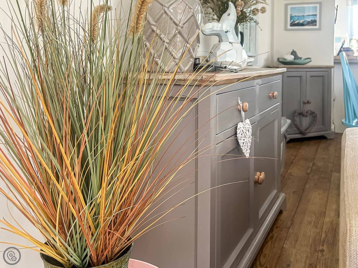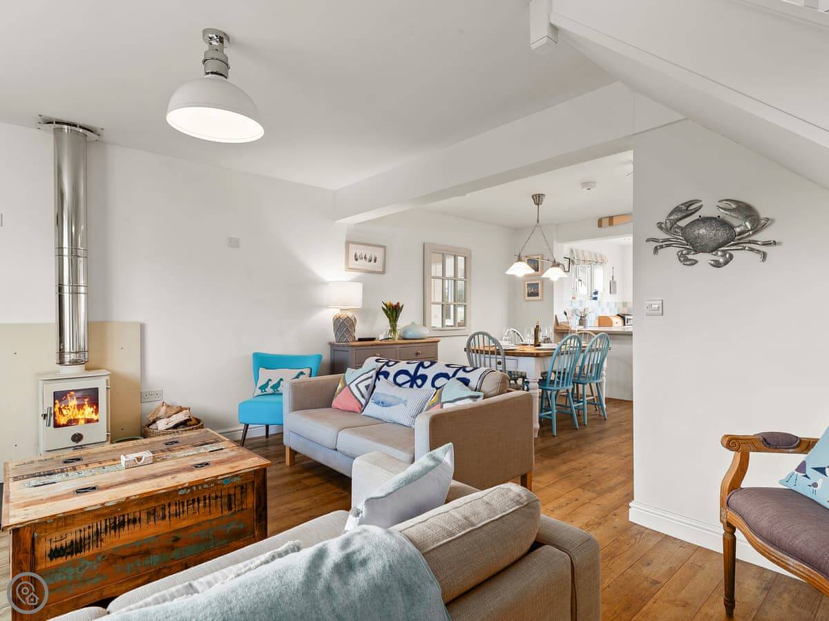 It's got a 4 Star rating. It's clean and comfortable. The decor has a seaside theme, with paintings and some blue paintwork. There's a woodburning stove in the living area for cooler evenings.