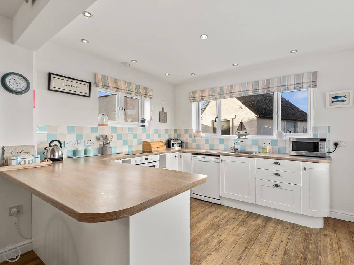 In terms of facilities, it's got what you'd need: a dishwasher, washing machine, TV, and WiFi. Bedding and towels are included. We can provide a cot and a highchair. No pets, sorry.