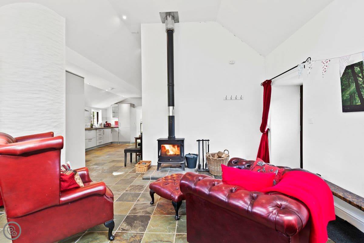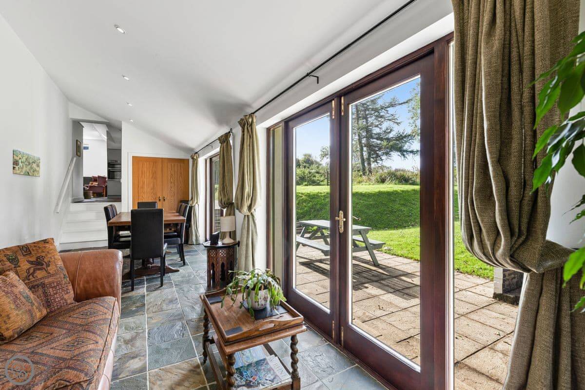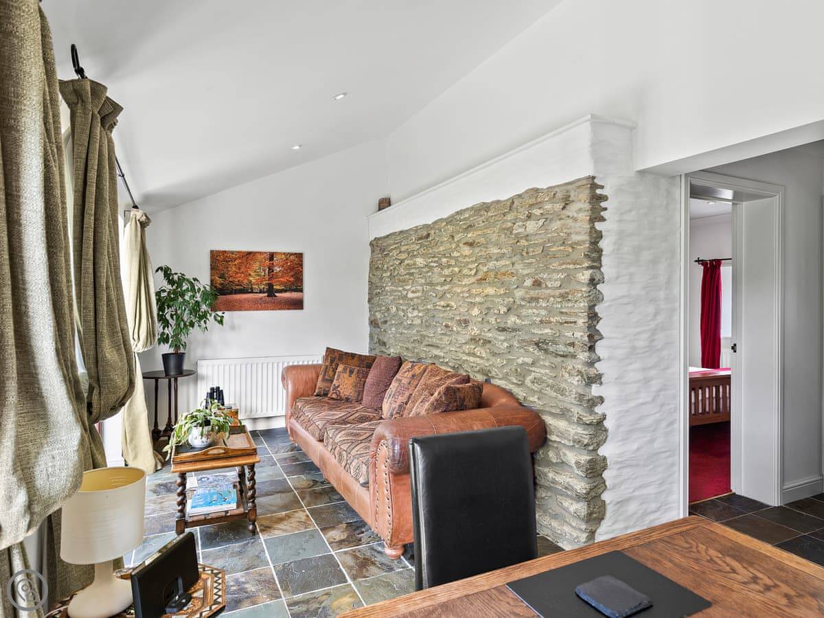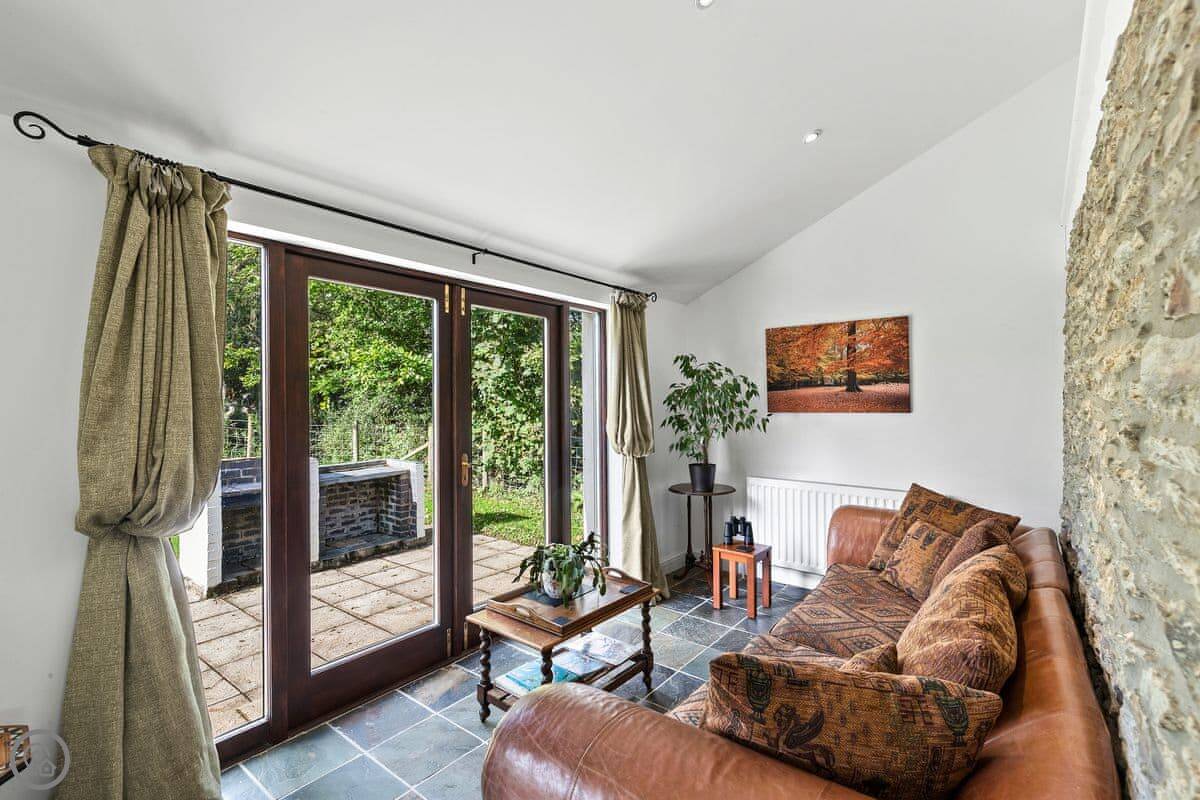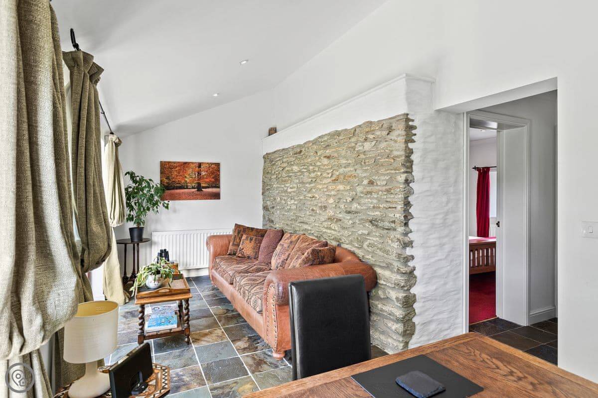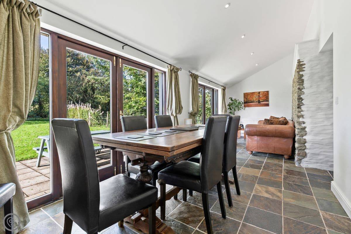 The main room is big, with a woodburner and French doors out to the garden. It's all one space, but the dining area is down five steps from the kitchen. The garden is enclosed, so it's safe for a dog or kids.