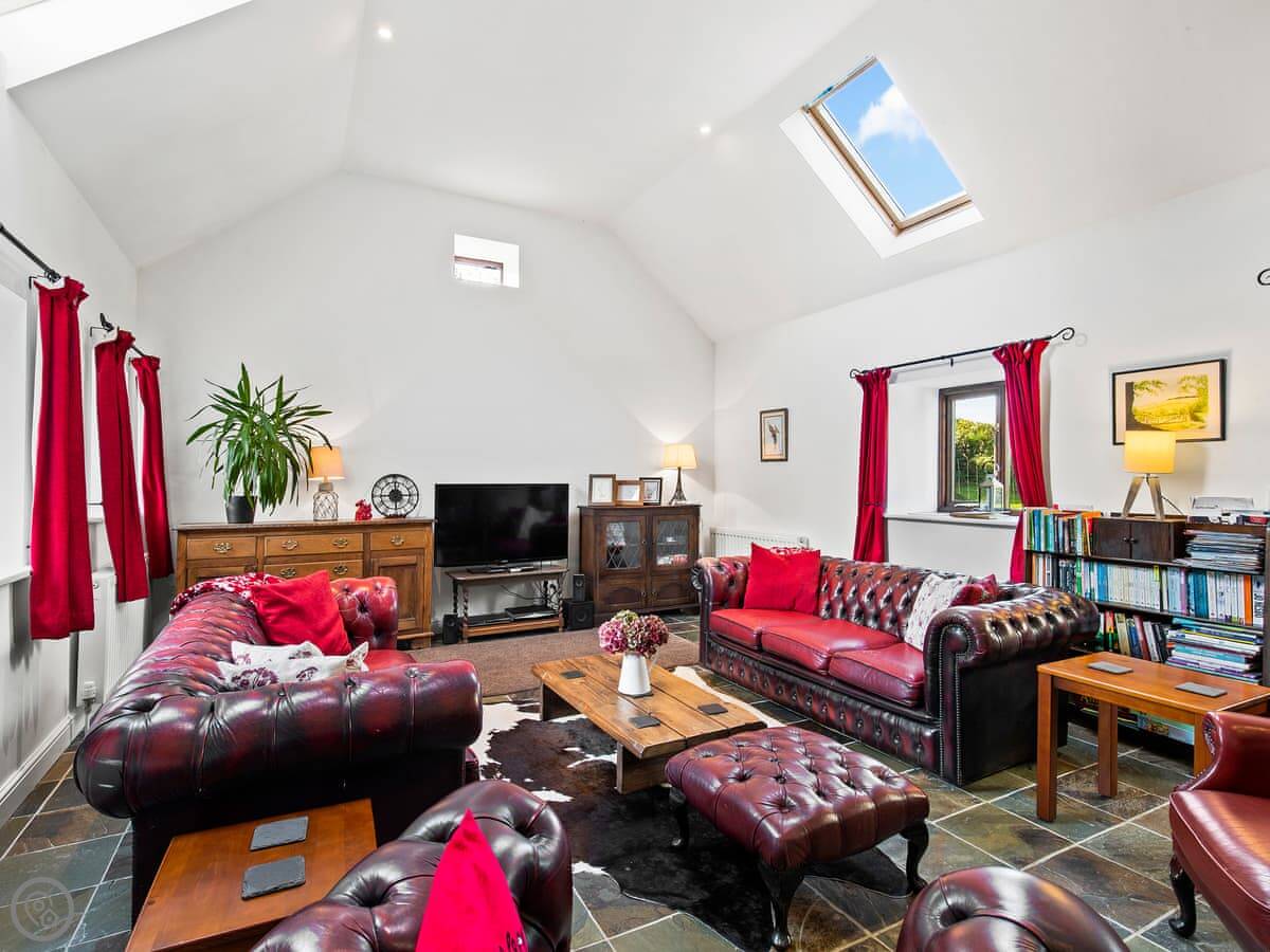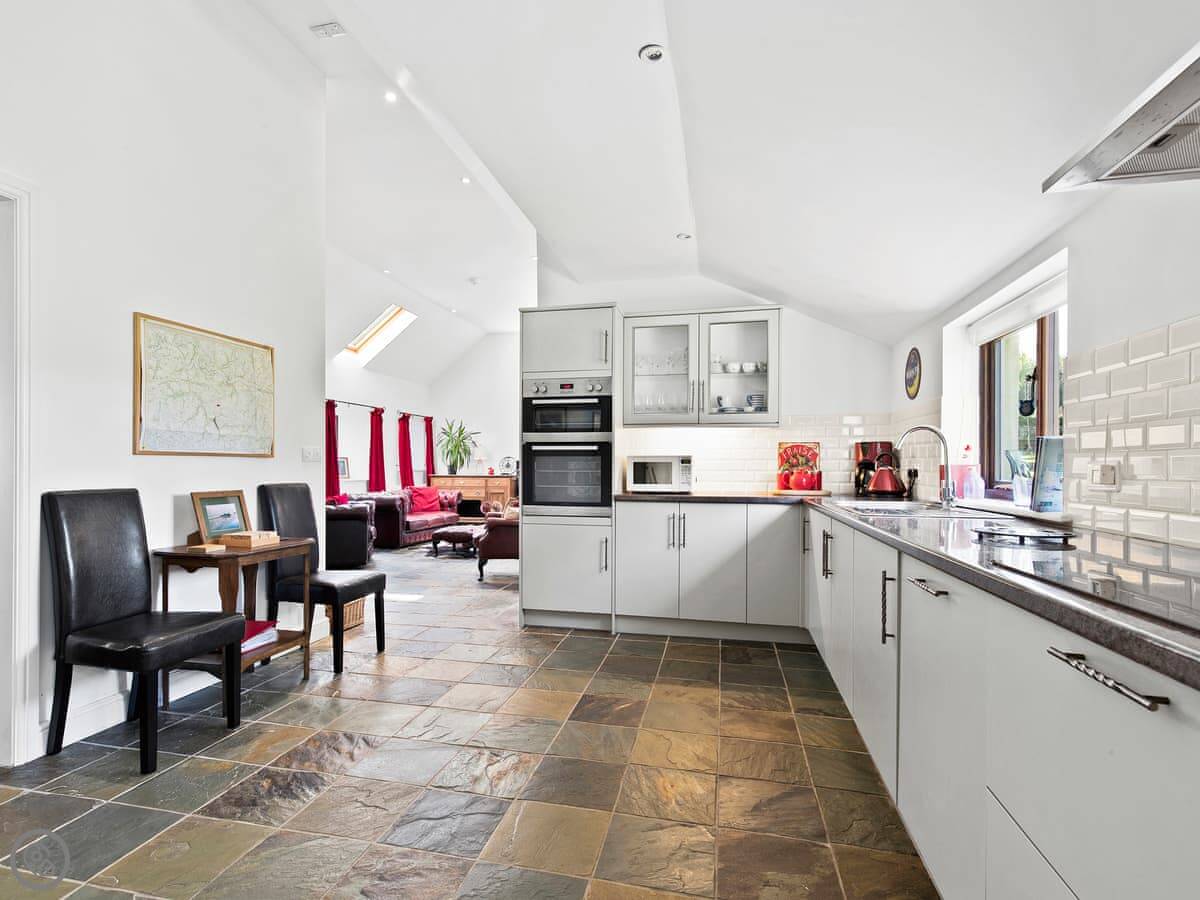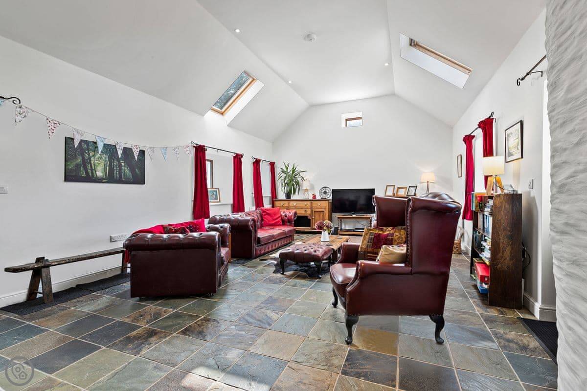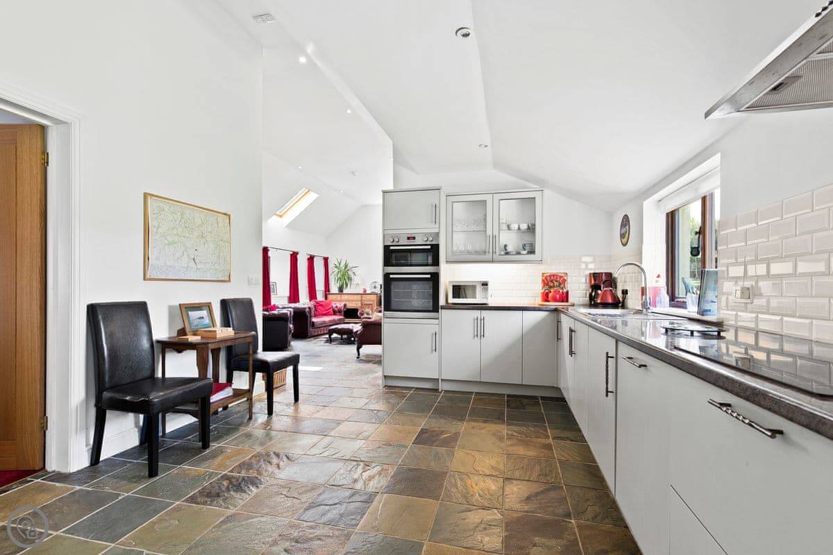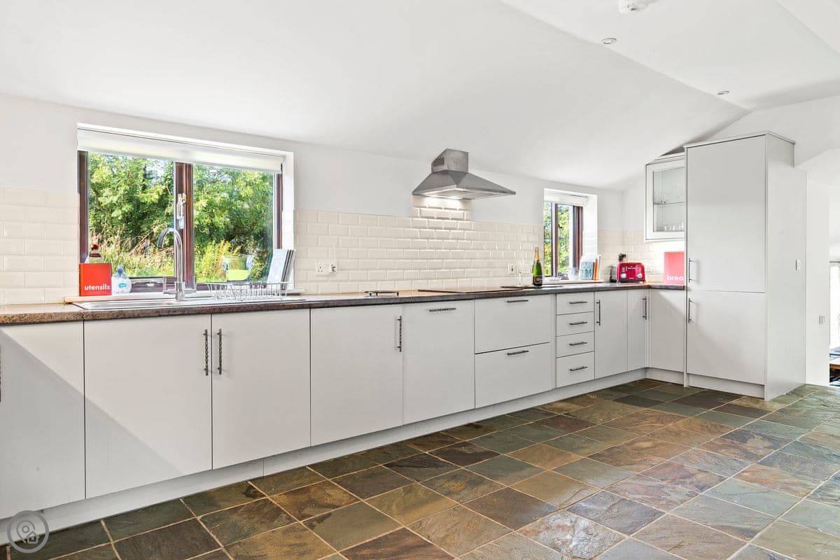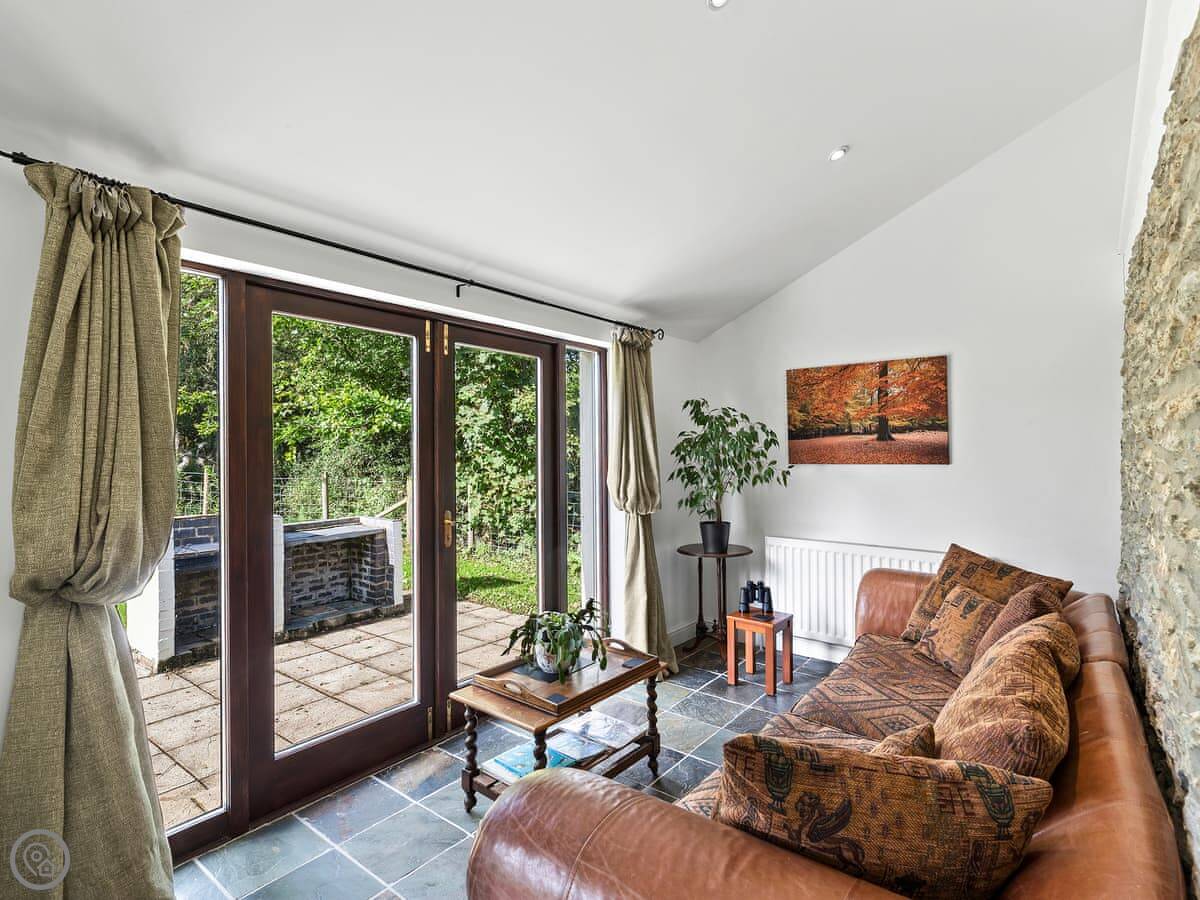 The main room is big, with a woodburner and French doors out to the garden. It's all one space, but the dining area is down five steps from the kitchen. The garden is enclosed, so it's safe for a dog or kids.