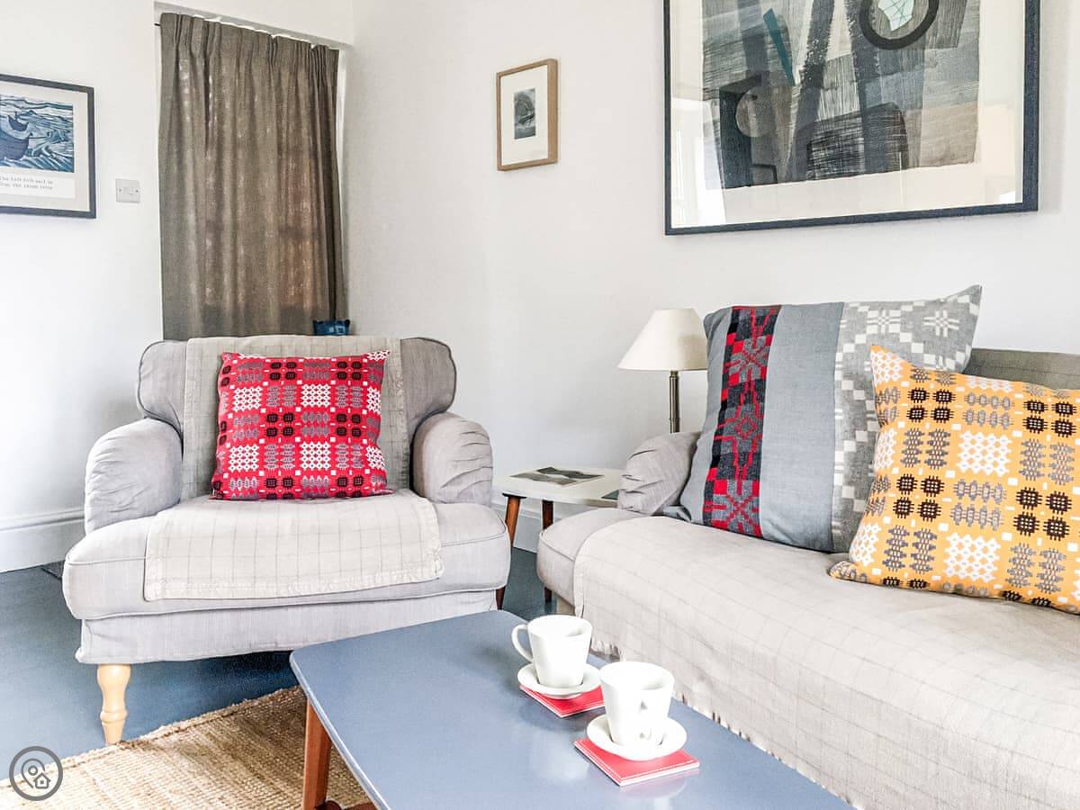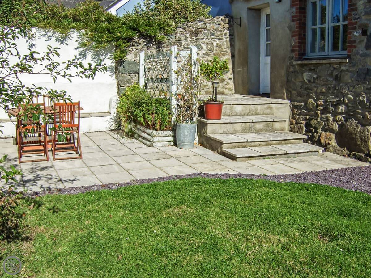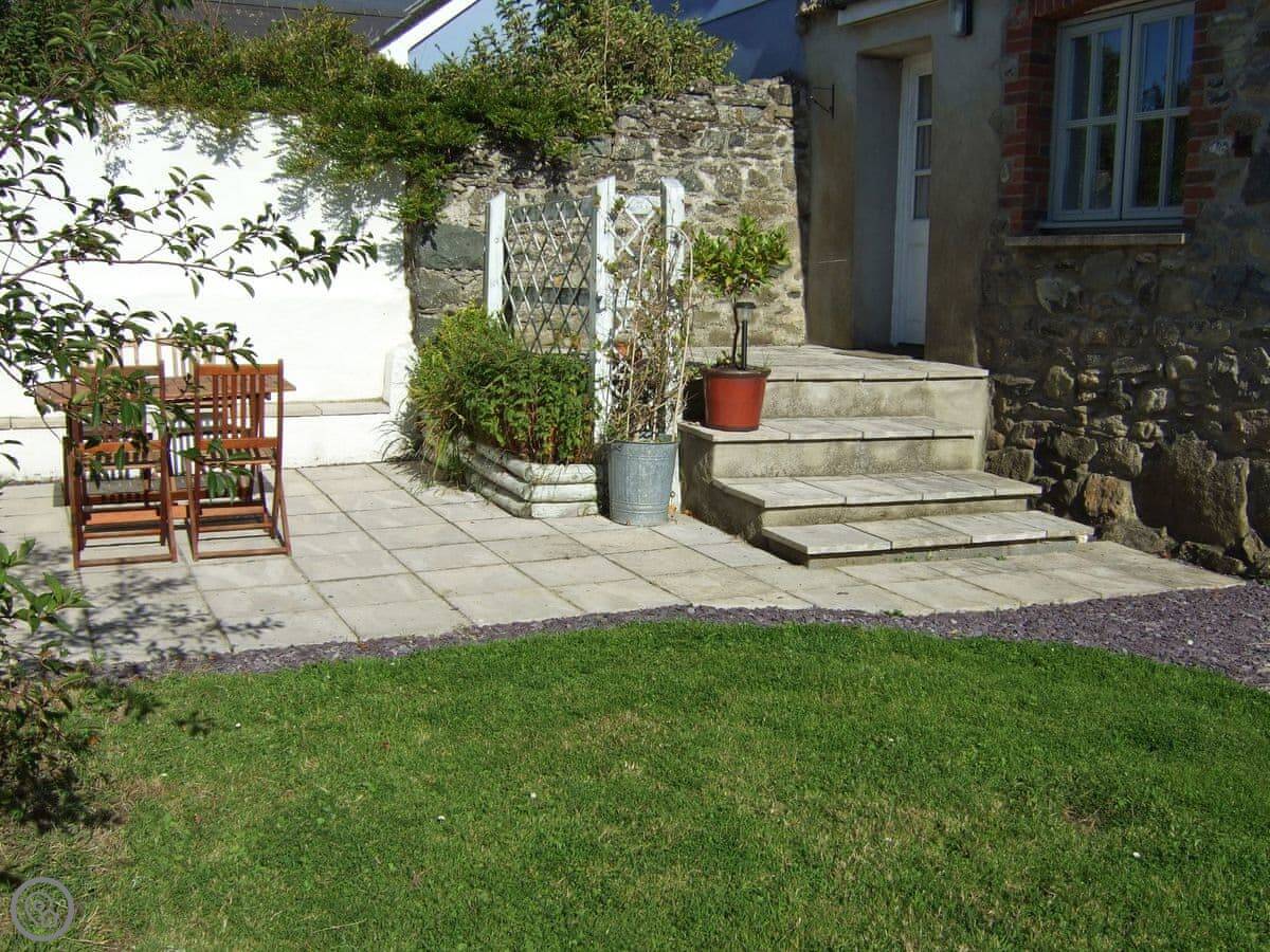 At the base of the Strumble Head Peninsula, with its white-washed lighthouse guarding the Irish Sea, this cottage is a perfect small rural retreat just for two . Warm, welcoming and comfortably furnished with beamed ceiling, a multi fuel stove to sit by and a mixture of modern and antique furniture the cottage is beside a private country lane in a row of five rural cottages, close to the pretty sleepy village of St Nicholas. A door from the sitting room opens out onto a small raised terrace with steps down to the secluded, enclosed private rear garden and patio- a sun trap.