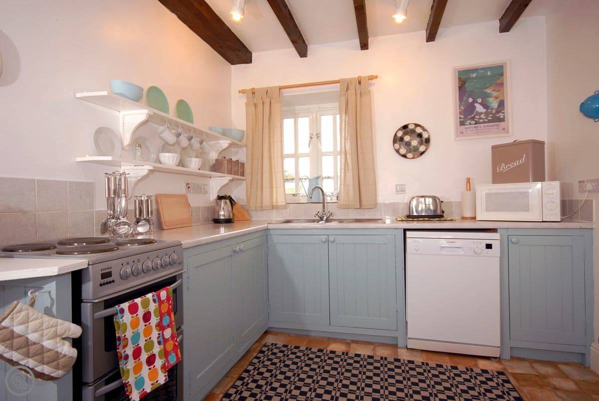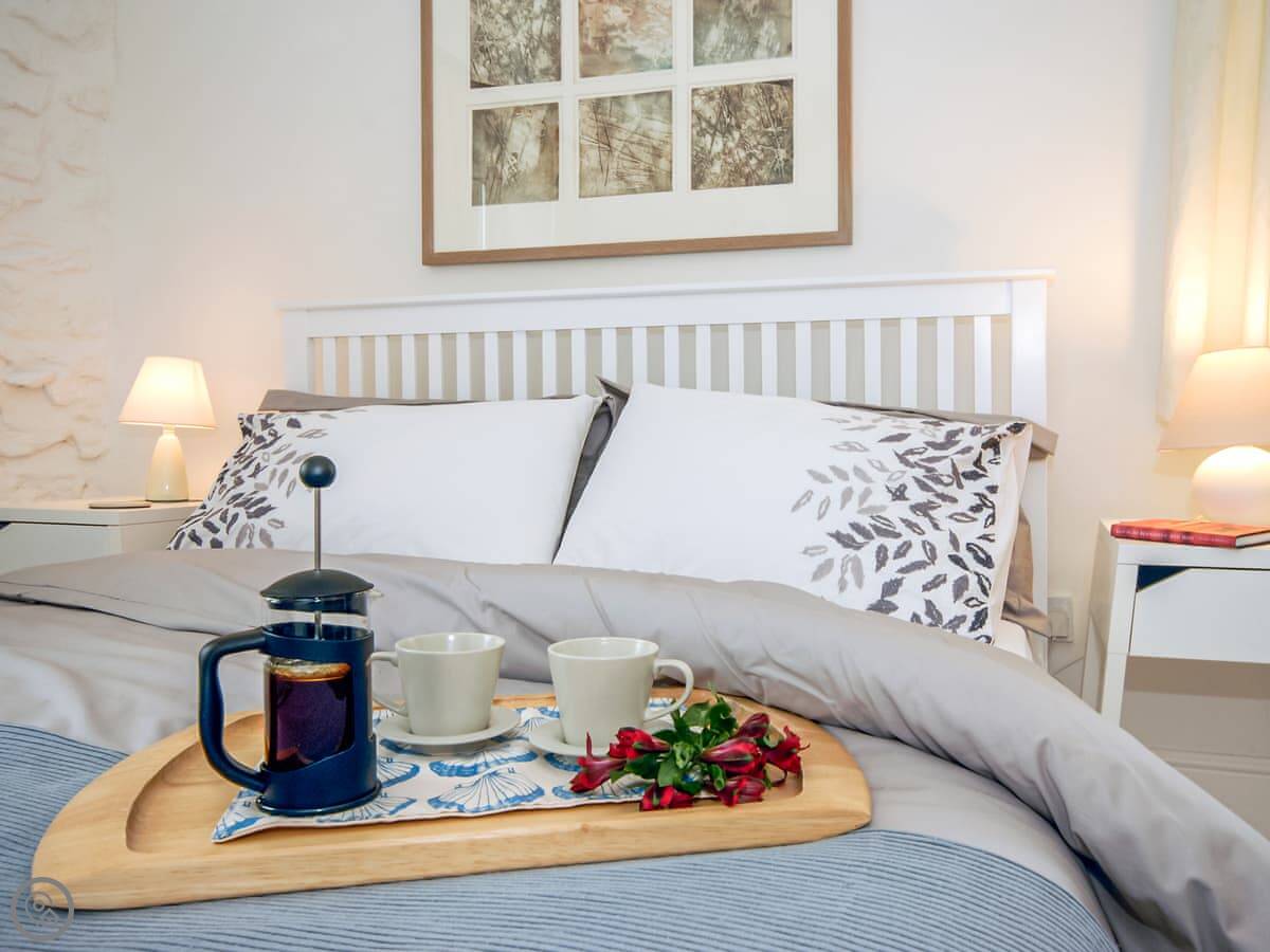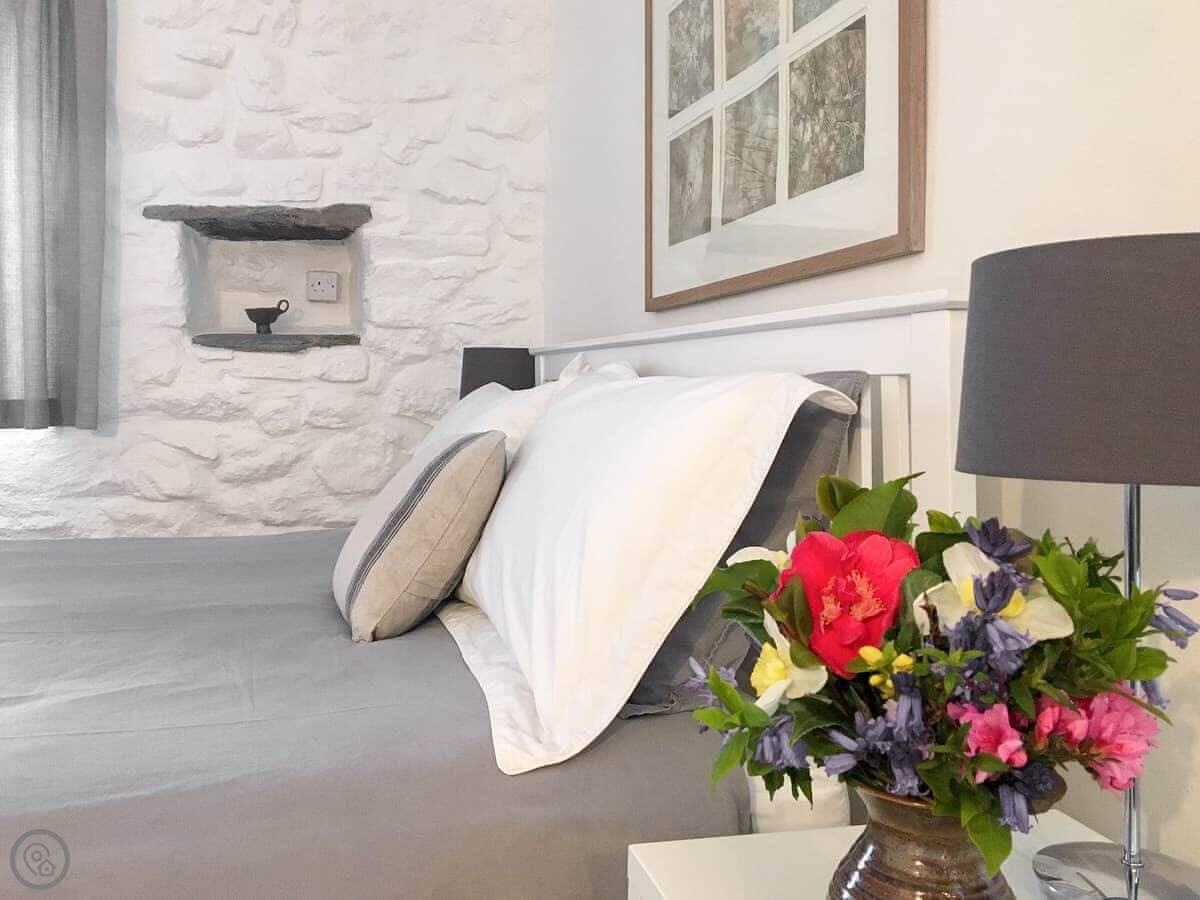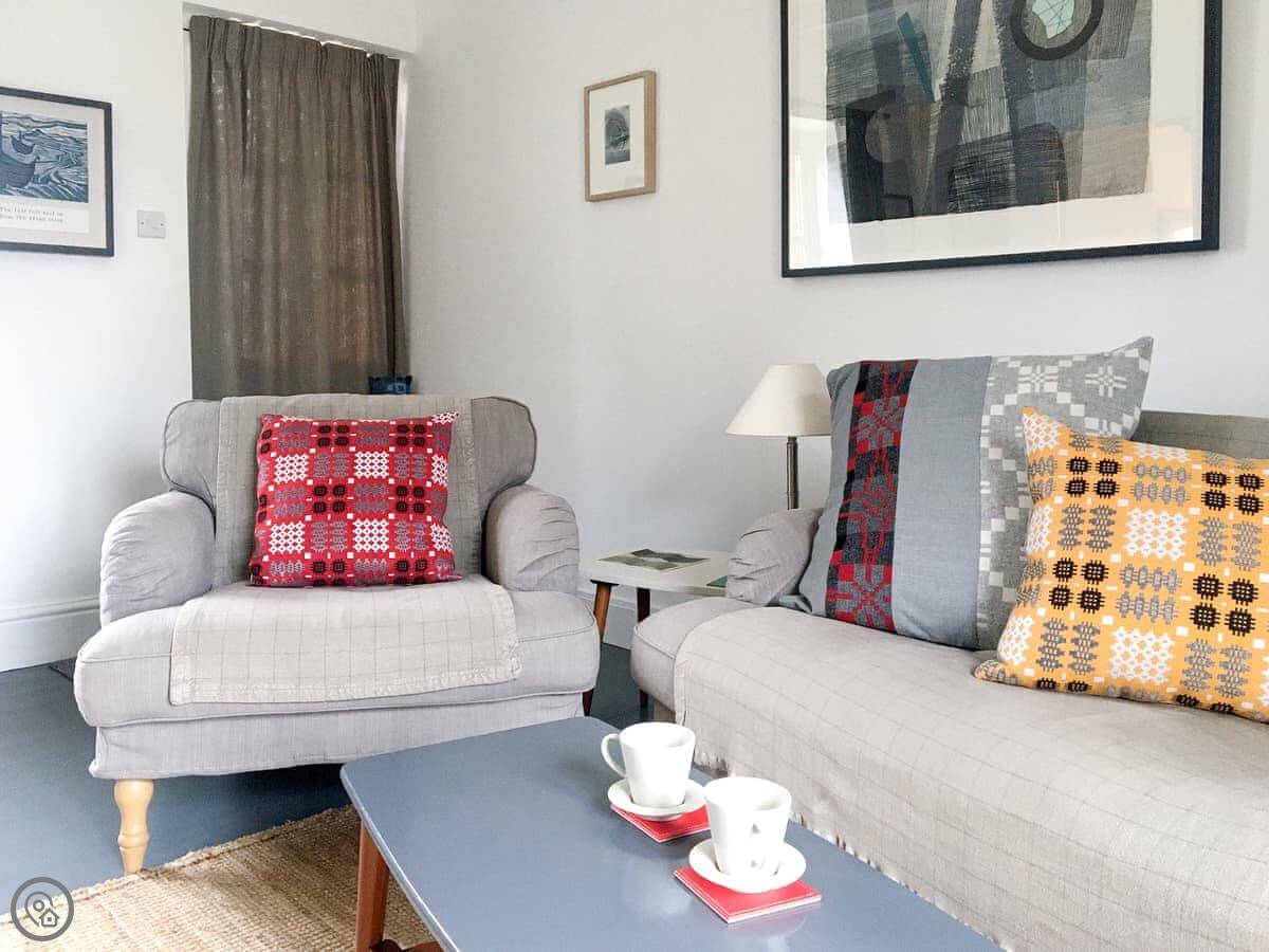 At the base of the Strumble Head Peninsula, with its white-washed lighthouse guarding the Irish Sea, this cottage is a perfect small rural retreat just for two . Warm, welcoming and comfortably furnished with beamed ceiling, a multi fuel stove to sit by and a mixture of modern and antique furniture the cottage is beside a private country lane in a row of five rural cottages, close to the pretty sleepy village of St Nicholas. A door from the sitting room opens out onto a small raised terrace with steps down to the secluded, enclosed private rear garden and patio- a sun trap.