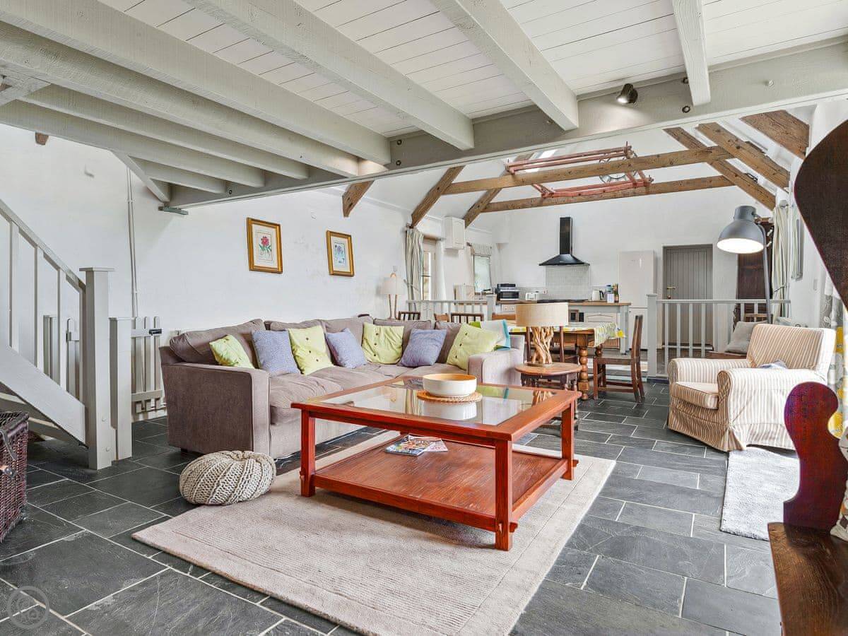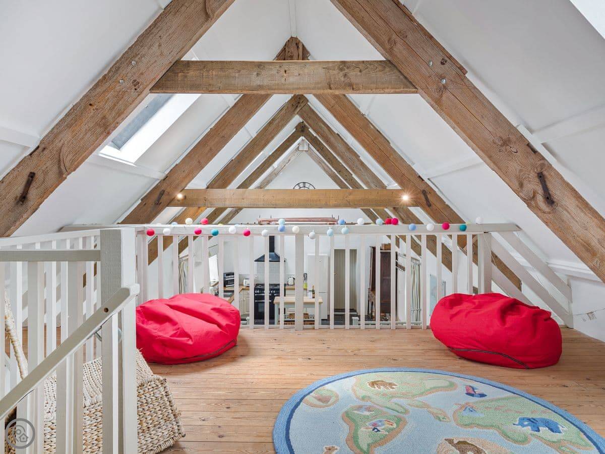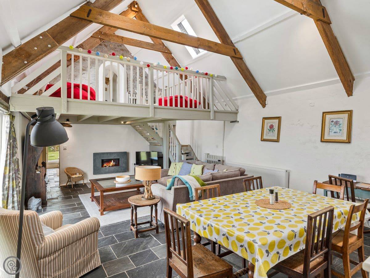 You've got an open plan living area downstairs. Up a flight of stairs there's a mezzanine level with some extra seating if someone wants a bit of space.