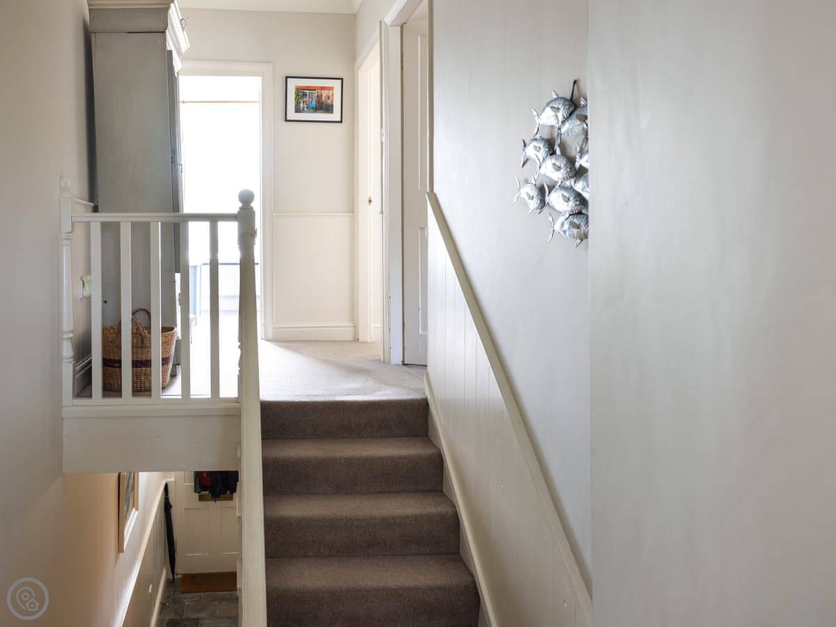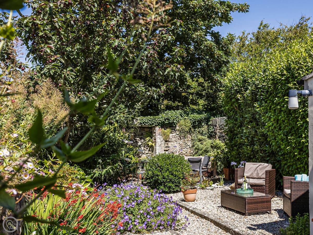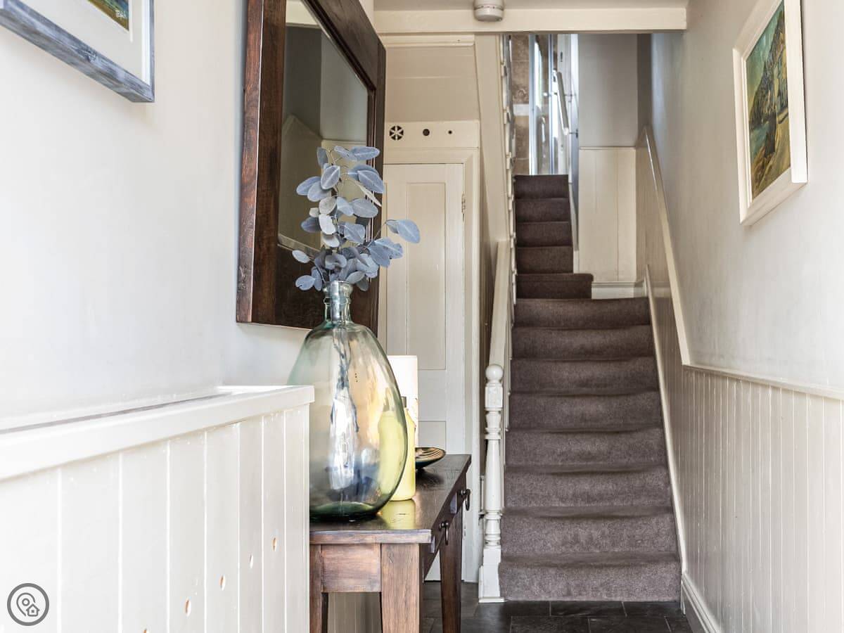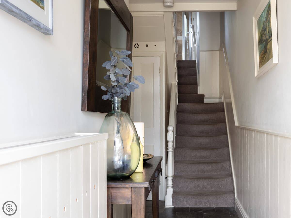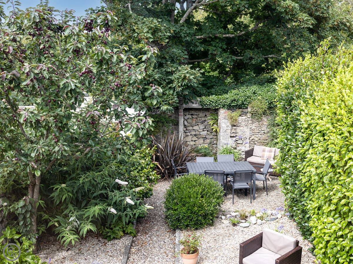 The stairs are fairly typical for a cottage, so mind your head on the way up. The garden is a small, walled courtyard. It gets the sun in the afternoon and is quite sheltered from the wind.
