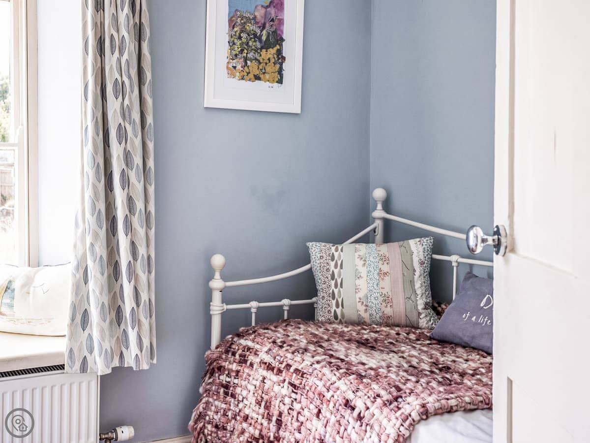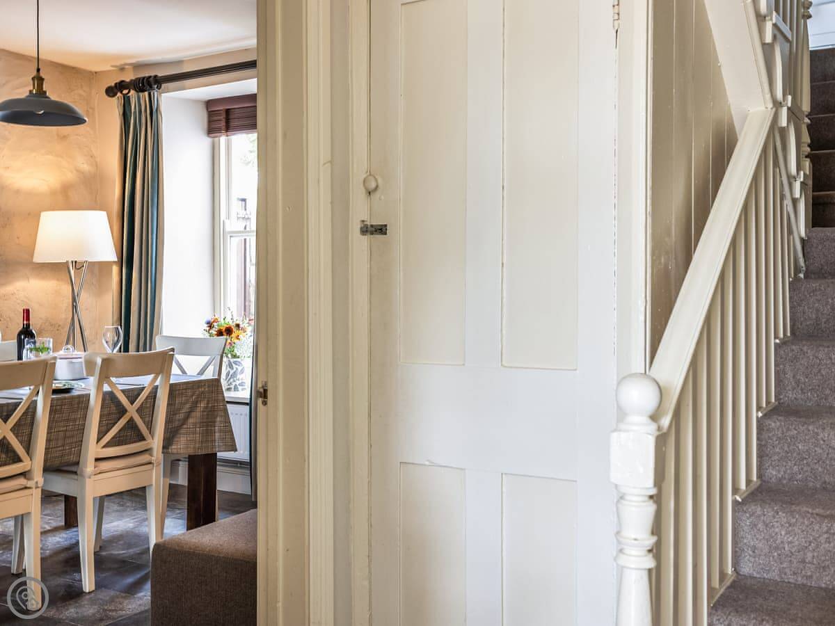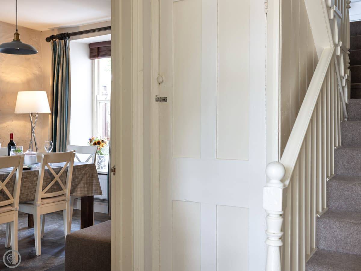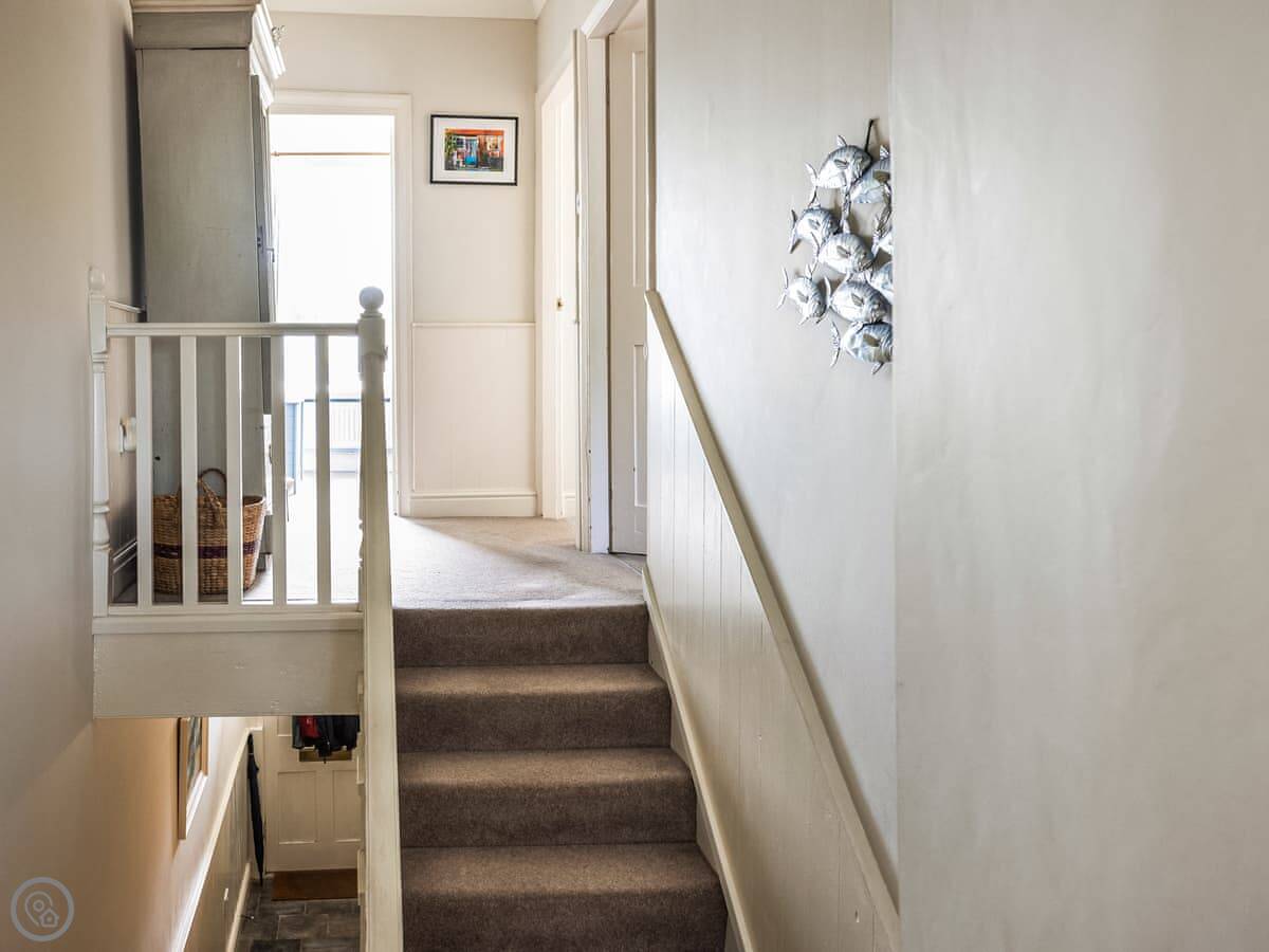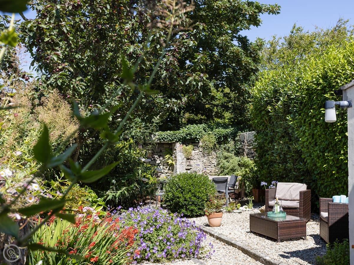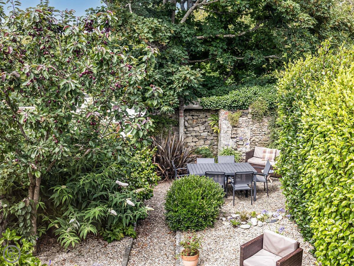 The stairs are fairly typical for a cottage, so mind your head on the way up. The garden is a small, walled courtyard. It gets the sun in the afternoon and is quite sheltered from the wind.