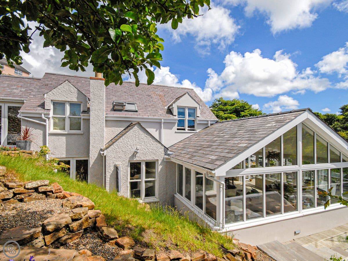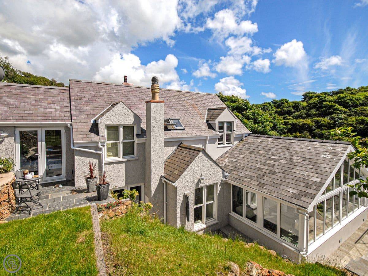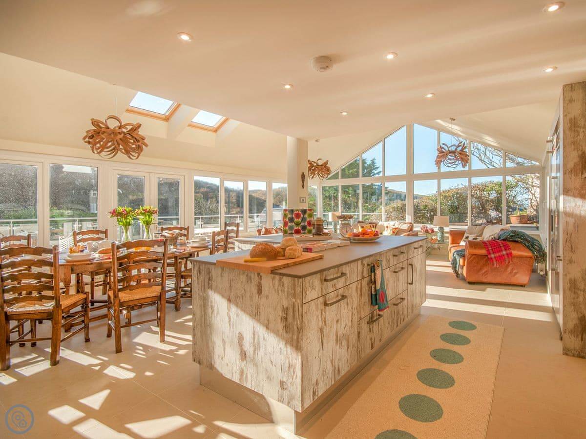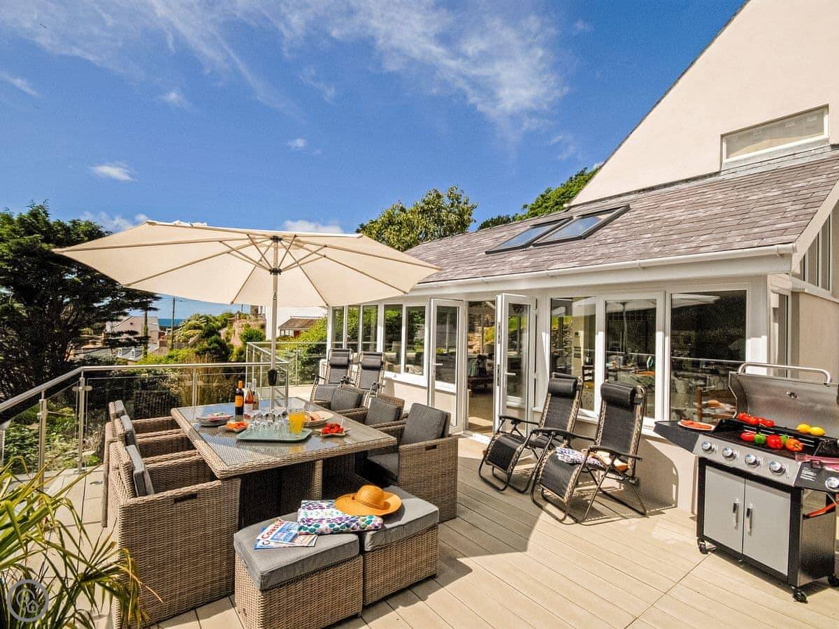 Inside, it's all very spacious and well done up. It's a 5 Star place, which means it's comfortable and has everything. There are five bathrooms, so nobody's queueing. The kitchen is big and opens out through French doors onto a decked terrace. You can see a sliver of the sea from there. The garden is steep and terraced.