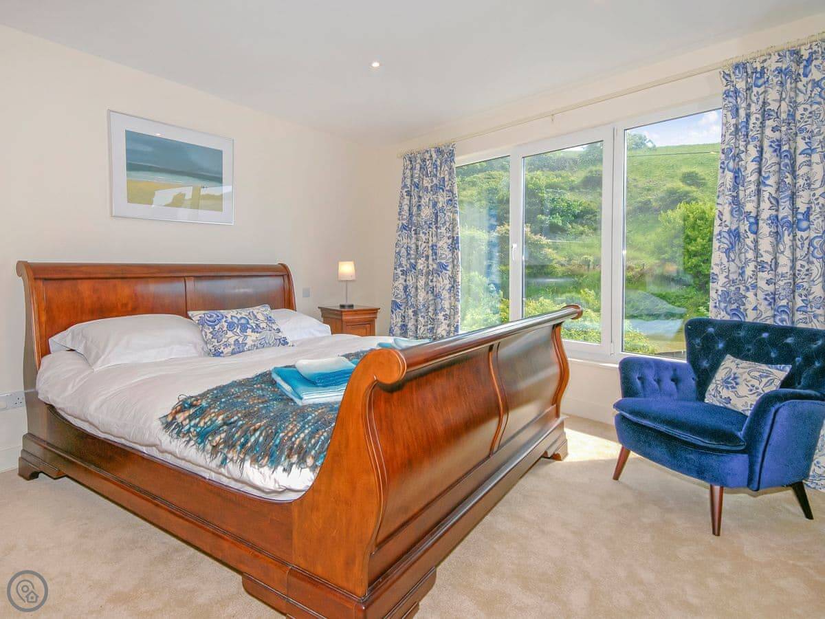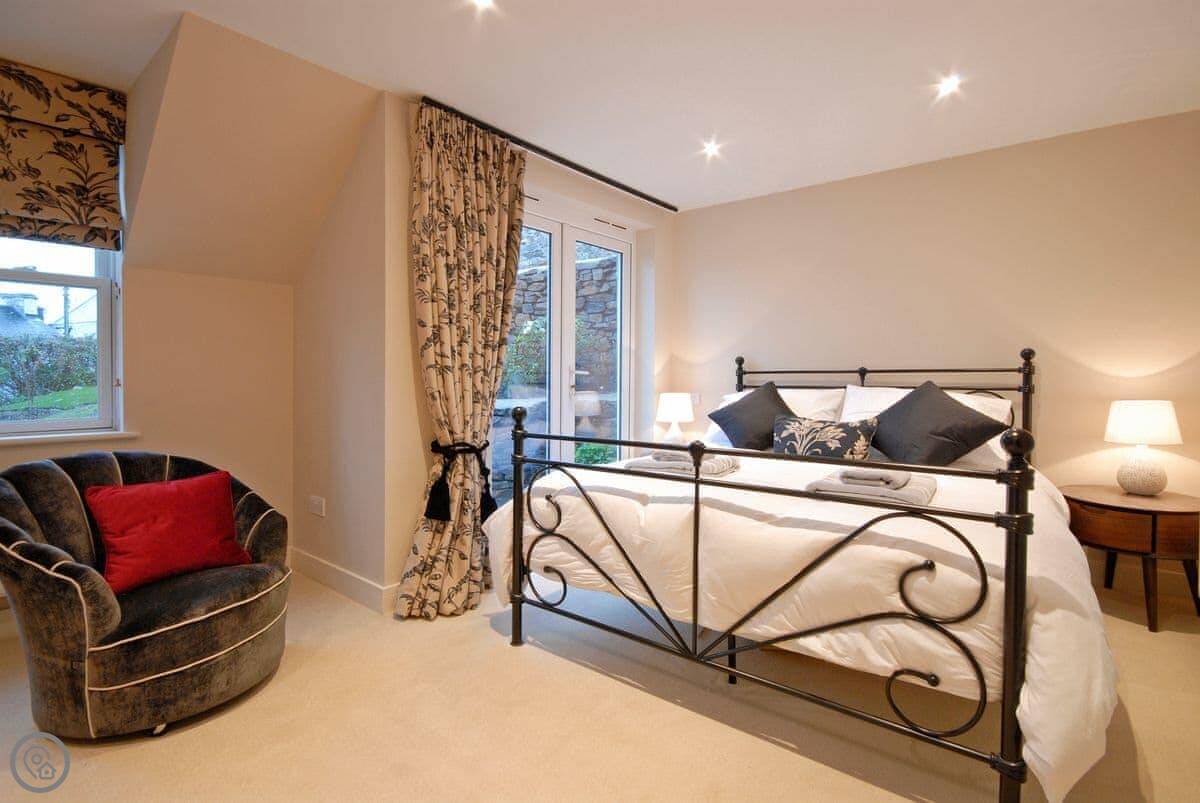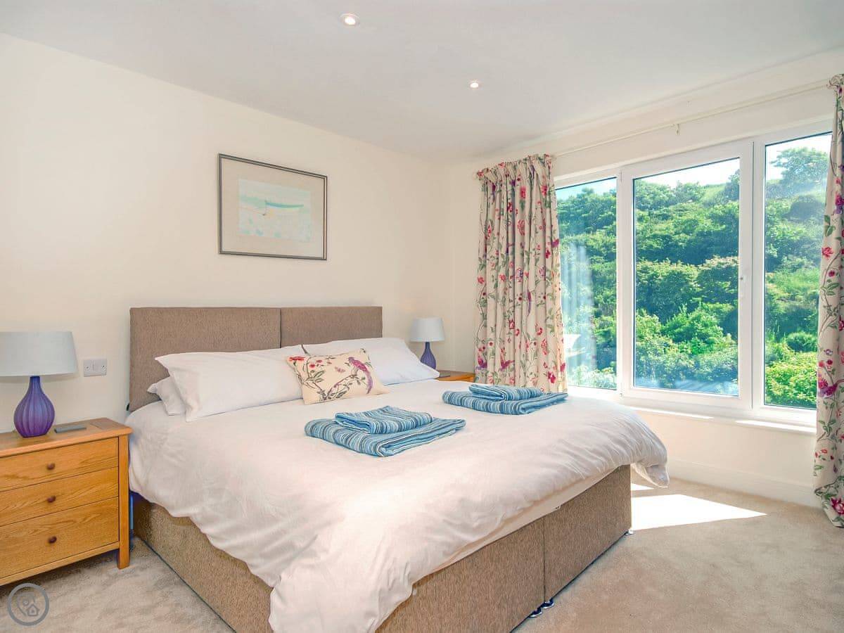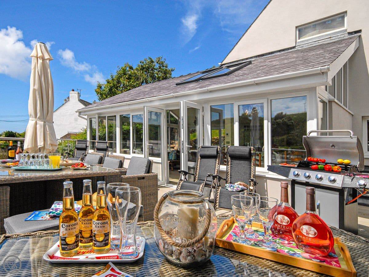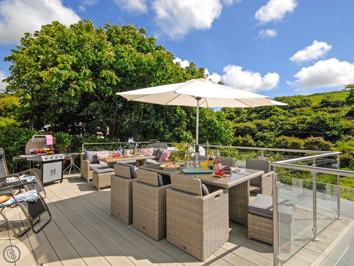 Inside, it's all very spacious and well done up. It's a 5 Star place, which means it's comfortable and has everything. There are five bathrooms, so nobody's queueing. The kitchen is big and opens out through French doors onto a decked terrace. You can see a sliver of the sea from there. The garden is steep and terraced.