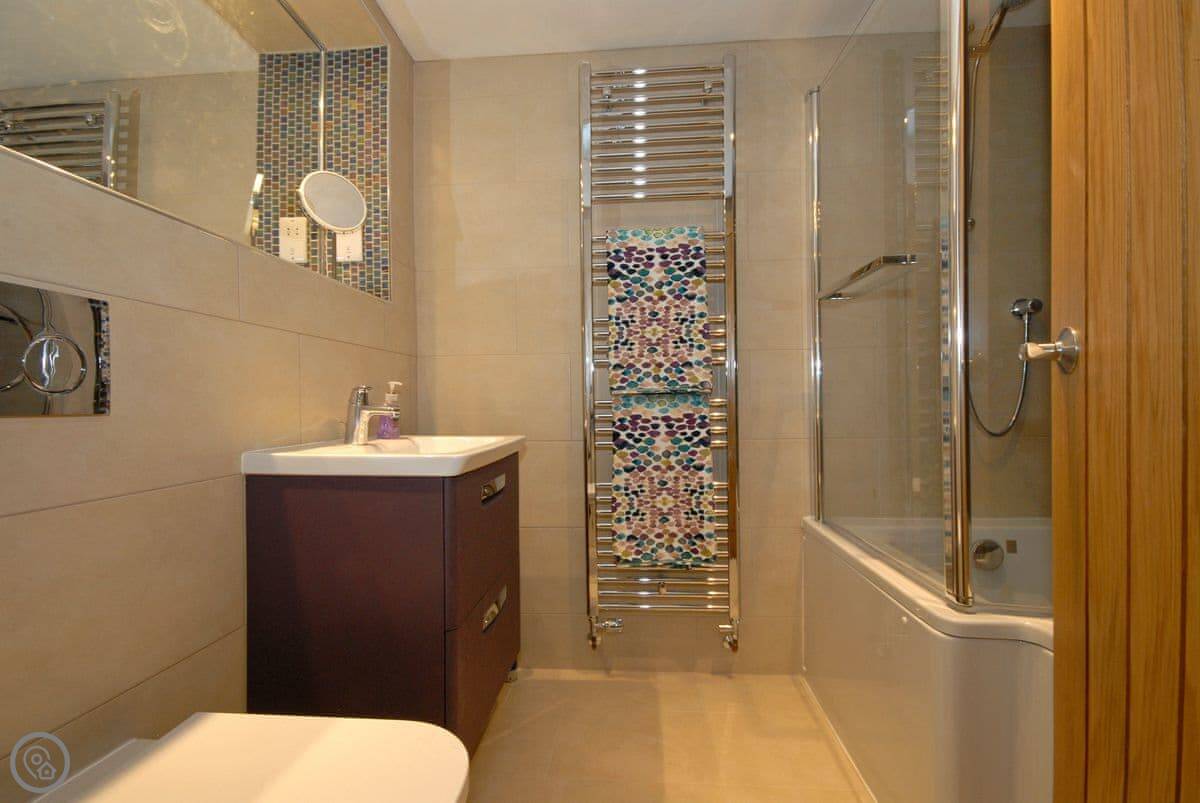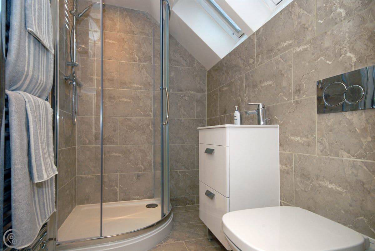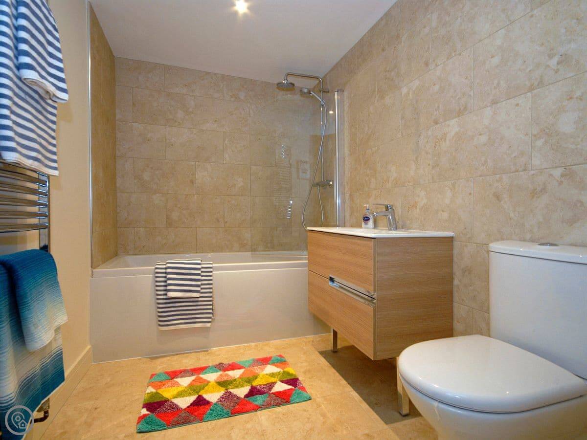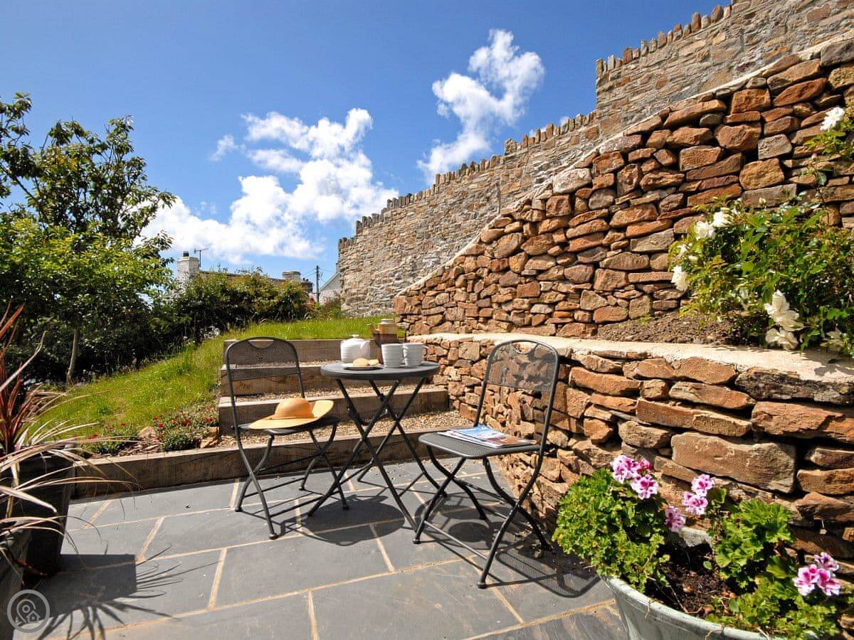 Inside, it's all very spacious and well done up. It's a 5 Star place, which means it's comfortable and has everything. There are five bathrooms, so nobody's queueing. The kitchen is big and opens out through French doors onto a decked terrace. You can see a sliver of the sea from there. The garden is steep and terraced.