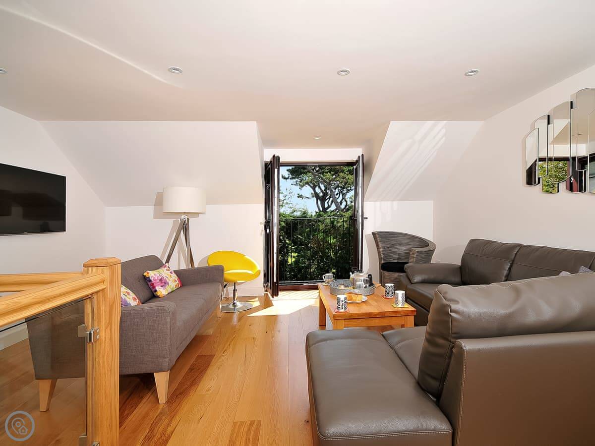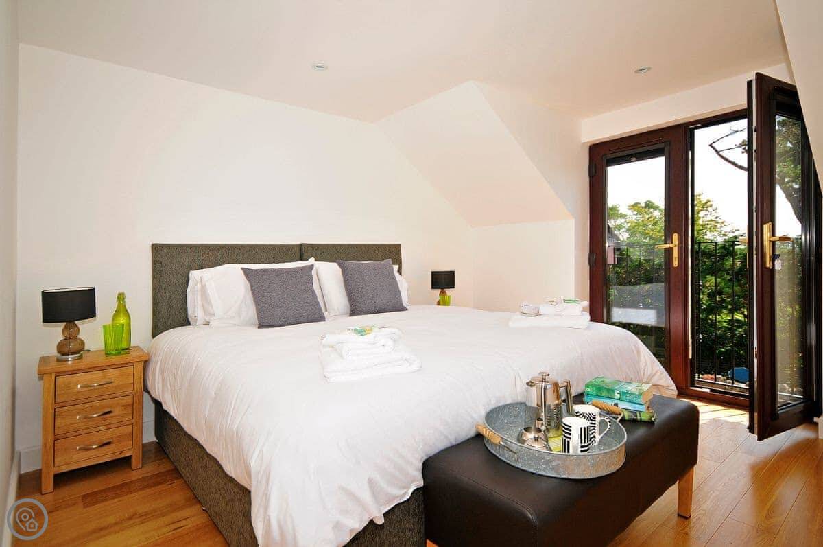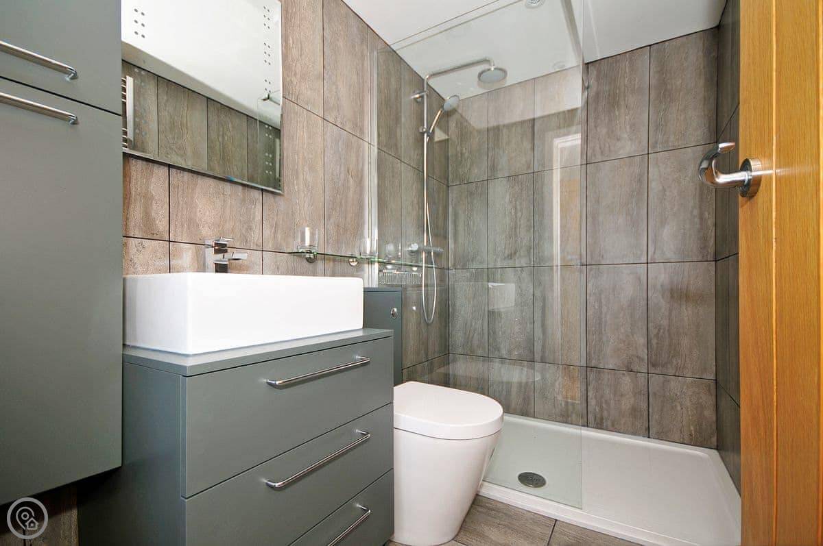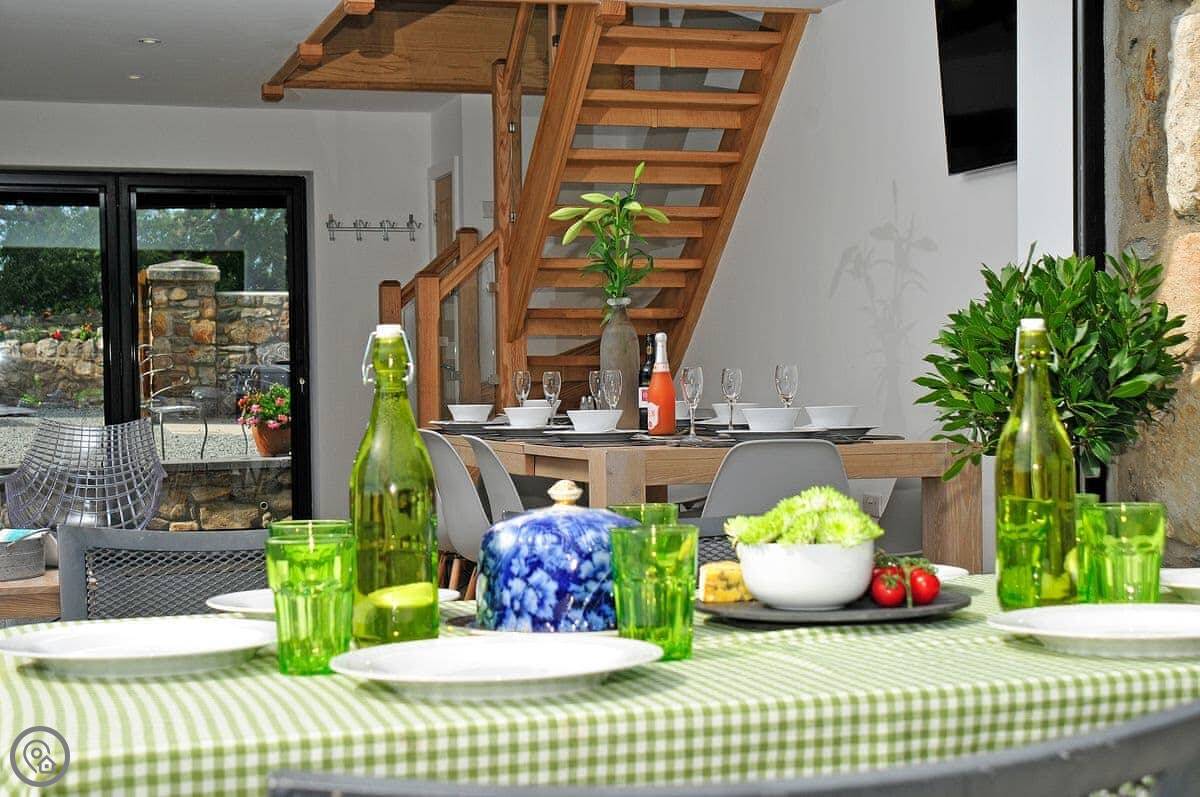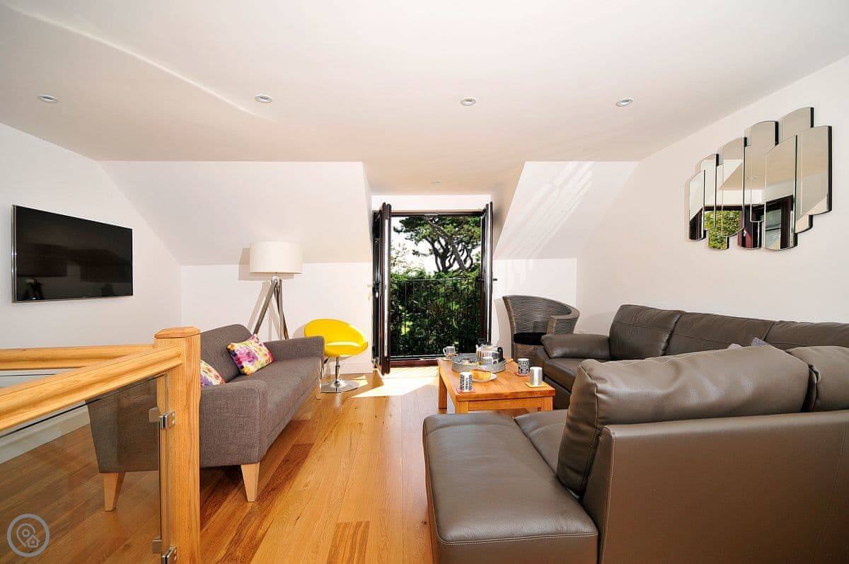 This Anglesey cottage has great style and panache with a large dining table, clean lines and bi-fold doors that open out to both the front and rear of the house, and a lovely welcome for your arrival. On the ground floor there is a large contemporary kitchen and living area with two stylish bedrooms, one with wheelchair access to bedroom and shower room. The master downstairs bedroom has a fantastic picture window with views of Malltraeth, Newborough and the Snowdonia Mountain Range. There are two more en-suite bedrooms on the first floor with Juliet balconies and views of the Malltraeth Estuary. All bedrooms have zip and link beds making this a flexible cottage. Also on first floor is a spacious and comfortable lounge, again with two Juliet balconies. Cool and contemporary with an L-shaped grey leather sofa, quirky chairs and dashes of colour, it really is a distinctive and stylish cottage. At the front of the cottage, you’ll find a Communal seating area with a separate lawn. Each cottage has its own skittle/bowling set. There is a patio at the back to enjoy the morning sunshine and an al fresco breakfast or lunch.