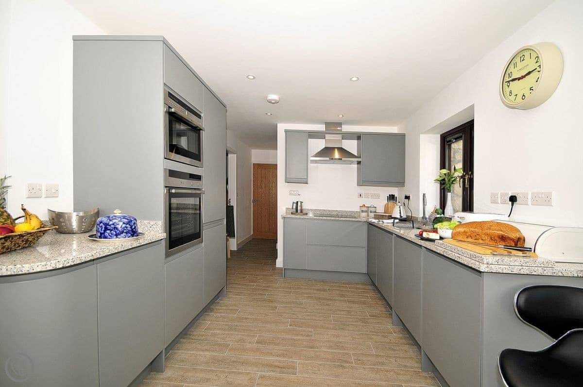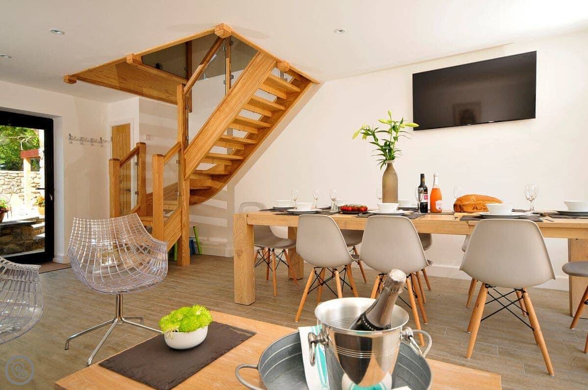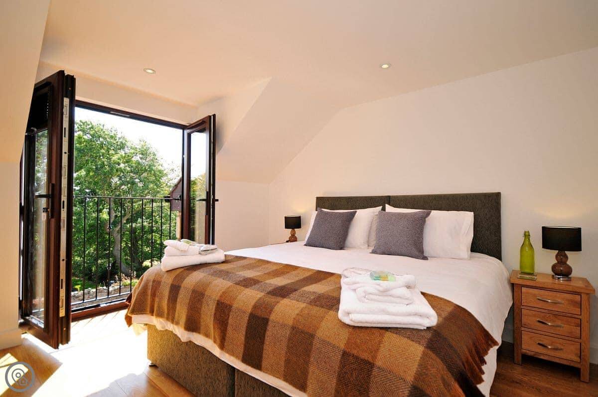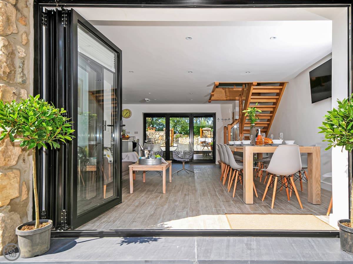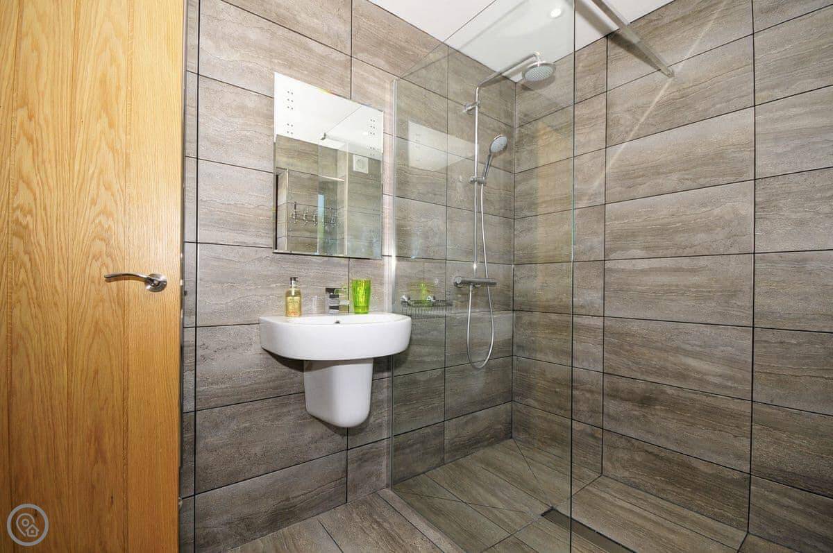 This Anglesey cottage has great style and panache with a large dining table, clean lines and bi-fold doors that open out to both the front and rear of the house, and a lovely welcome for your arrival. On the ground floor there is a large contemporary kitchen and living area with two stylish bedrooms, one with wheelchair access to bedroom and shower room. The master downstairs bedroom has a fantastic picture window with views of Malltraeth, Newborough and the Snowdonia Mountain Range. There are two more en-suite bedrooms on the first floor with Juliet balconies and views of the Malltraeth Estuary. All bedrooms have zip and link beds making this a flexible cottage. Also on first floor is a spacious and comfortable lounge, again with two Juliet balconies. Cool and contemporary with an L-shaped grey leather sofa, quirky chairs and dashes of colour, it really is a distinctive and stylish cottage. At the front of the cottage, you’ll find a Communal seating area with a separate lawn. Each cottage has its own skittle/bowling set. There is a patio at the back to enjoy the morning sunshine and an al fresco breakfast or lunch.