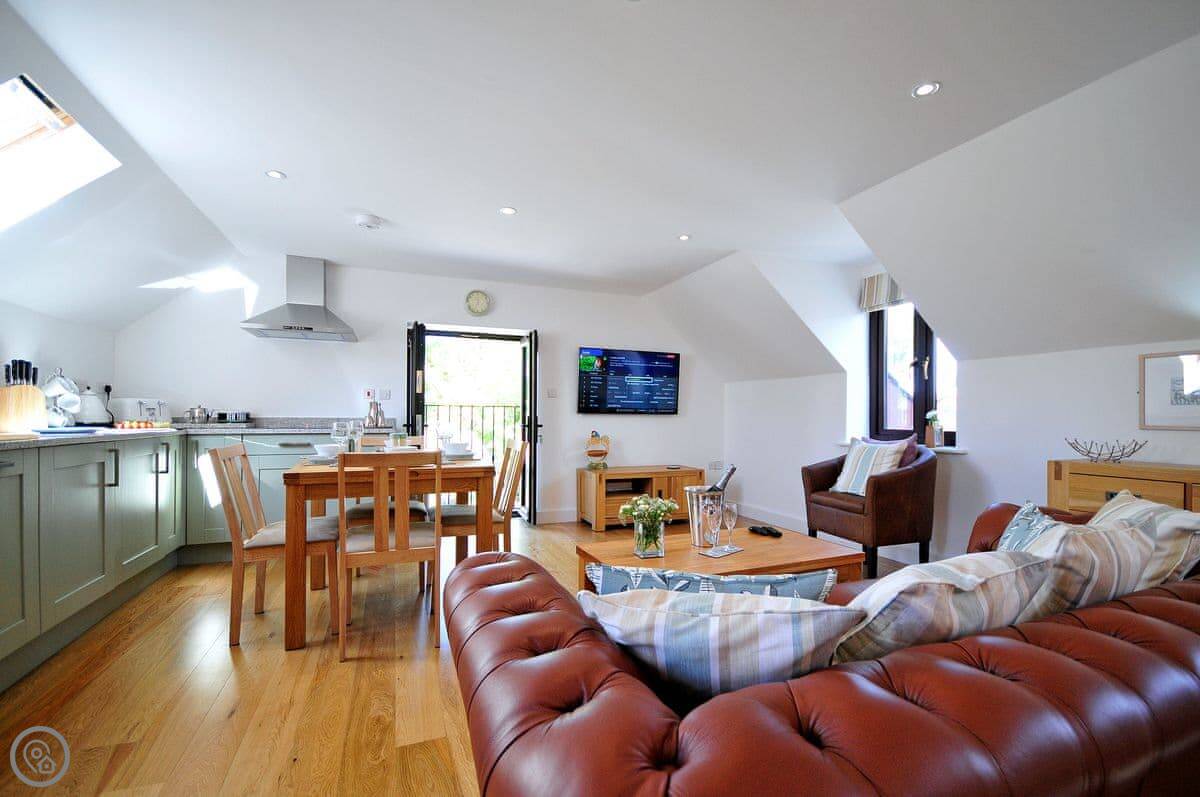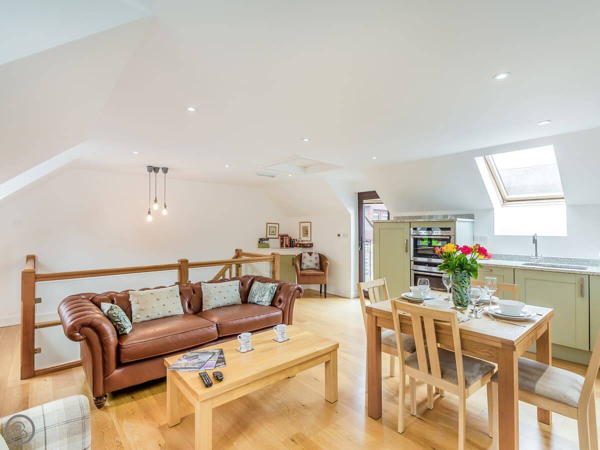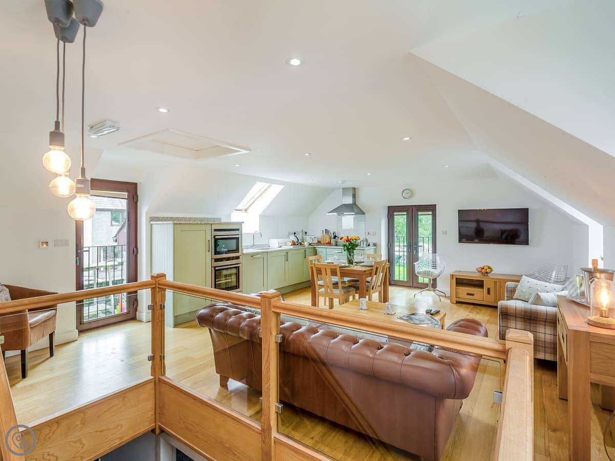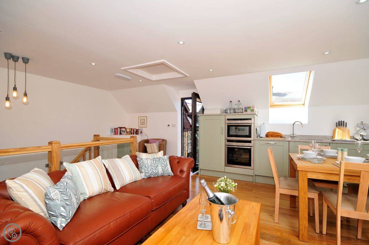 The living room and kitchen are upstairs. It's open plan. The style is quite modern. The owner is an artist, so there are some nice paintings up. The kitchen is a pale green. There's a comfy leather chesterfield sofa and a few odd chairs I picked because I liked them. TV on the wall.