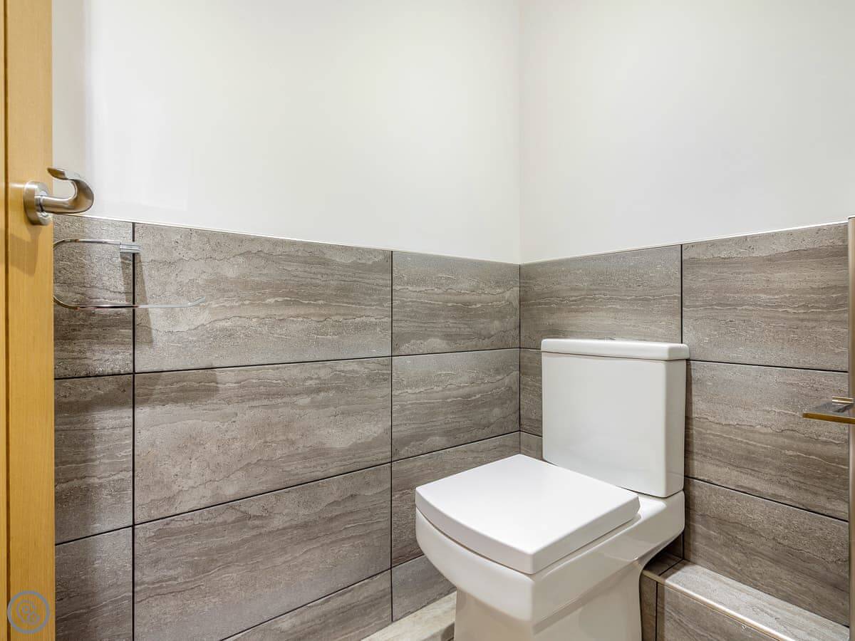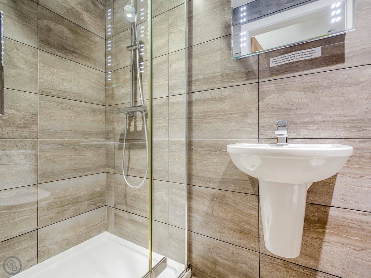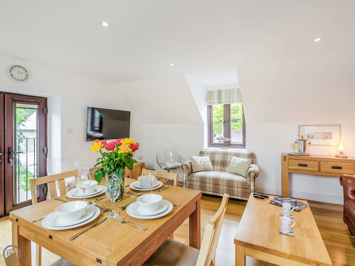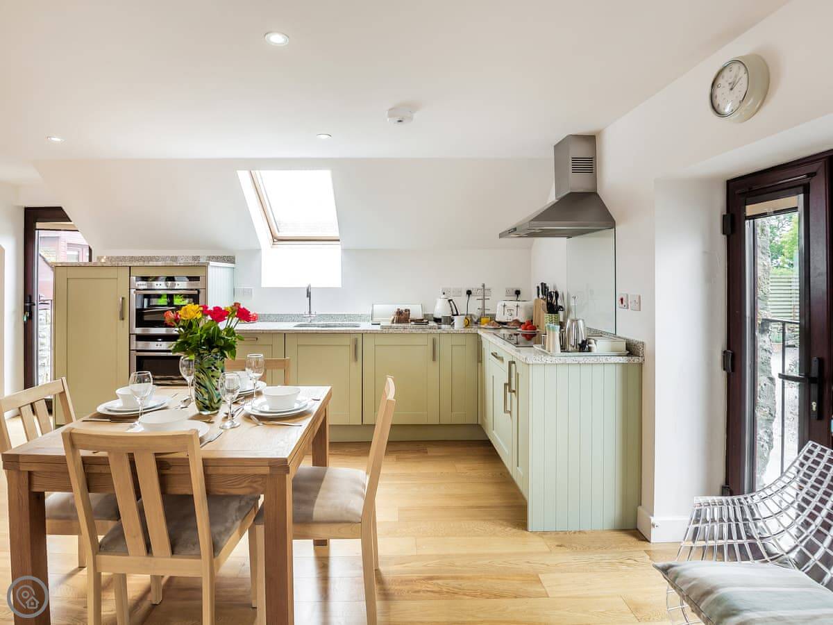 The living room and kitchen are upstairs. It's open plan. The style is quite modern. The owner is an artist, so there are some nice paintings up. The kitchen is a pale green. There's a comfy leather chesterfield sofa and a few odd chairs I picked because I liked them. TV on the wall.