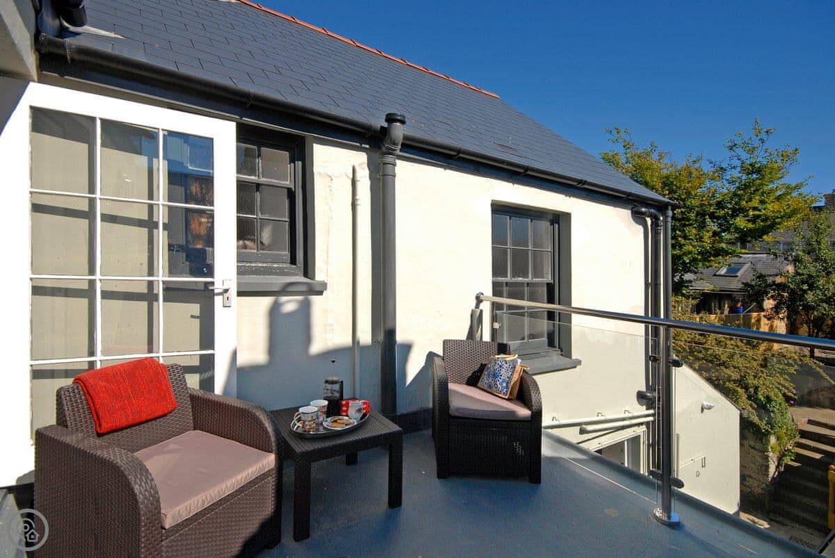 A fusion of old and new has been thoughtfully combined to create a unique environment in which to stay. Family heirlooms sit perfectly with contemporary pieces, the family China and Murano style glassware are perfect examples. You enter the property through a discreet door, immediately off the square. Beyond there is a secure store, and a pleasant garden with curved stone raised borders and sun dappled terrace, perfect for alfresco dining and entertaining. Off the ground floor lobby is a convenient utility room, with washing machine and tumble dryer. Stairs take you to the first floor lounge/diner which is bathed in light from the large picture window, framing the square. Sit in the window seat overlooking the square, or peacefully out on the roof terrace, with its modern glass balustrade, overlooking the garden terrace. A fully equipped contemporary design kitchen, bath and shower room are also to be found on this floor, as well as a glimpse into the buildings history, with exposed brickwork and period details. The eclectic theme continues with a 1930’s travel luggage label stamped floor, to a wall mural depicting country crockery and kitchenware. Two bedrooms and a cloakroom can be found on the second floor. The master bedroom, with kingsize bed, has a view to compete with the lounge window below. Here you can look beyond the coast to the sea. Watch the sun set over Carn Llidi and Carn Penberry, for the most perfect end to a wonderful day. The cosy second bedroom has a full size single day bed with an additional separate pull-out single bed, offering flexible sleeping arrangements. Beach 1 mile. Pub and restaurant 15 yards.