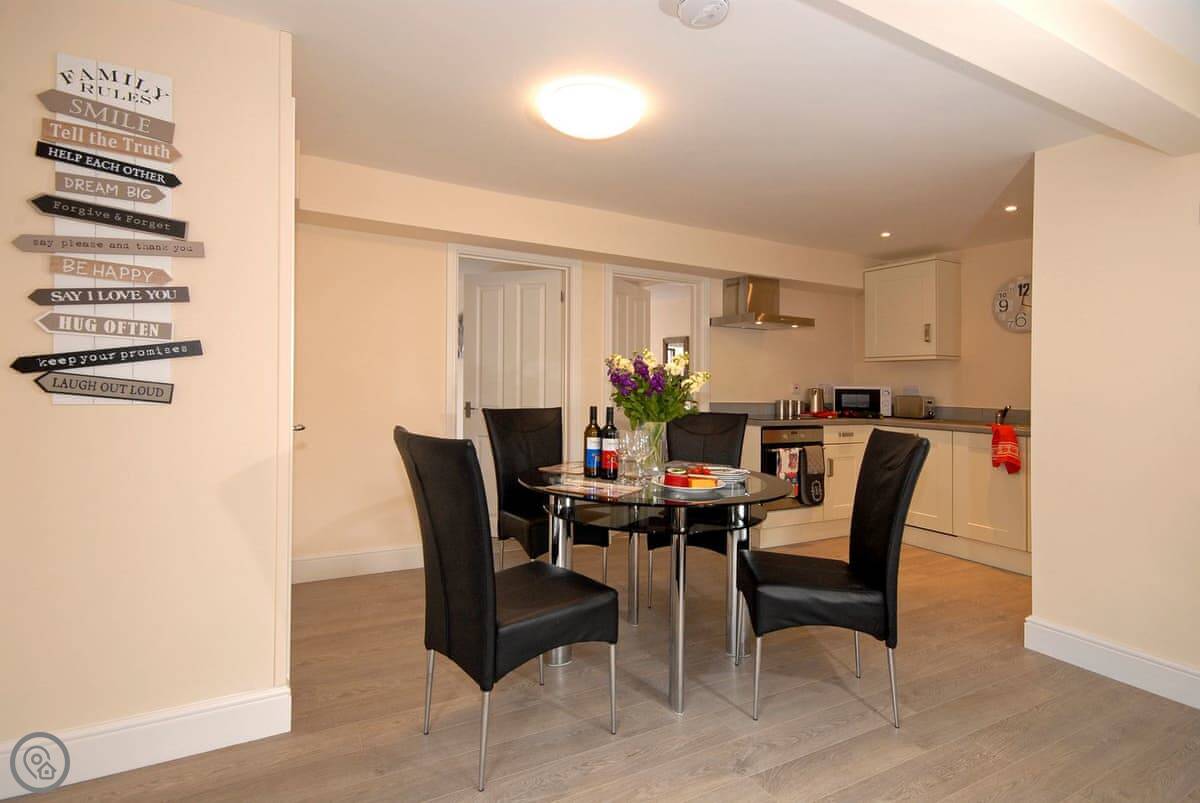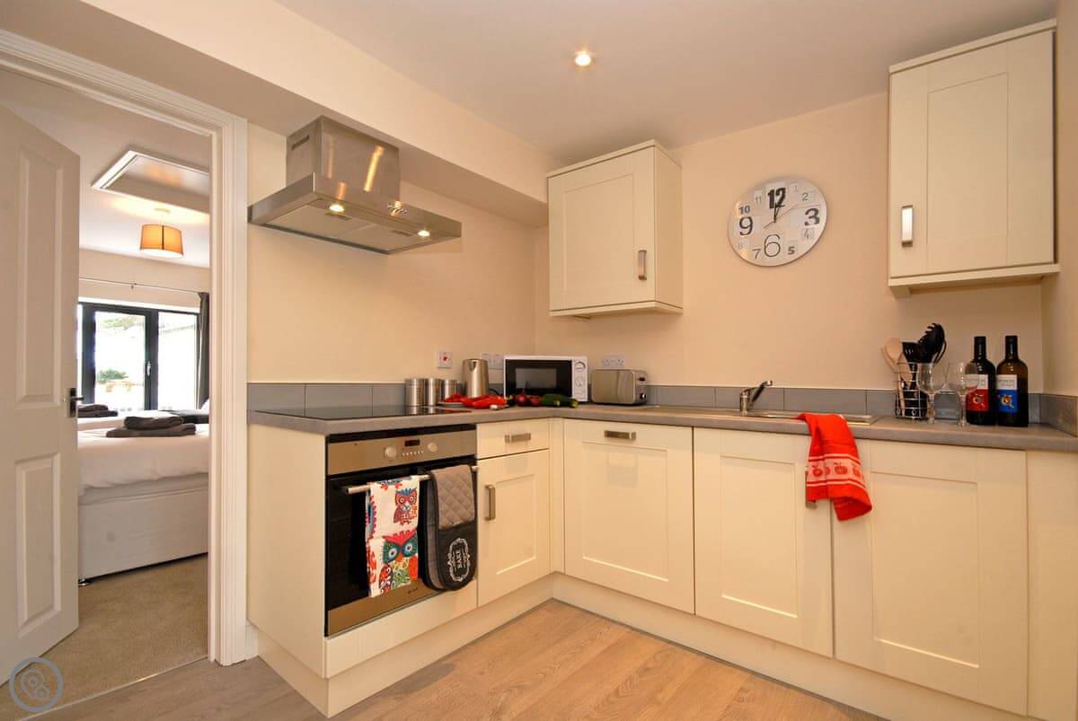Situated within walking distance of the many shops, galleries, restaurants and pubs, Beachcomber sits above the High Street in the centre of St Davids. This modern, carefree, first floor apartment is an excellent choice for those seeking a central location, without the need for a car. Discover the magnificent Cathedral and Bishops Palace, just a short stroll away. If you’re feeling more energetic, Caerfai Bay is just a 15-minute walk, from where you can walk the Pembrokeshire coastal path, left to Solva harbour or right to Porth Clais and Whitesands beyond. Accessed by an external stair and small decked balcony. The open plan living space combines a fully fitted kitchen, lounge area and dining table. Off this, there are two bedrooms that look out onto the High Street, served by a modern shower room.