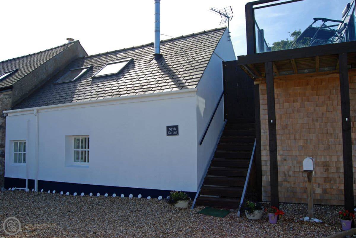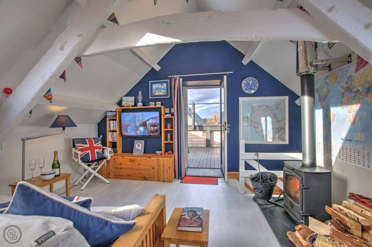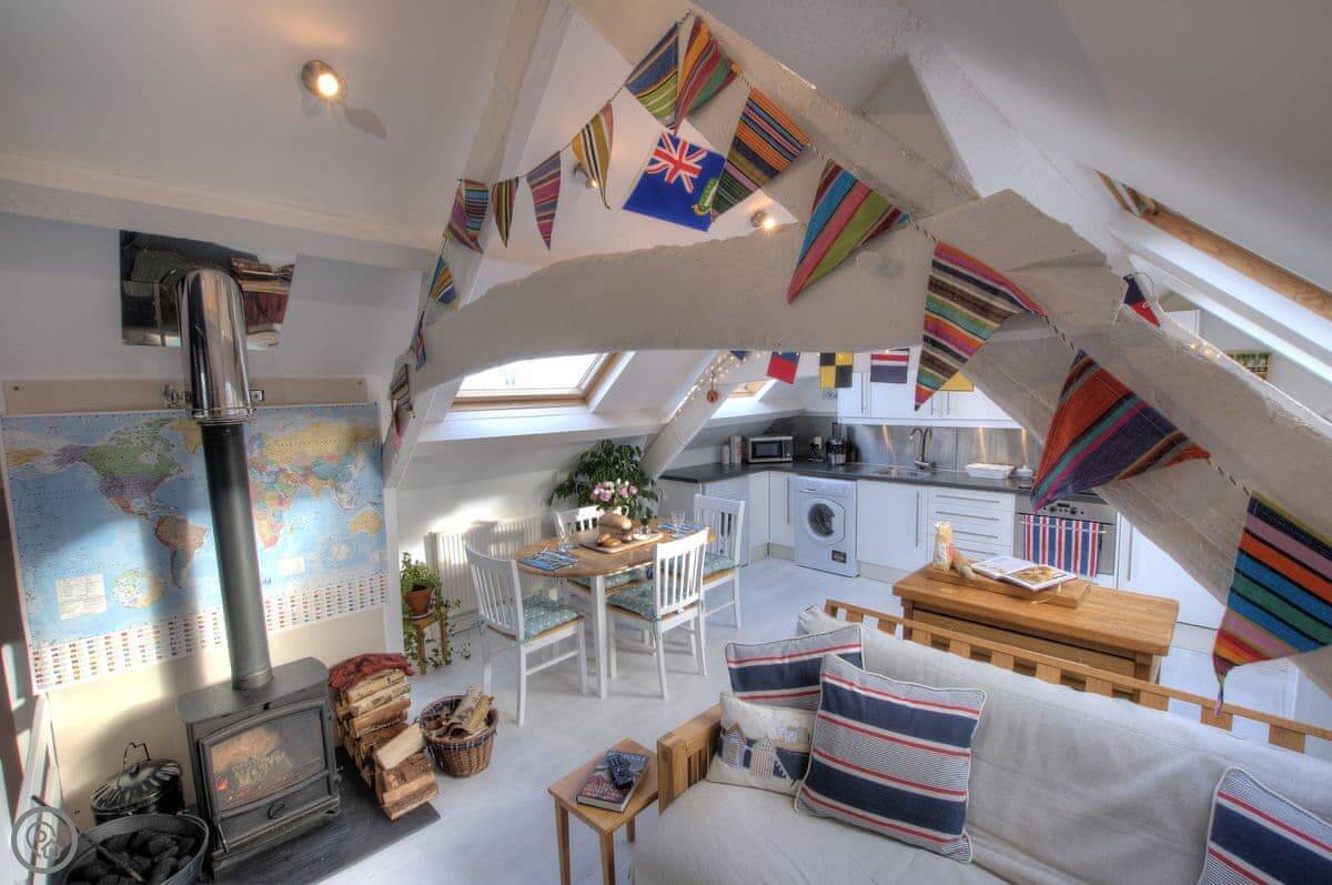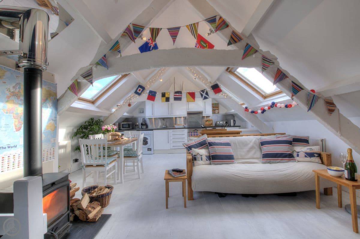 Nyth Cariad, meaning ‘love nest’ in Welsh, was inspired by St Dwynwen, Wales’s patron saint for lovers. The charming cottage reflects the taste of the Anglo-American owners, with clapperboard exterior walls, whitewashed floorboards, and beams, providing a touch of Cape Cod with its seashore atmosphere. Walk up the steps to the first-floor entrance and be greeted by the cosy living area, with wood burner, fairy lights along beams, and an eclectic mix of decorations, which combine to give the property its romantic charm.