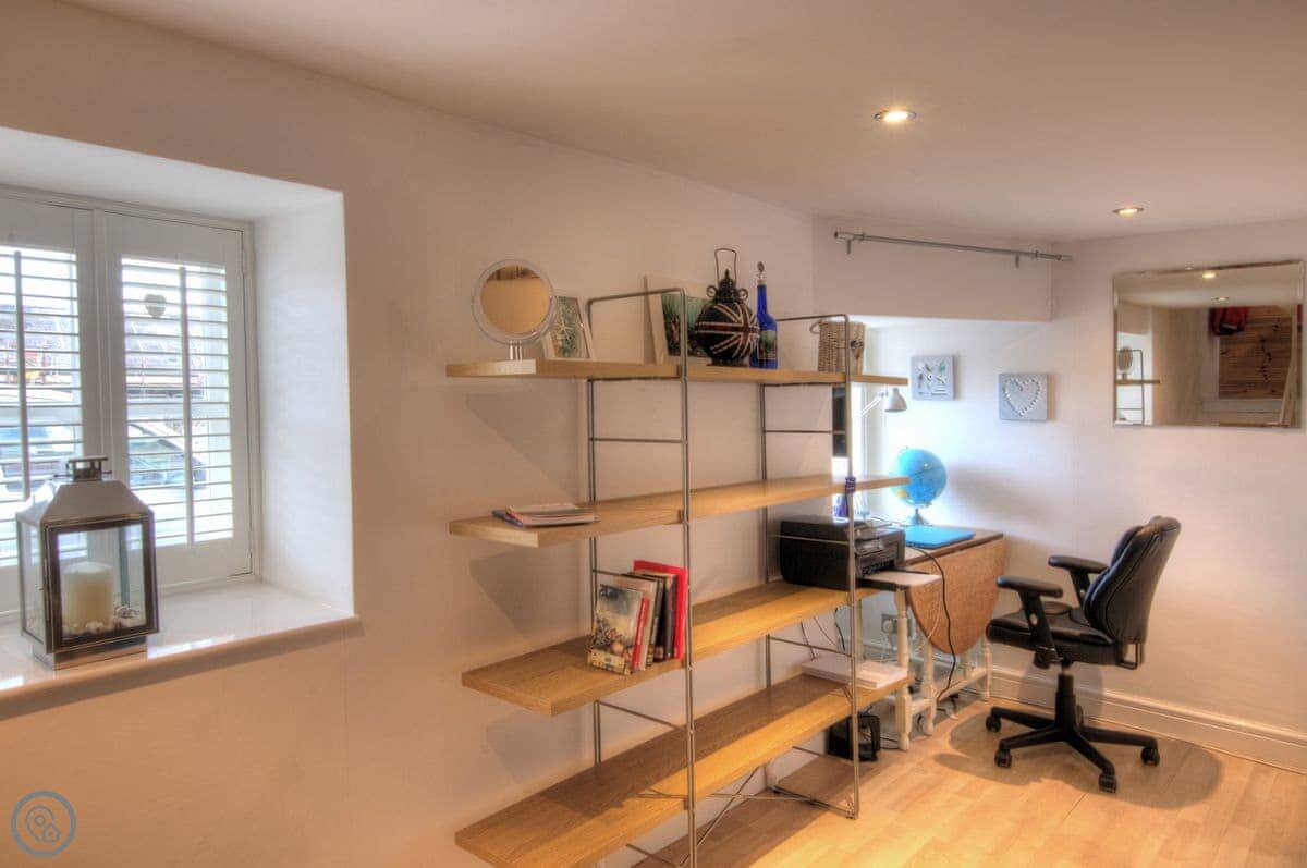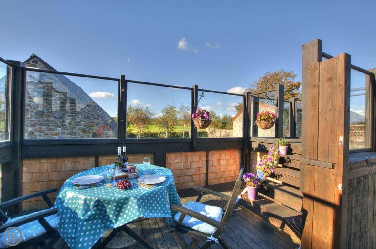 There are 2 decked balconies for sunbathing or alfresco barbecues, with gorgeous views across open fields, woodlands, and Snowdonia’s dramatic mountain range. On the lower floor, there is a charming bedroom with an adjoining bathroom and desk area.