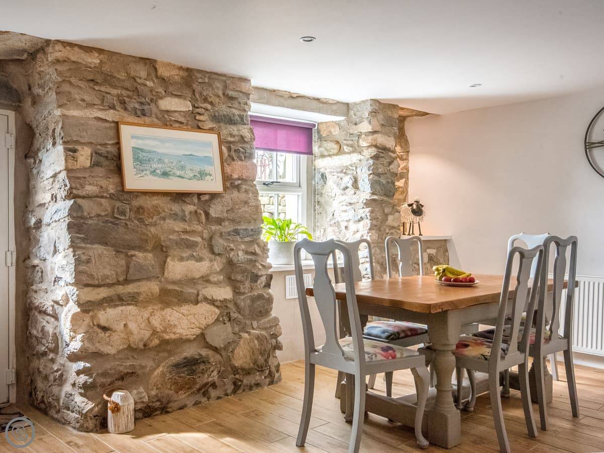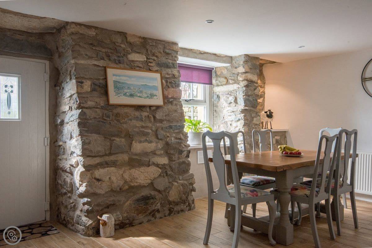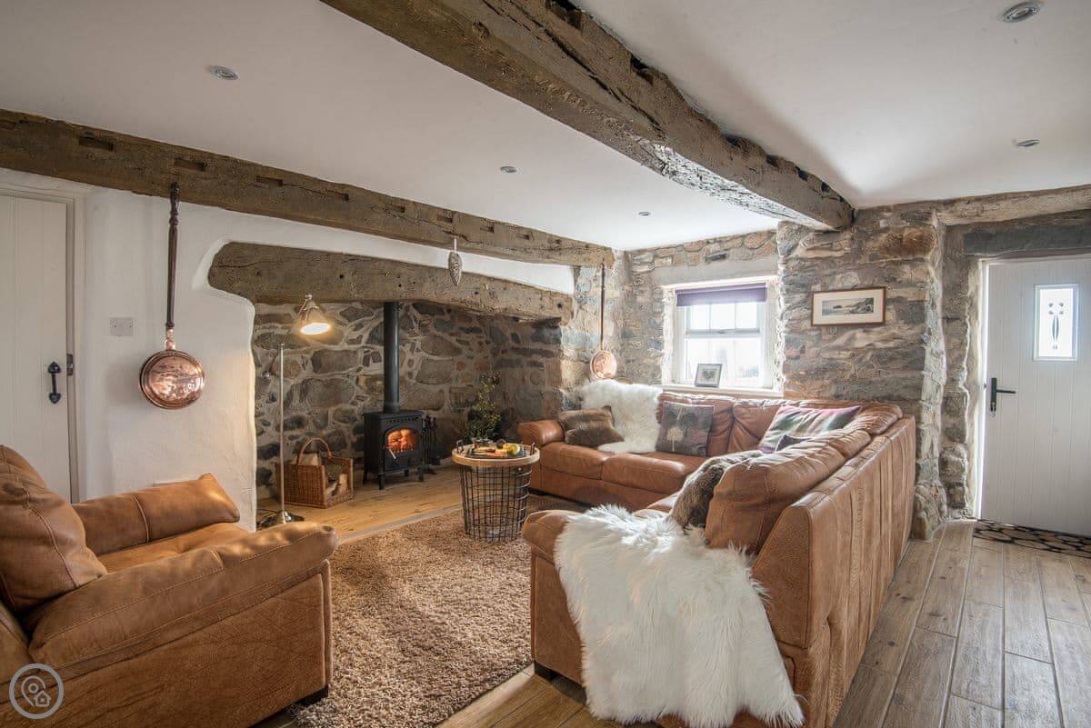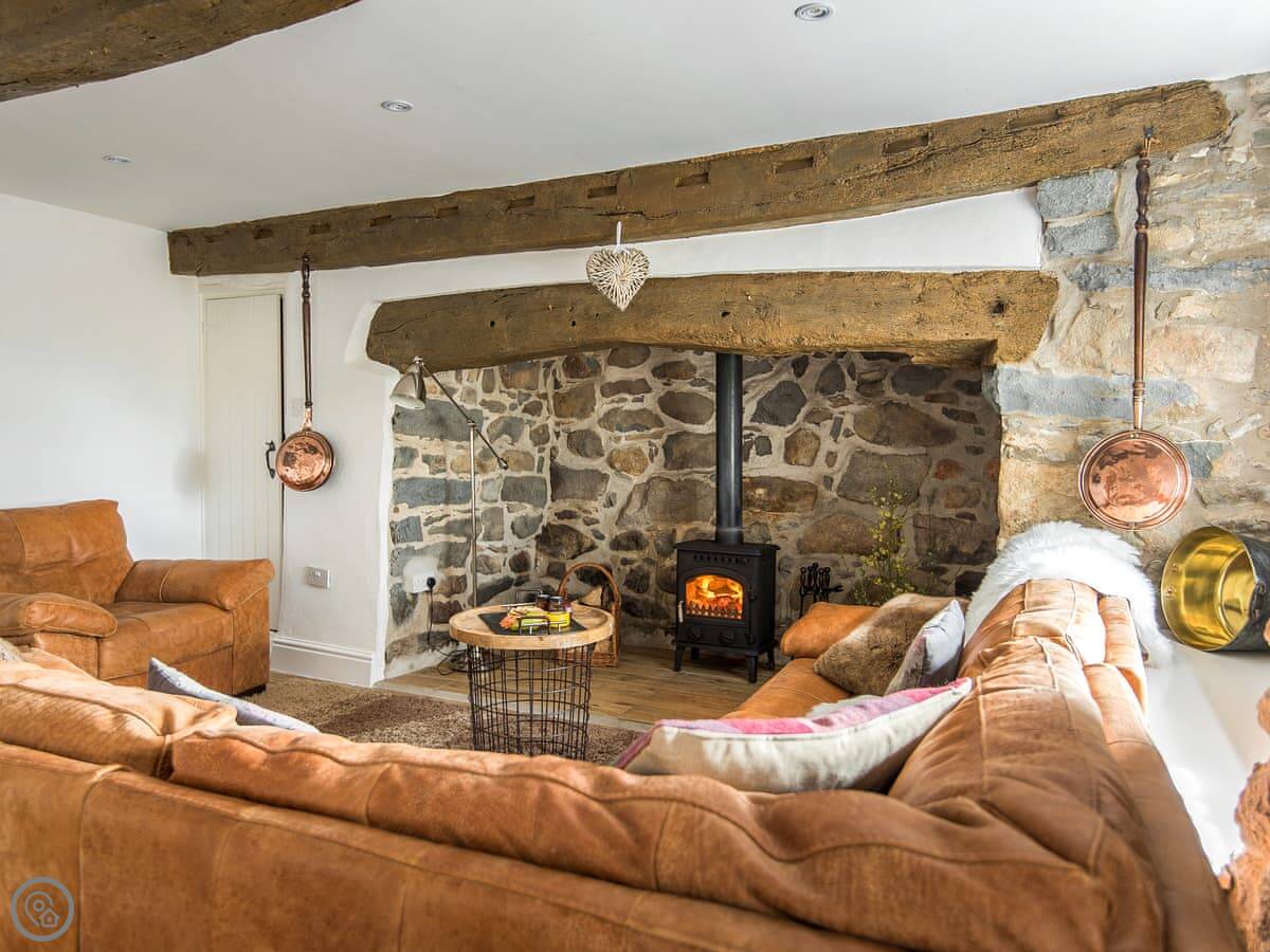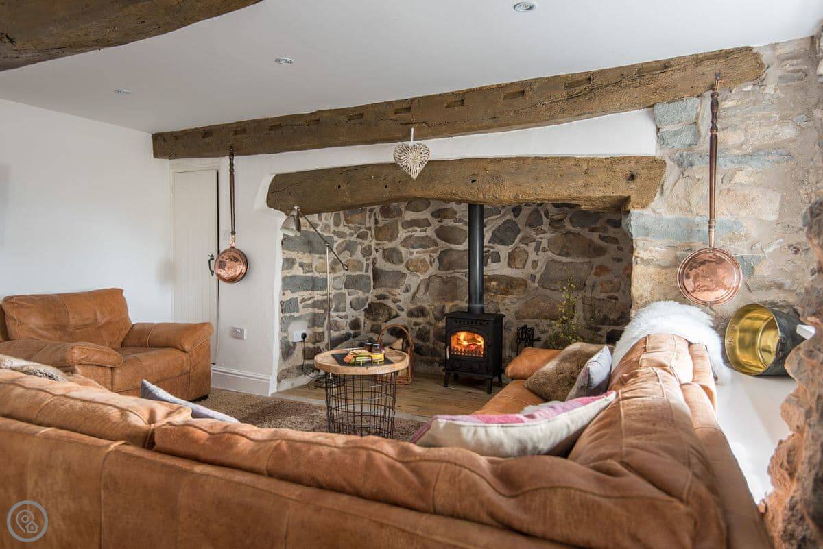 The main room has the original beams and a big inglenook fireplace with a wood burner. There's a decent sized TV and a table to eat at. The kitchen is through an archway and has what you'll need. The windows are small and deep-set, like they are in old places. You get a view of the sea from the front.