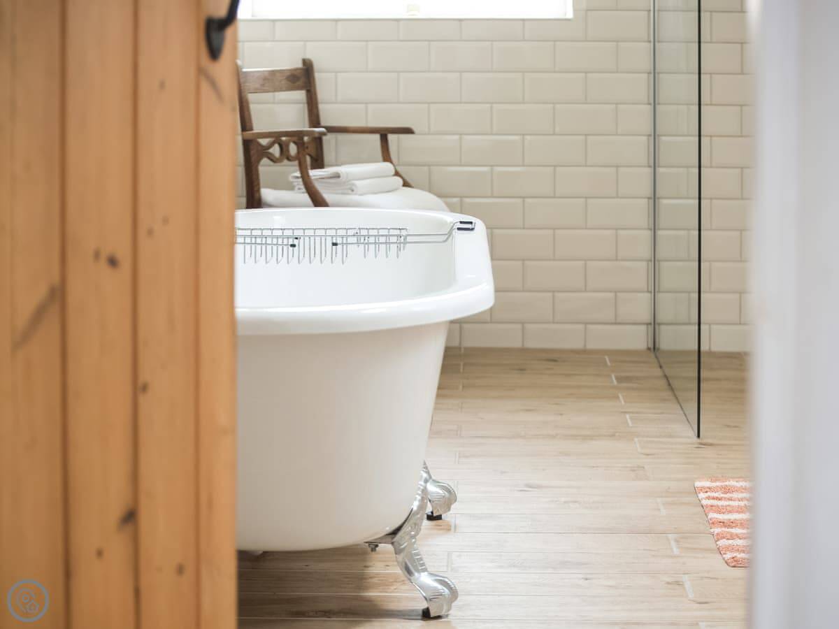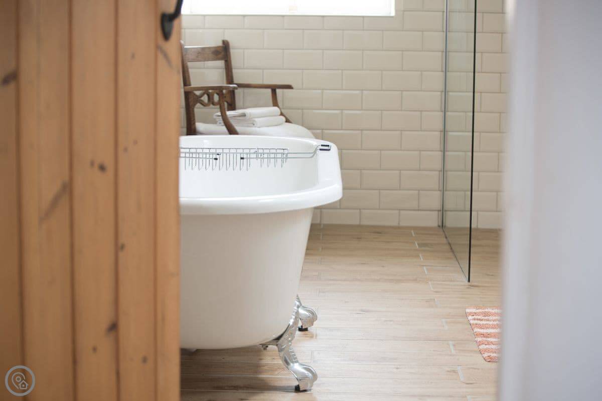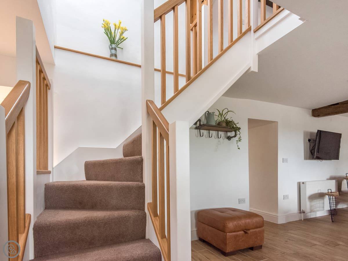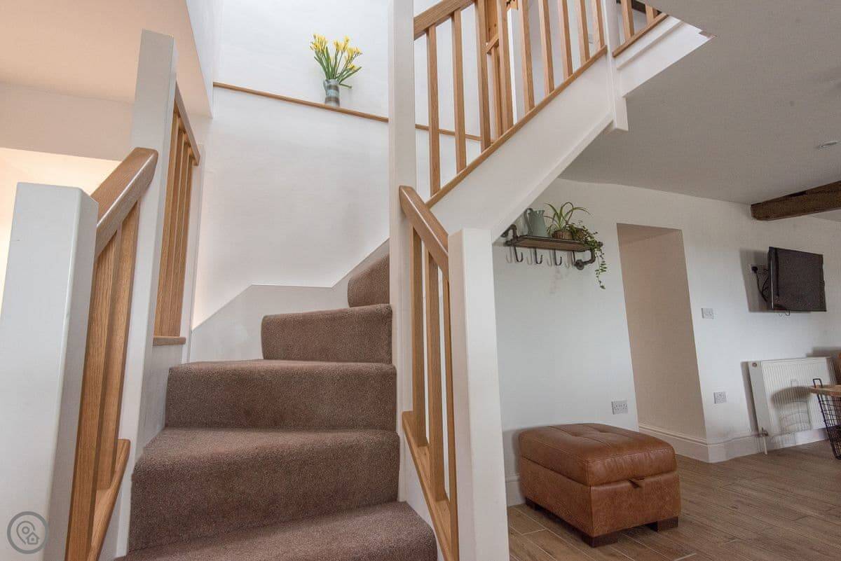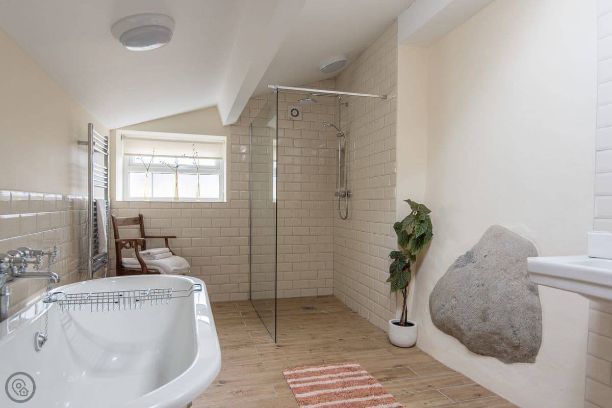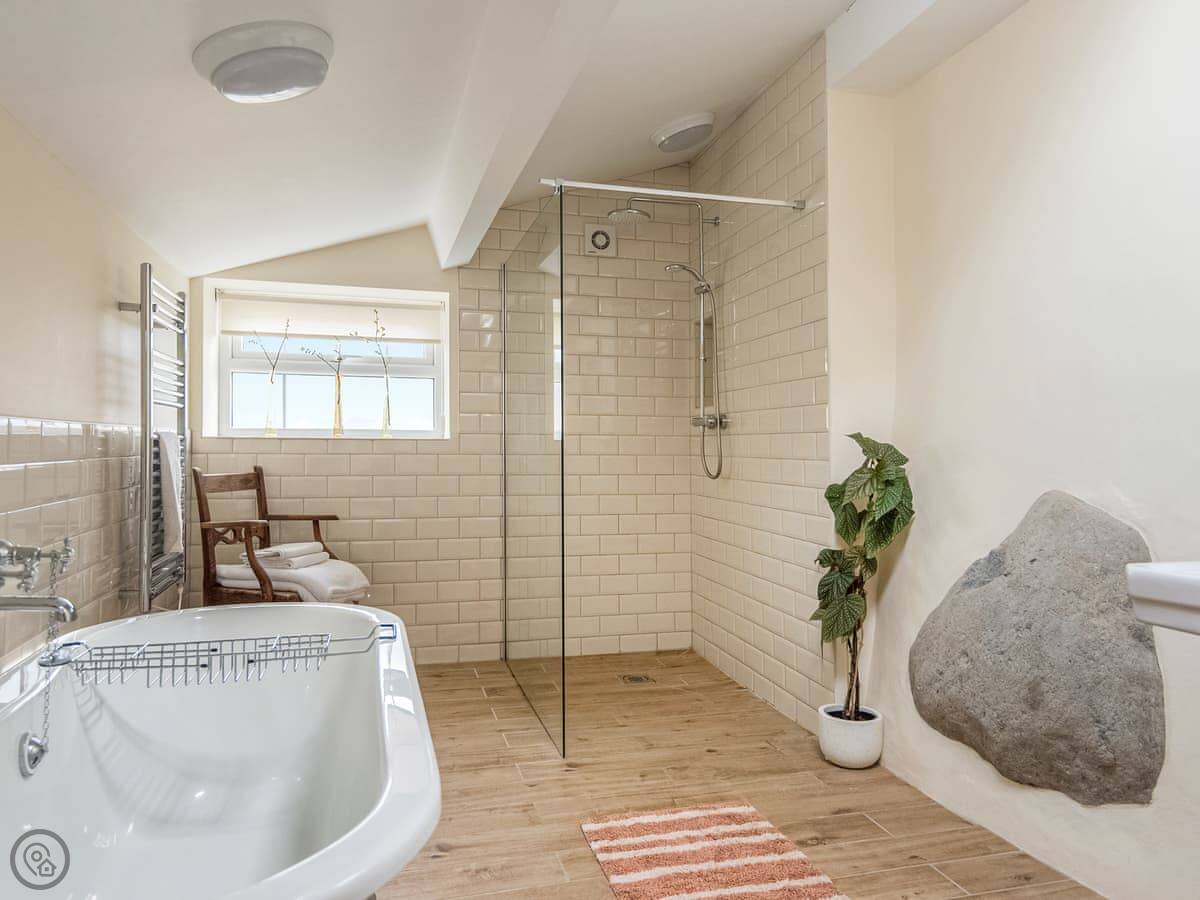 It sleeps four. Three bedrooms, two bathrooms. One bathroom is downstairs with a walk-in shower and a freestanding bath. It's got a 5 Star rating. It's comfortable and well-kept, not just fancy for the sake of it. The stairs are old farmhouse stairs, so they're a bit steeper and narrower than modern ones.