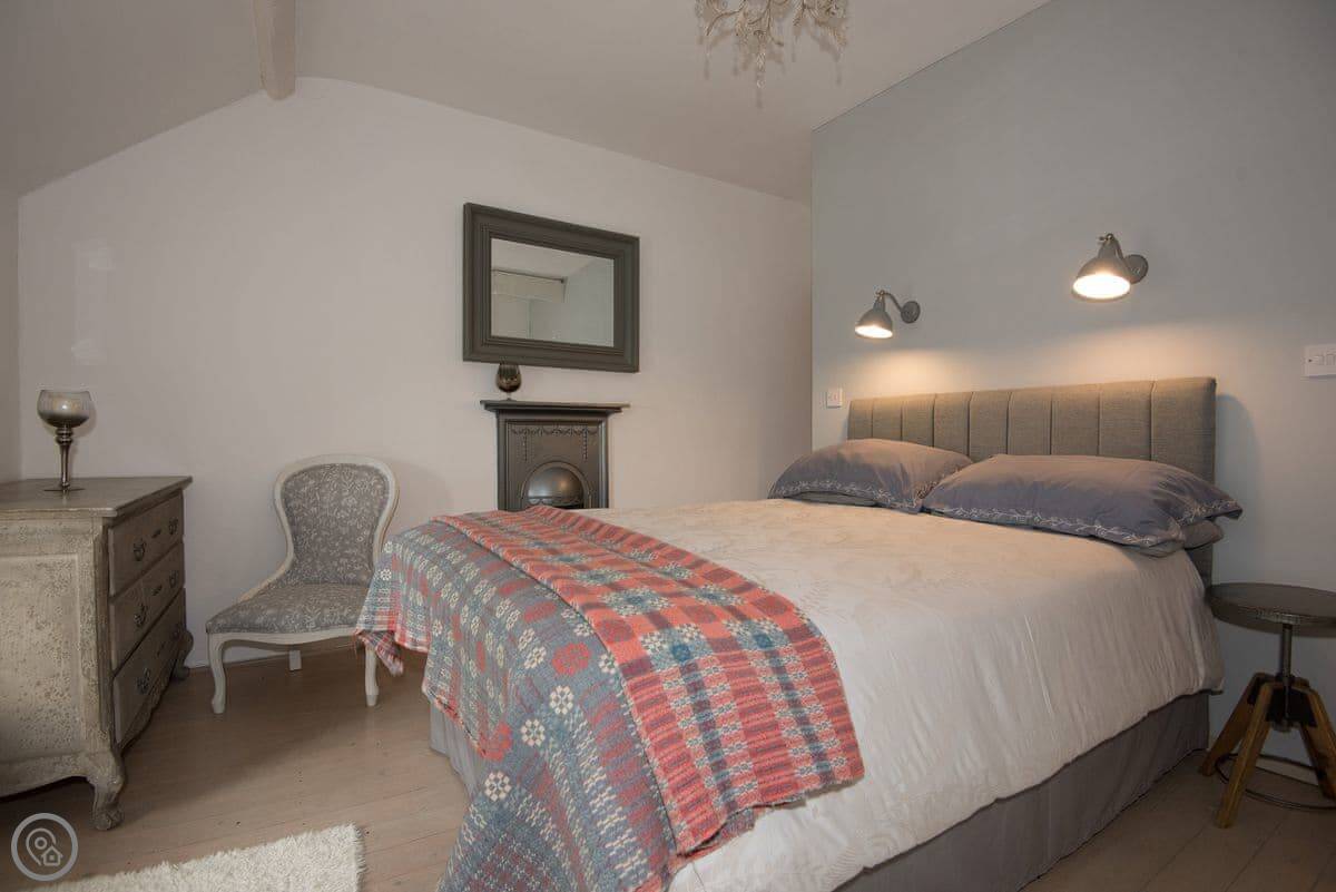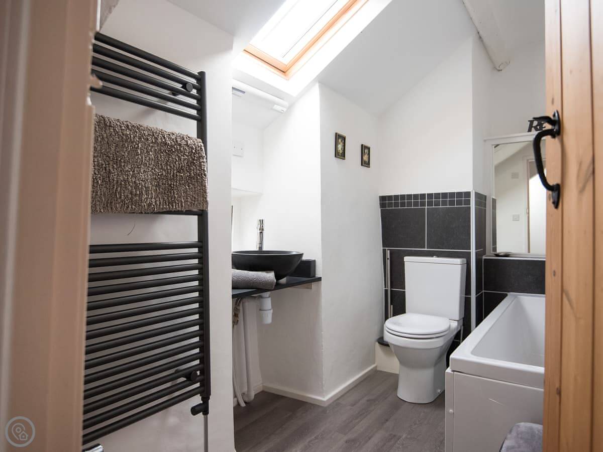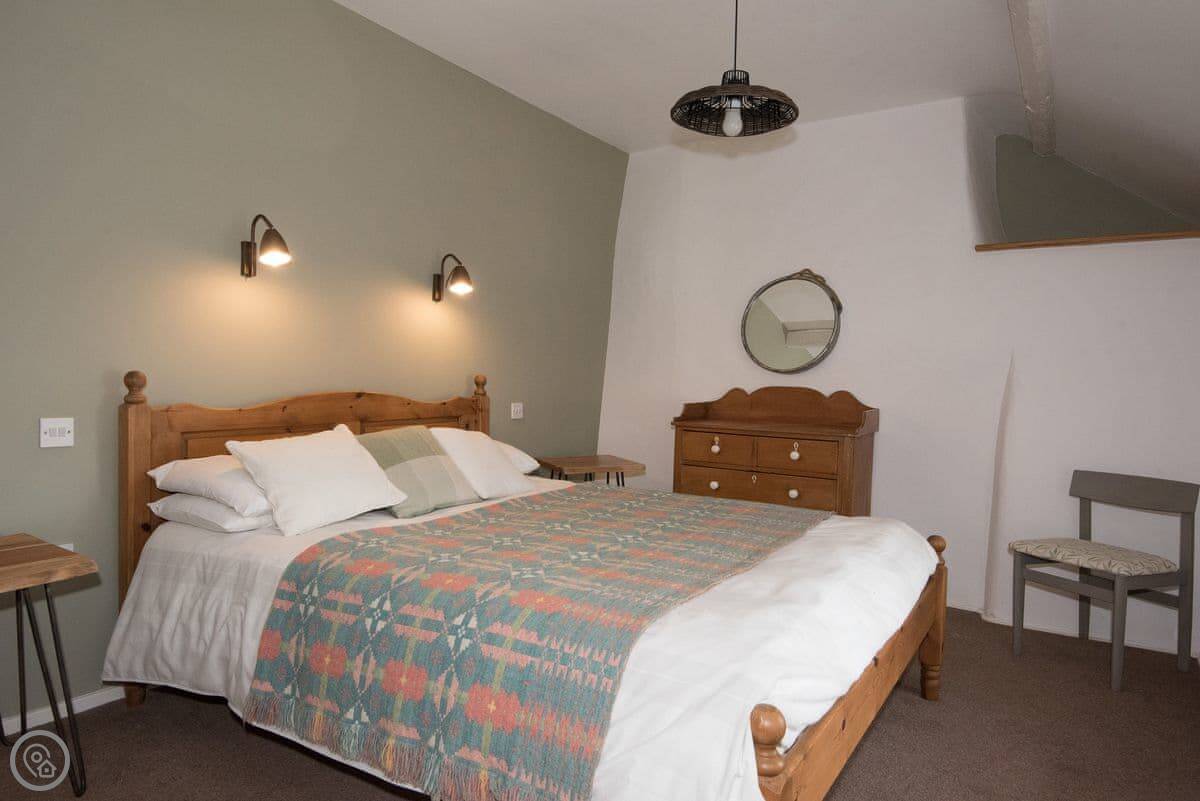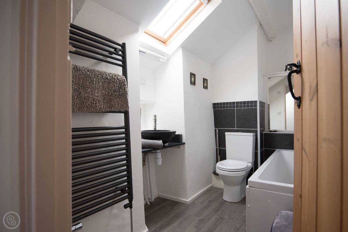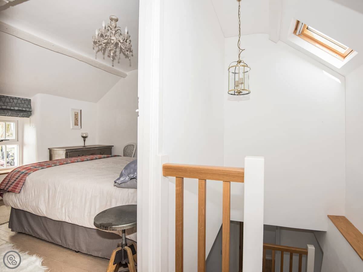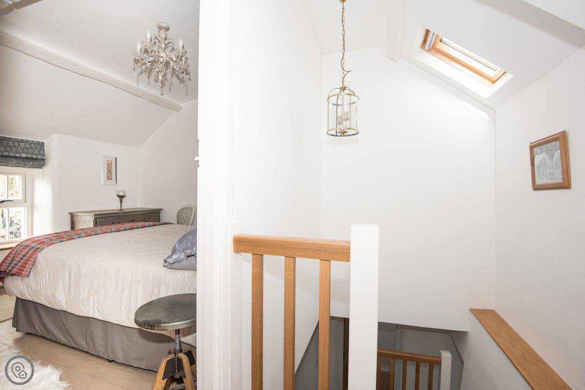 It sleeps four. Three bedrooms, two bathrooms. One bathroom is downstairs with a walk-in shower and a freestanding bath. It's got a 5 Star rating. It's comfortable and well-kept, not just fancy for the sake of it. The stairs are old farmhouse stairs, so they're a bit steeper and narrower than modern ones.