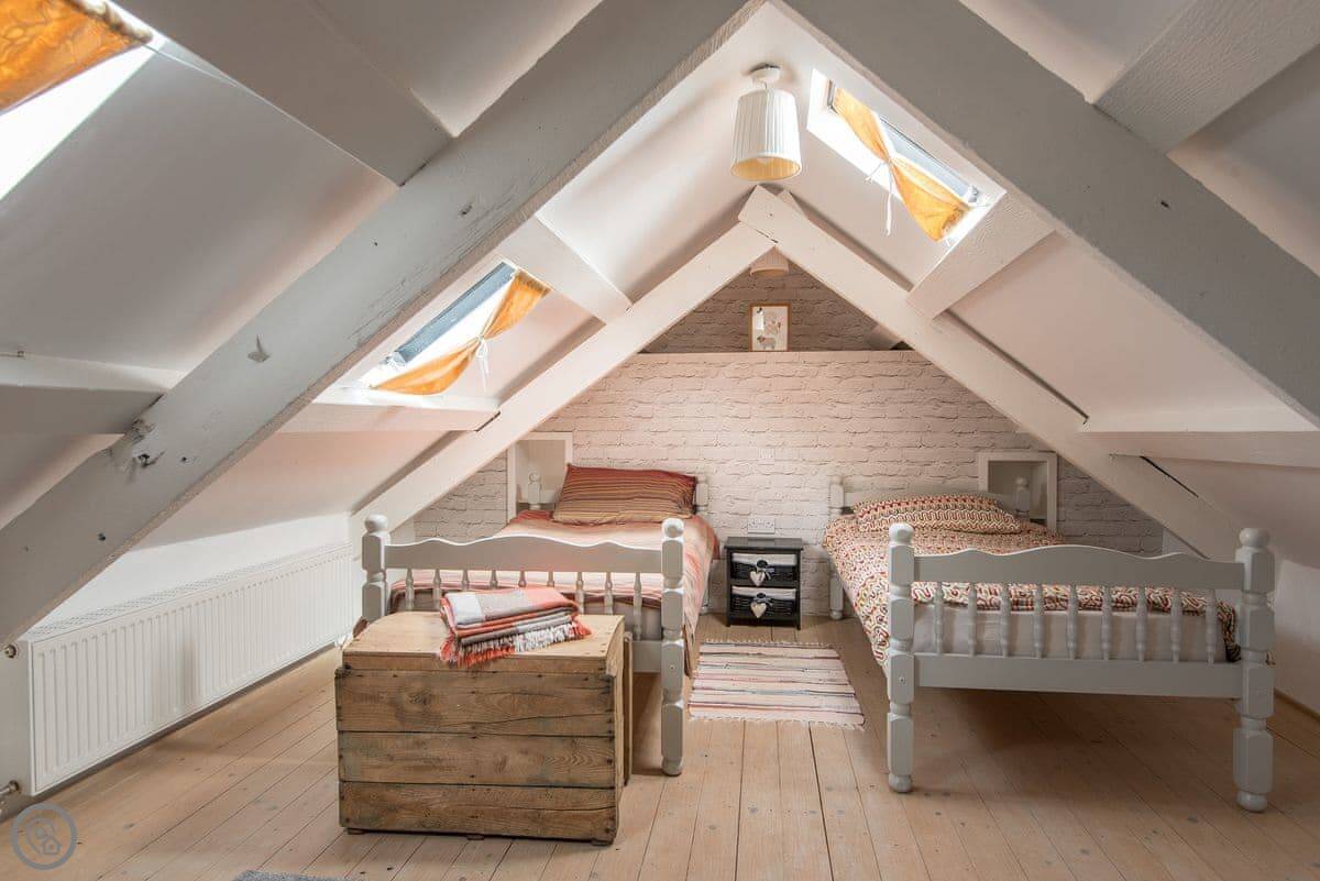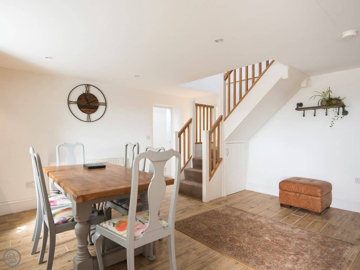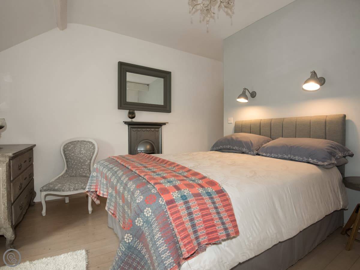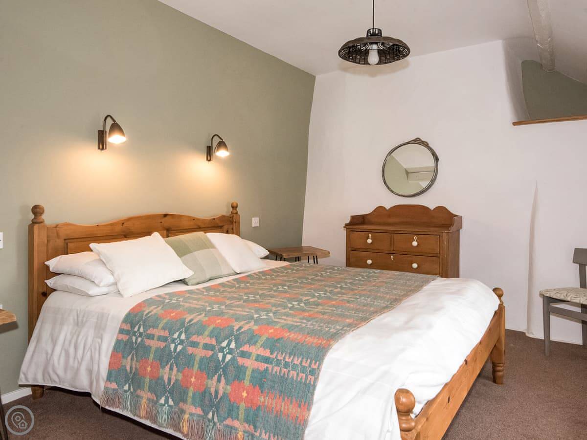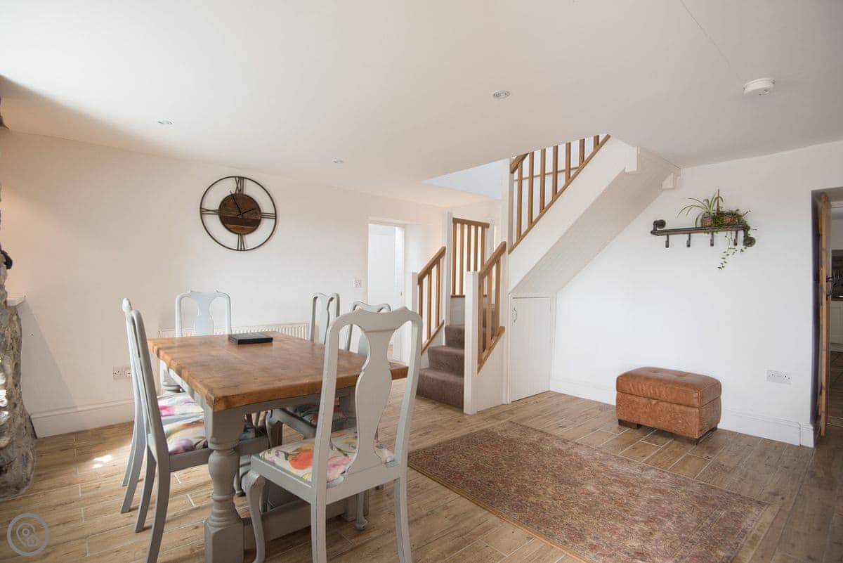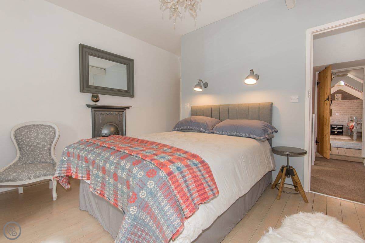 It sleeps four. Three bedrooms, two bathrooms. One bathroom is downstairs with a walk-in shower and a freestanding bath. It's got a 5 Star rating. It's comfortable and well-kept, not just fancy for the sake of it. The stairs are old farmhouse stairs, so they're a bit steeper and narrower than modern ones.