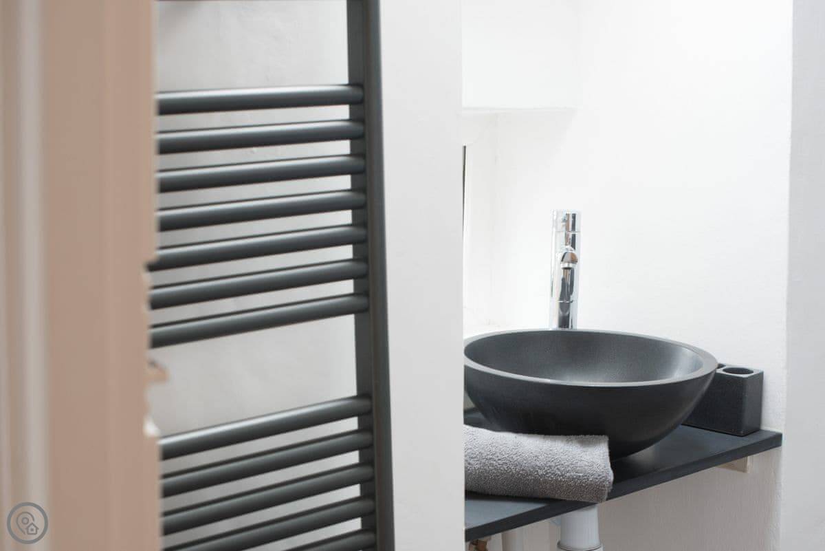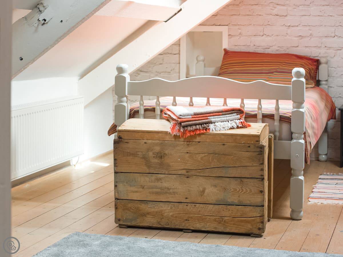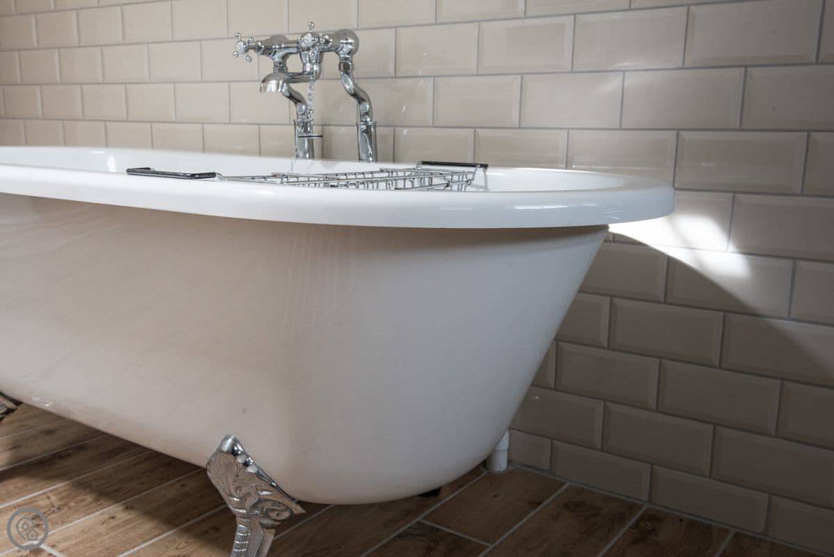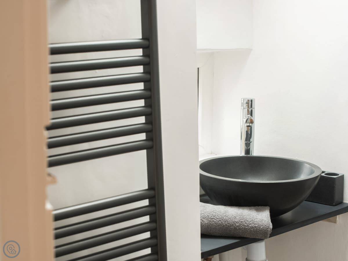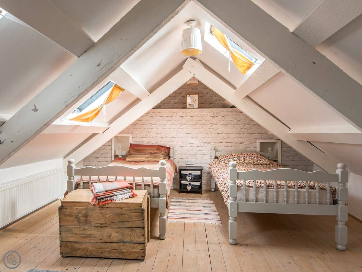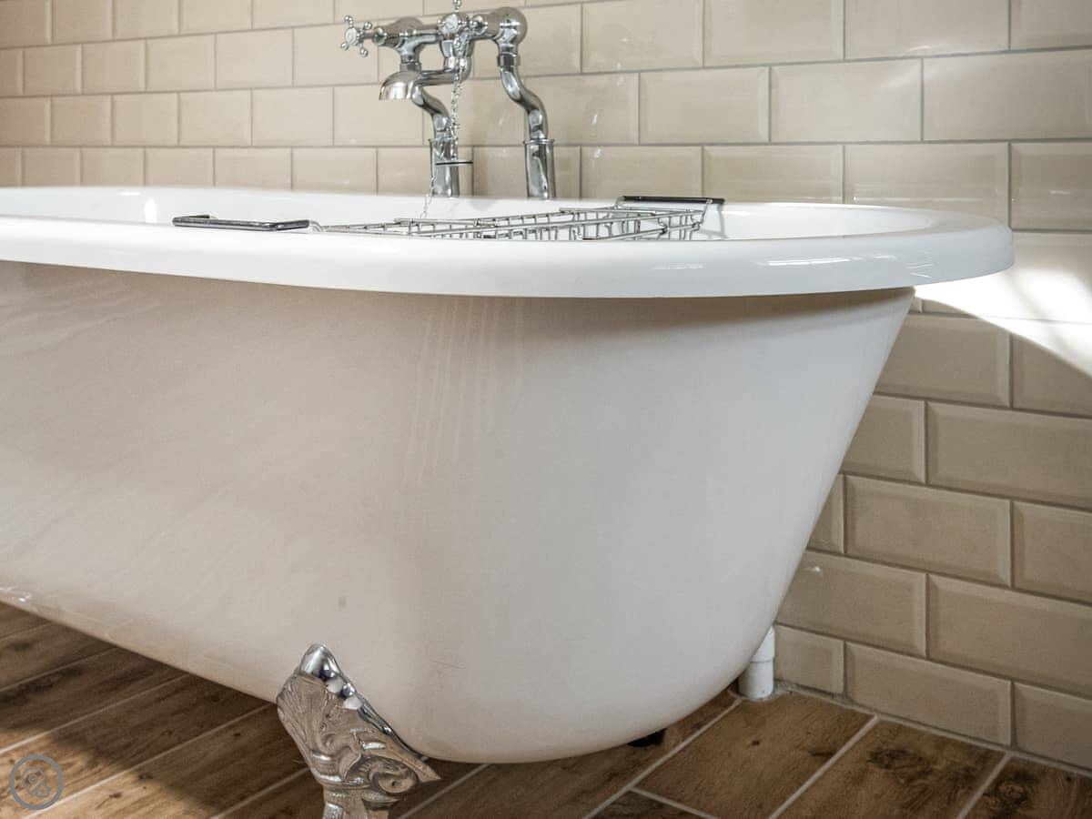 It sleeps four. Three bedrooms, two bathrooms. One bathroom is downstairs with a walk-in shower and a freestanding bath. It's got a 5 Star rating. It's comfortable and well-kept, not just fancy for the sake of it. The stairs are old farmhouse stairs, so they're a bit steeper and narrower than modern ones.