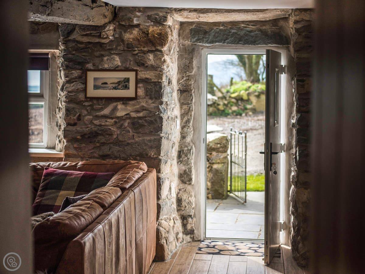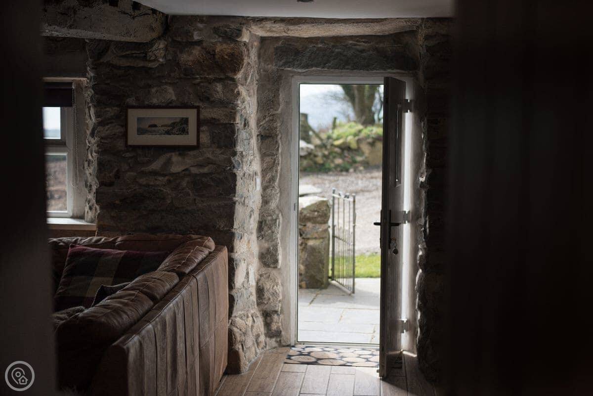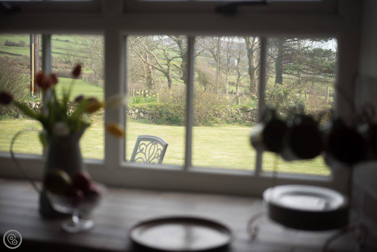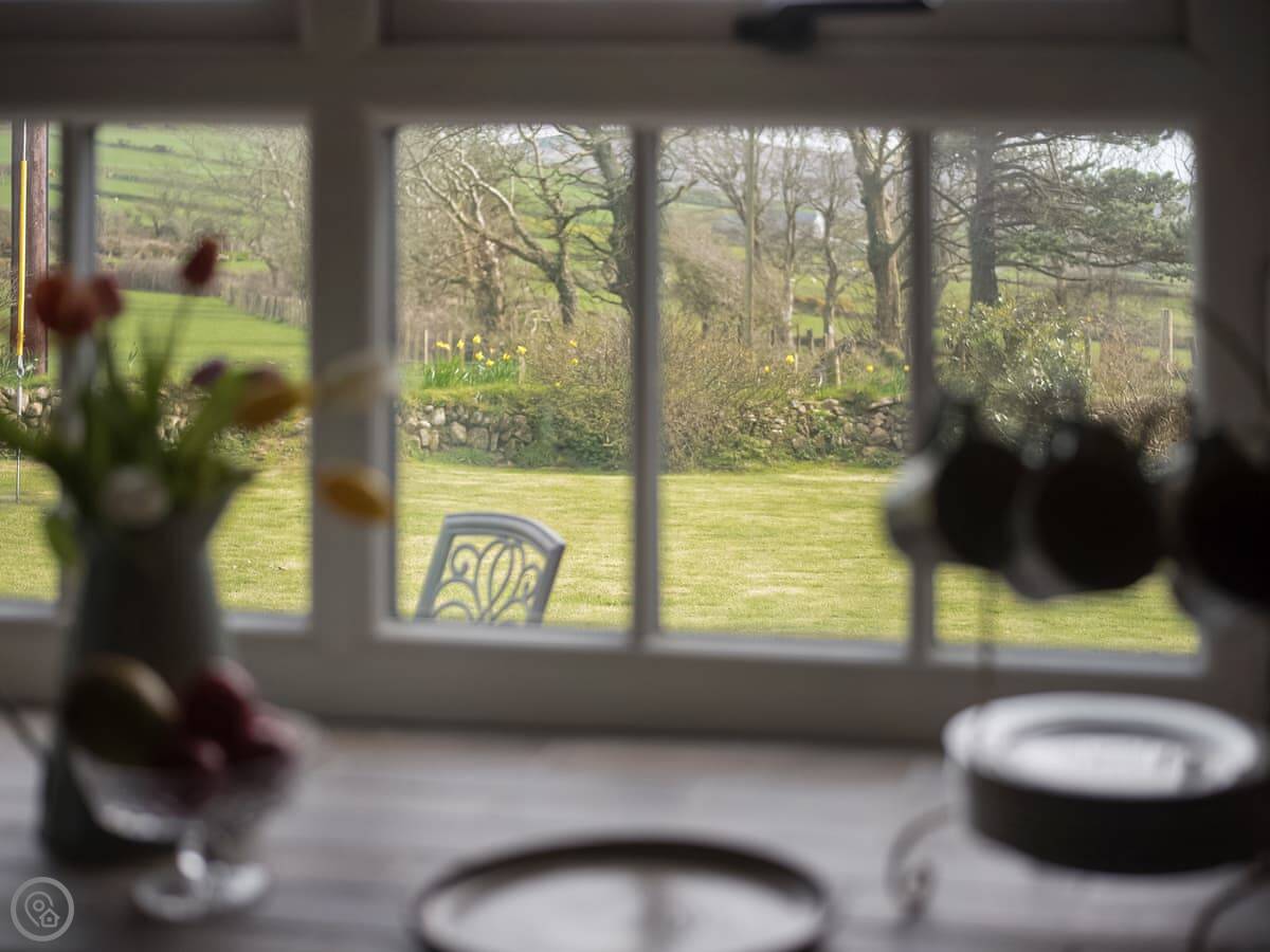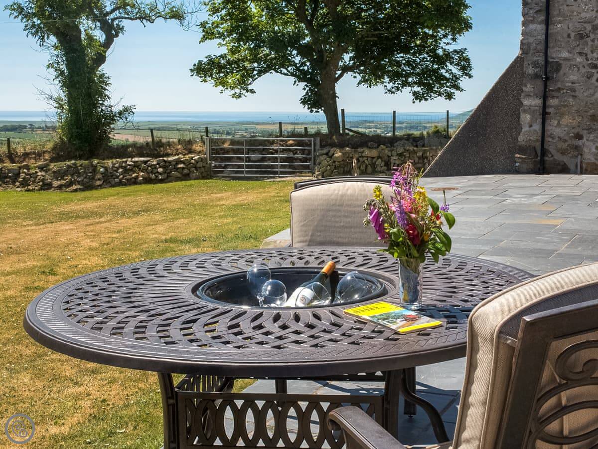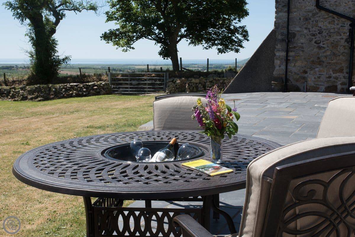 Outside, there's a small slate patio at the front for a morning coffee, looking over the fields to Porth Neigwl bay. Around the back there's a bigger slate area with a table, surrounded by trees. It's quiet, just farmland.