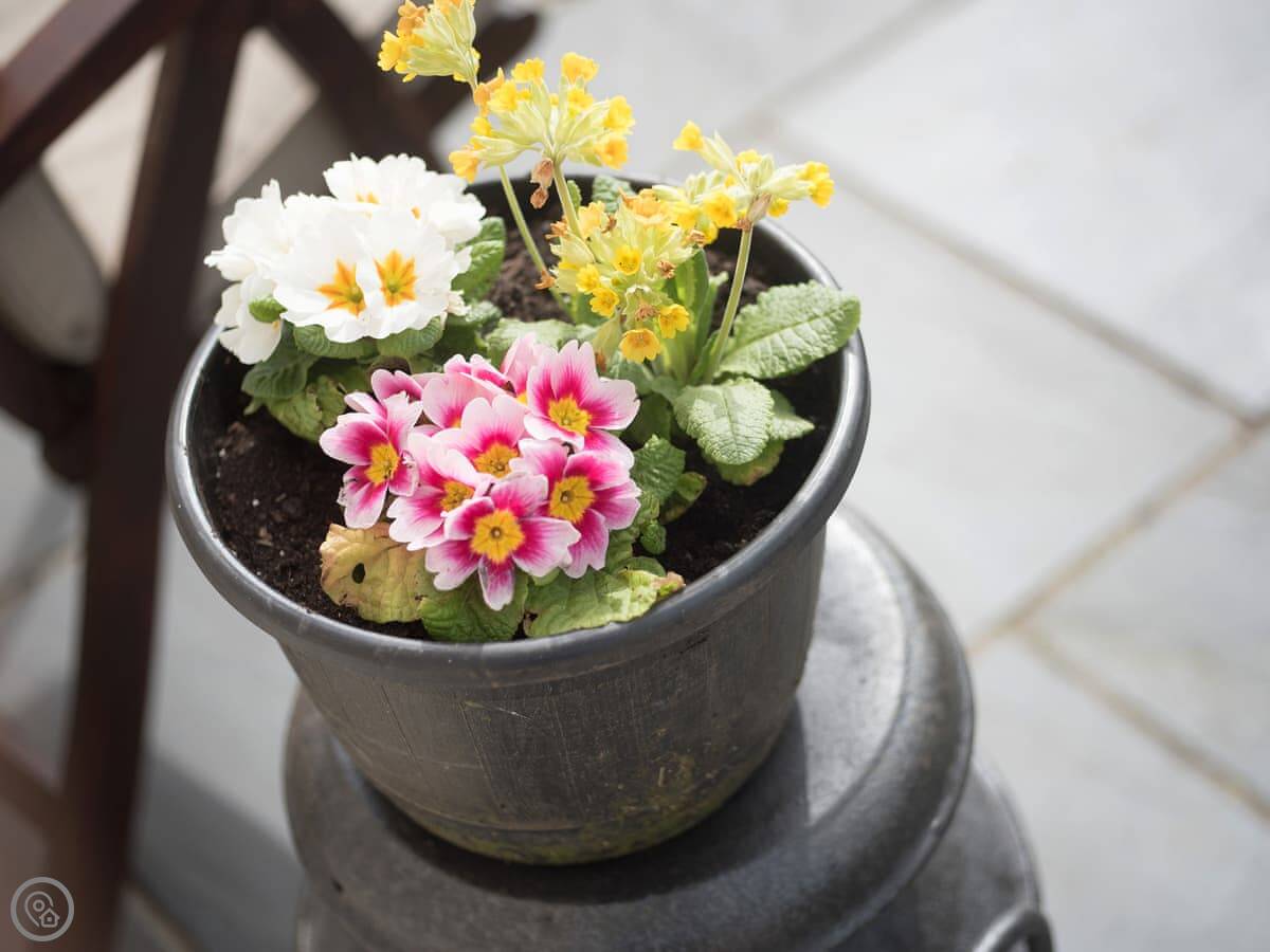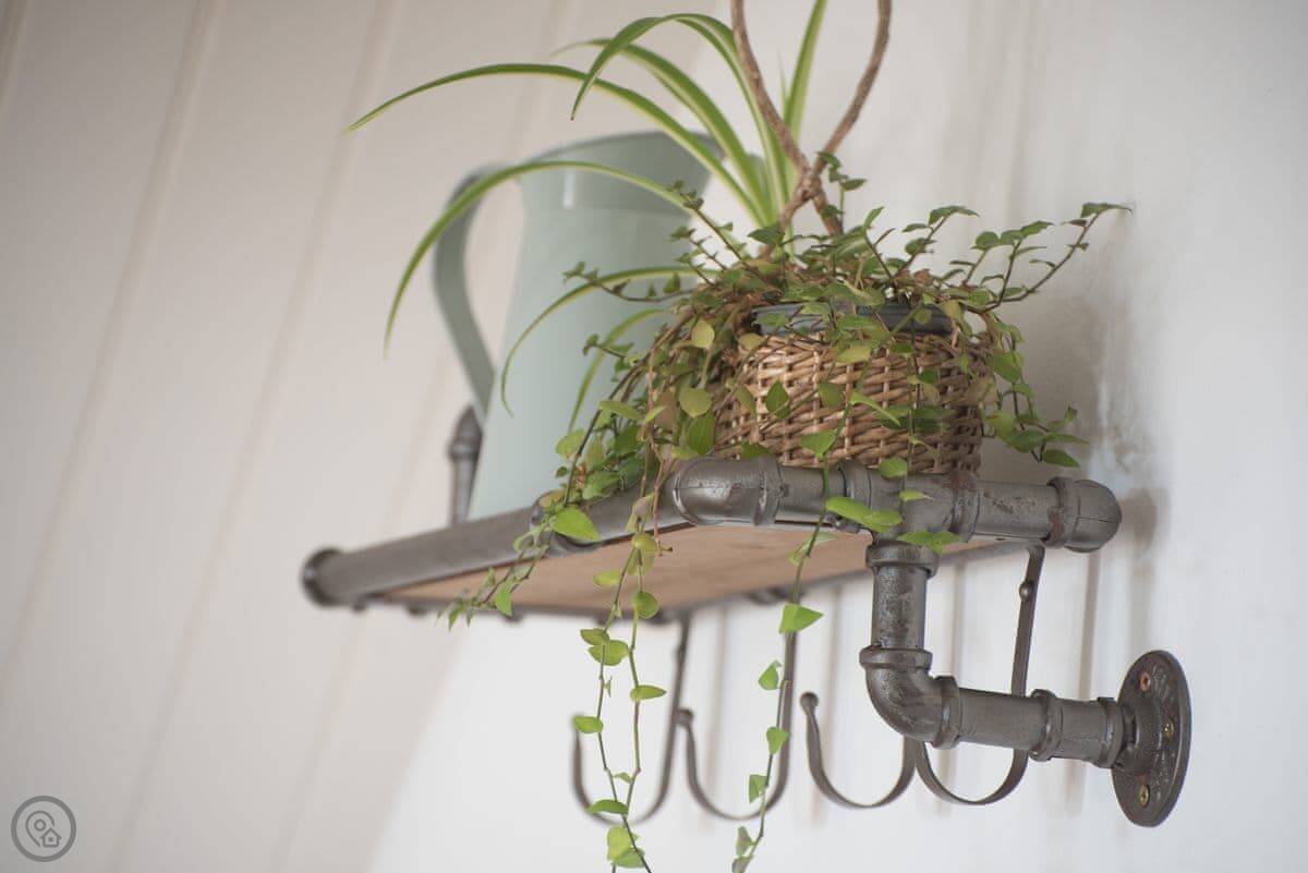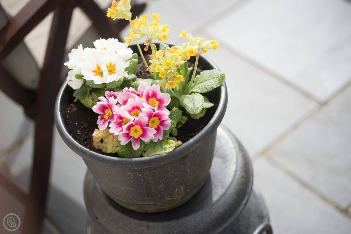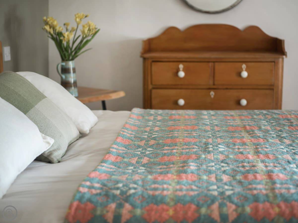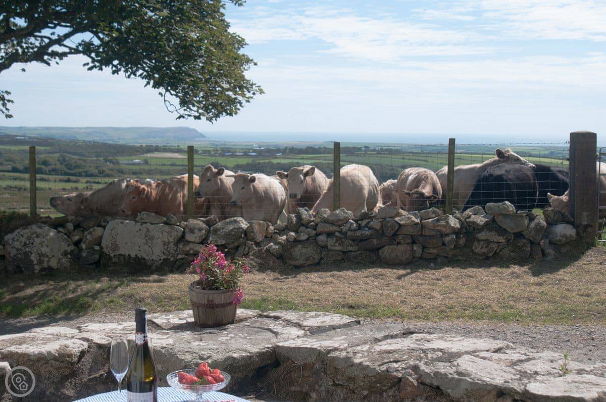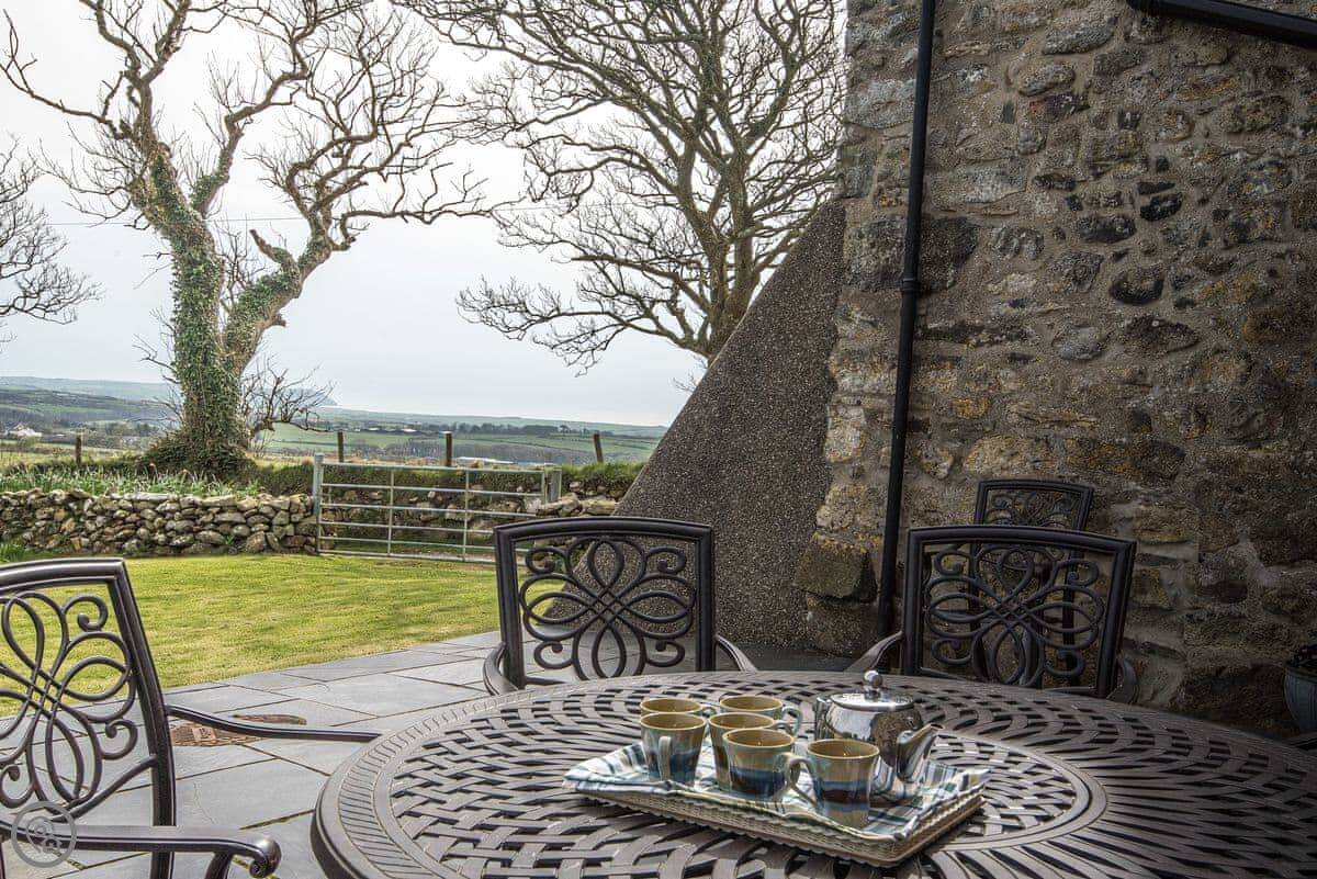 Outside, there's a small slate patio at the front for a morning coffee, looking over the fields to Porth Neigwl bay. Around the back there's a bigger slate area with a table, surrounded by trees. It's quiet, just farmland.