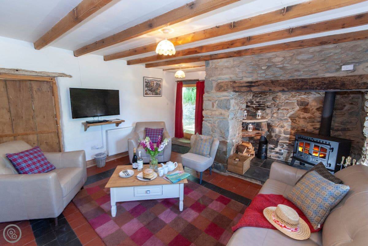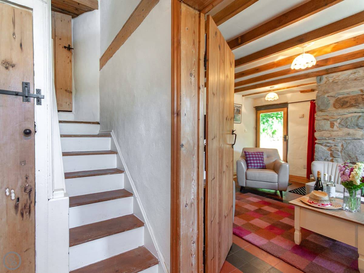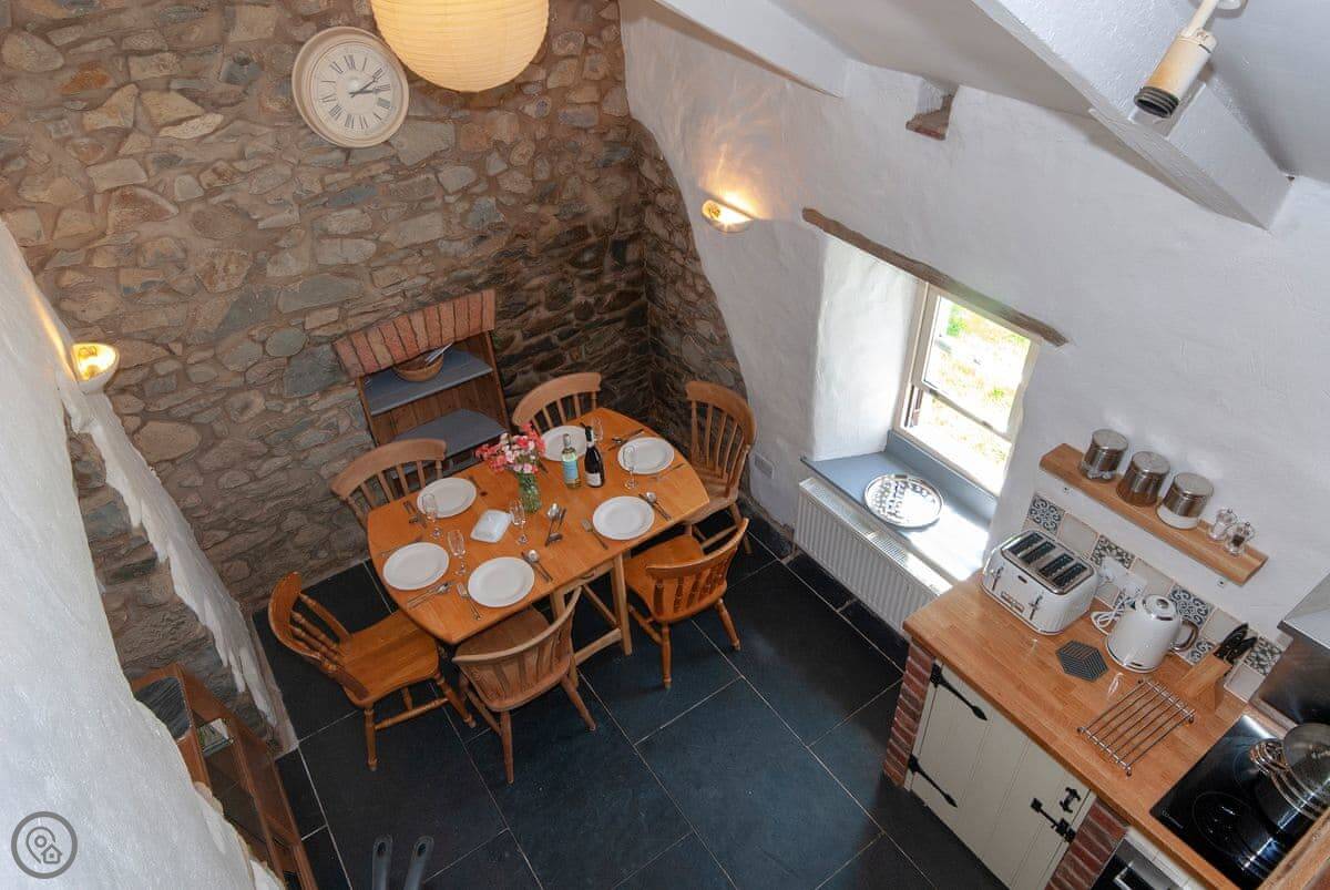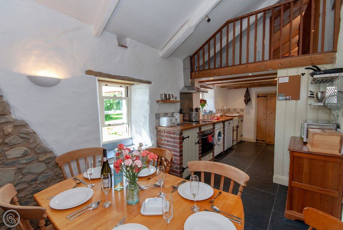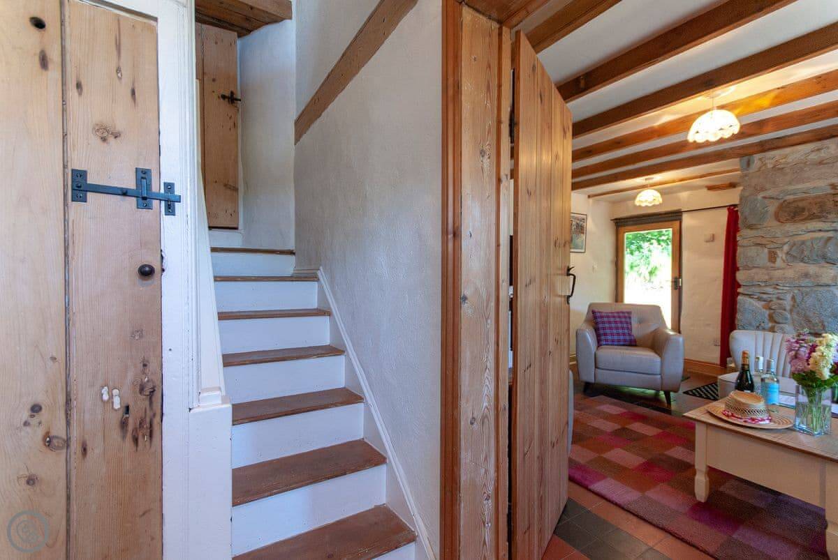 The stairs are cottage stairs, so they creak and are a bit steep. The kitchen has a beamed ceiling and a stone wall, and a gallery above where you can sit. There's a wood burner in the living room fireplace. We leave logs for you.