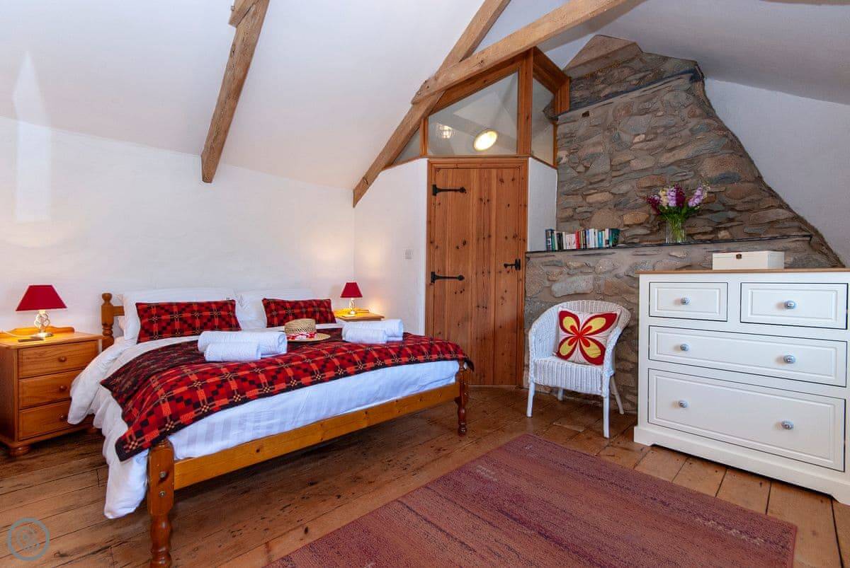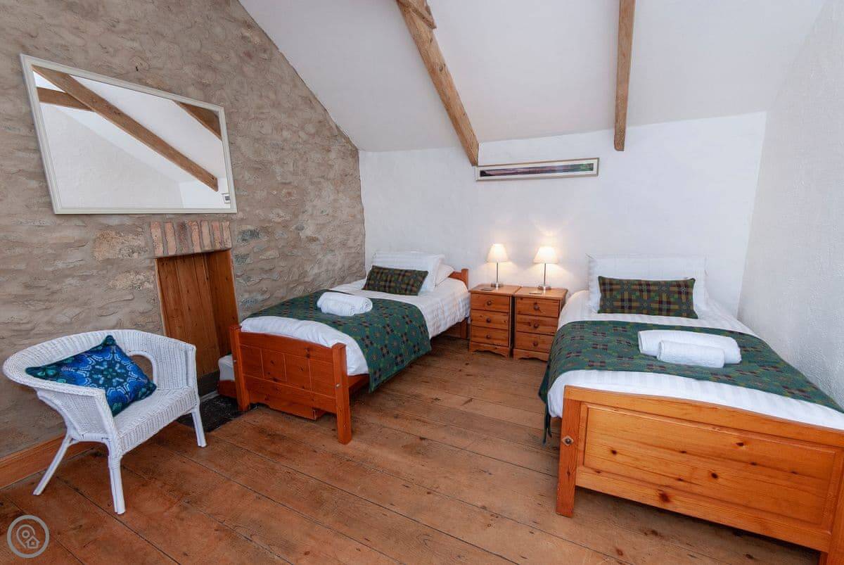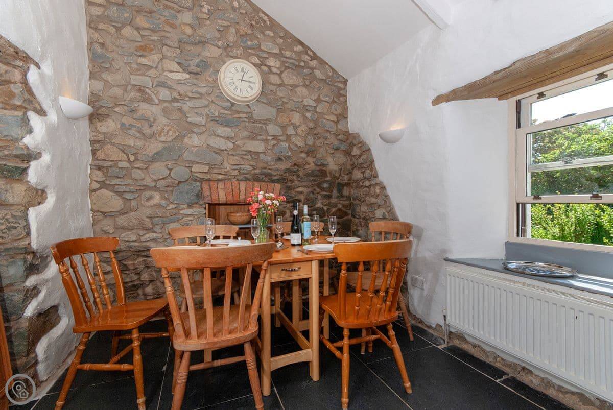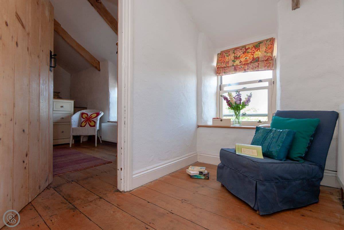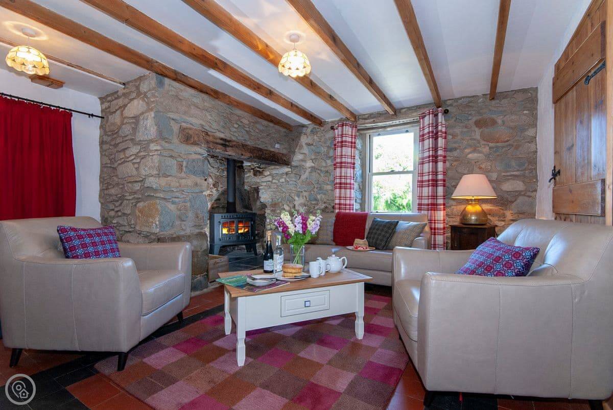 The stairs are cottage stairs, so they creak and are a bit steep. The kitchen has a beamed ceiling and a stone wall, and a gallery above where you can sit. There's a wood burner in the living room fireplace. We leave logs for you.