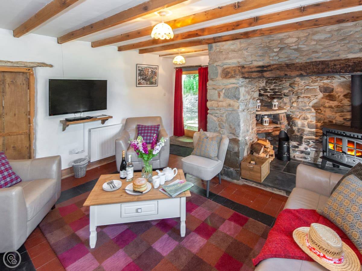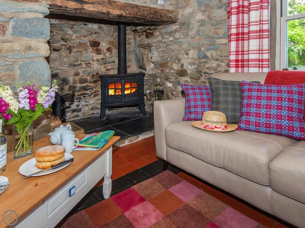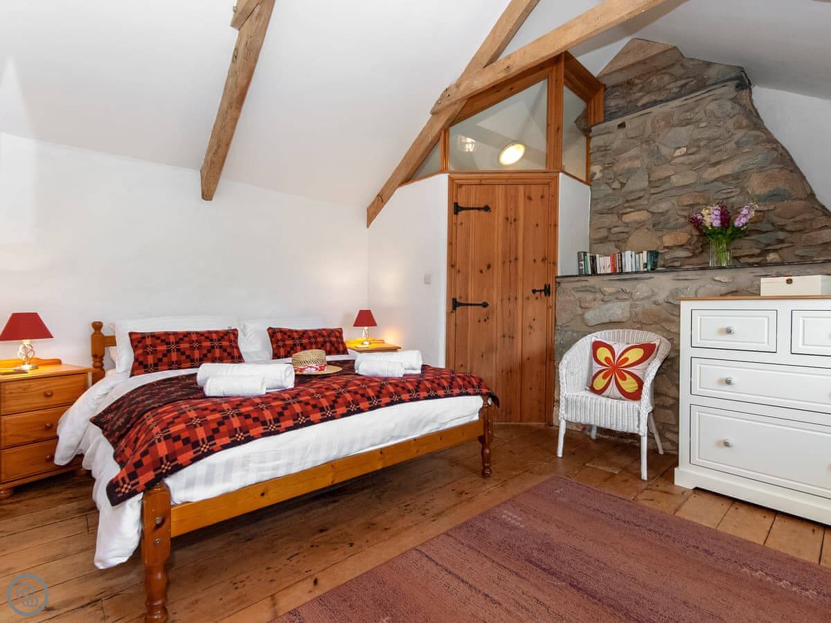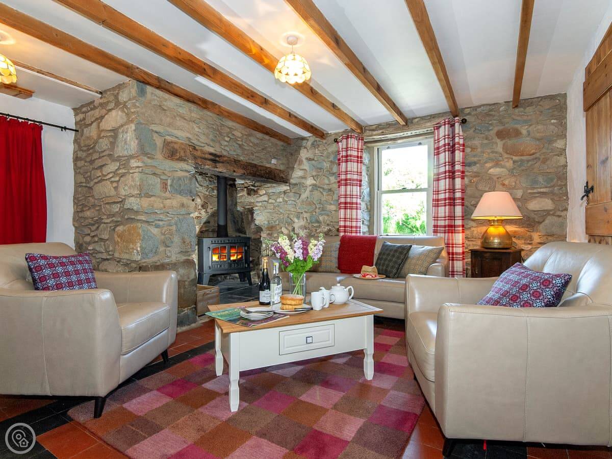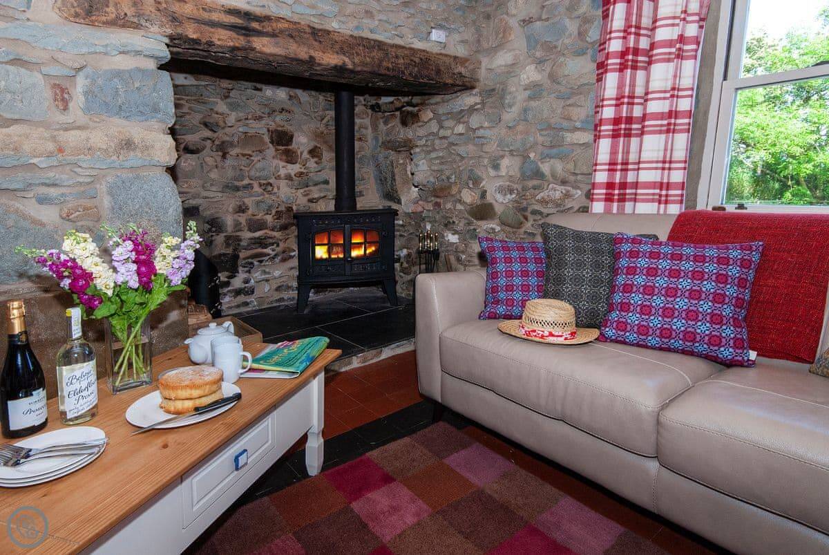 The stairs are cottage stairs, so they creak and are a bit steep. The kitchen has a beamed ceiling and a stone wall, and a gallery above where you can sit. There's a wood burner in the living room fireplace. We leave logs for you.