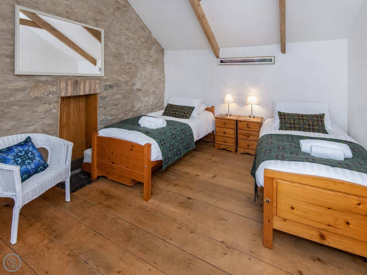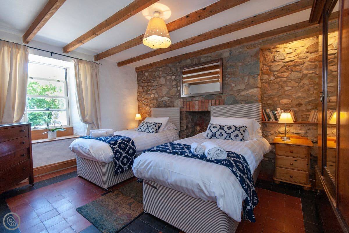 It sleeps six. Three bedrooms, two bathrooms. One bathroom is downstairs. It has a 4 Star rating. The furniture and bedding are good quality.