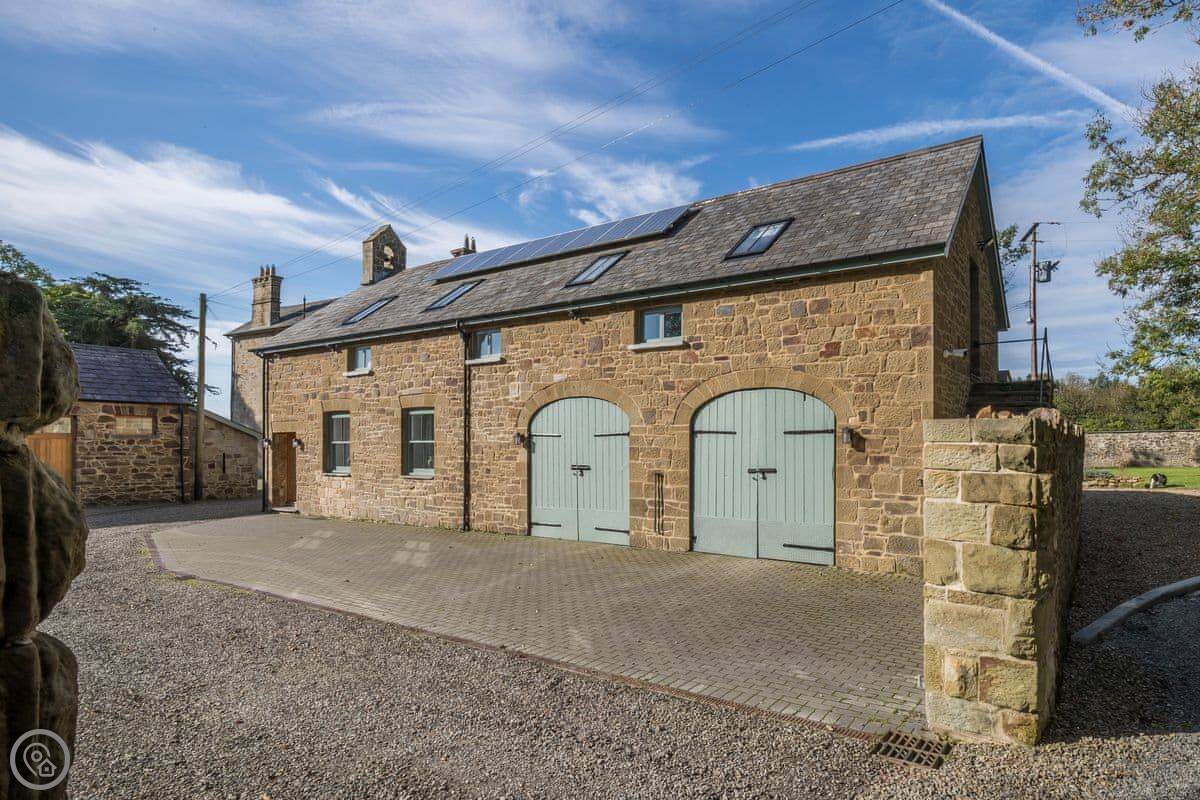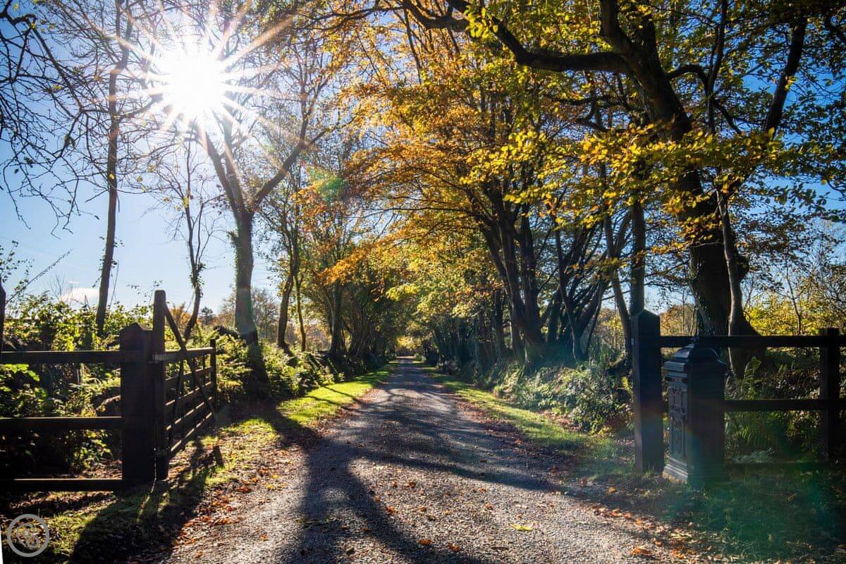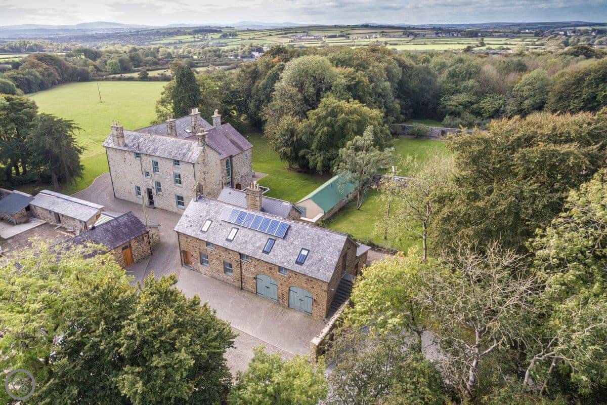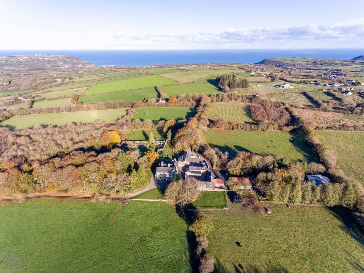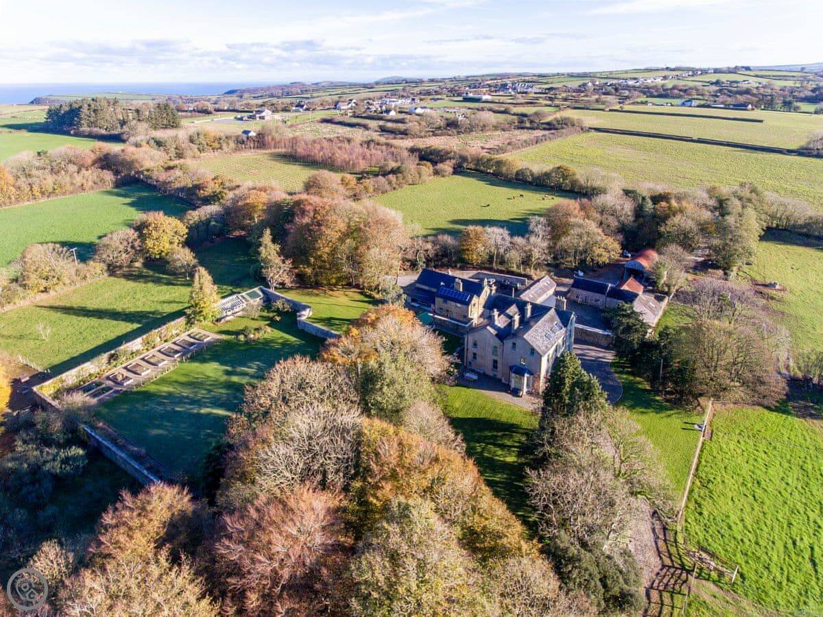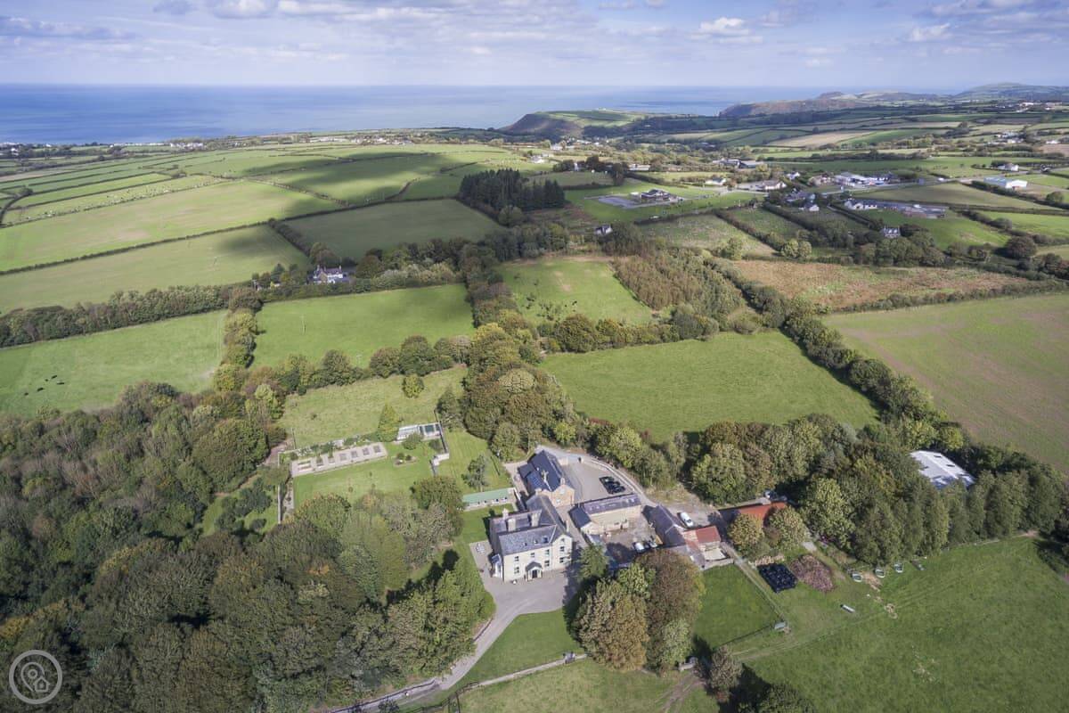The Coach House is on the Glaneirw Estate, just outside Tan y groes. You turn off the lane onto a private drive lined with beech trees. It's detached and quite big, sleeps nine in five bedrooms. There are three bathrooms and a downstairs loo.