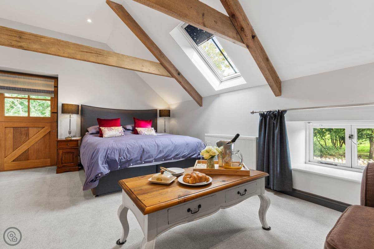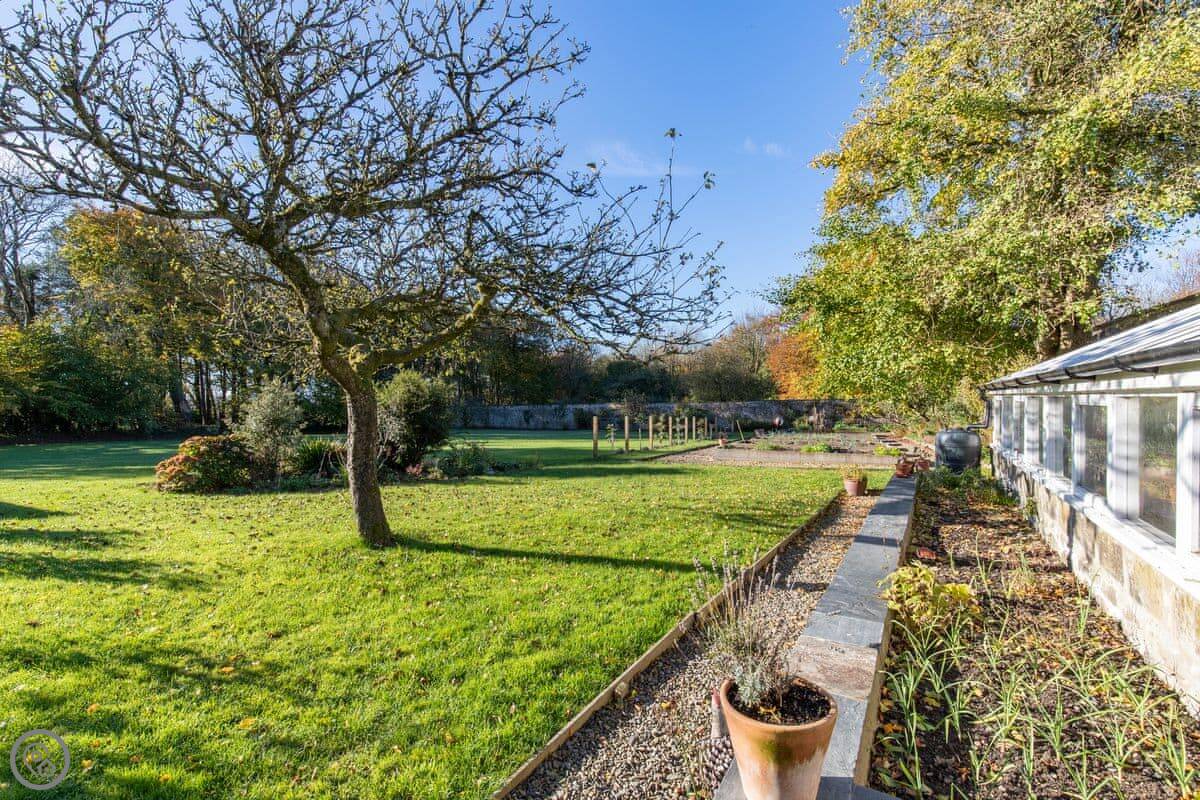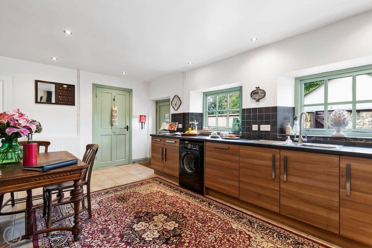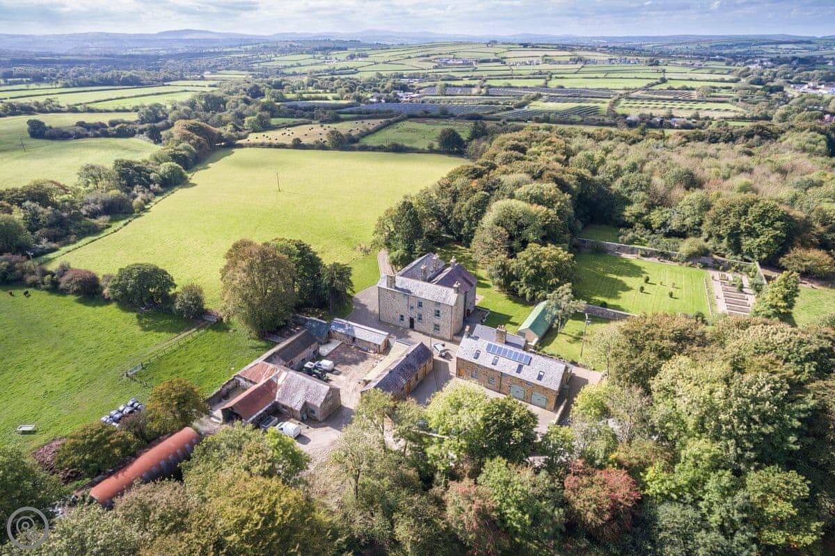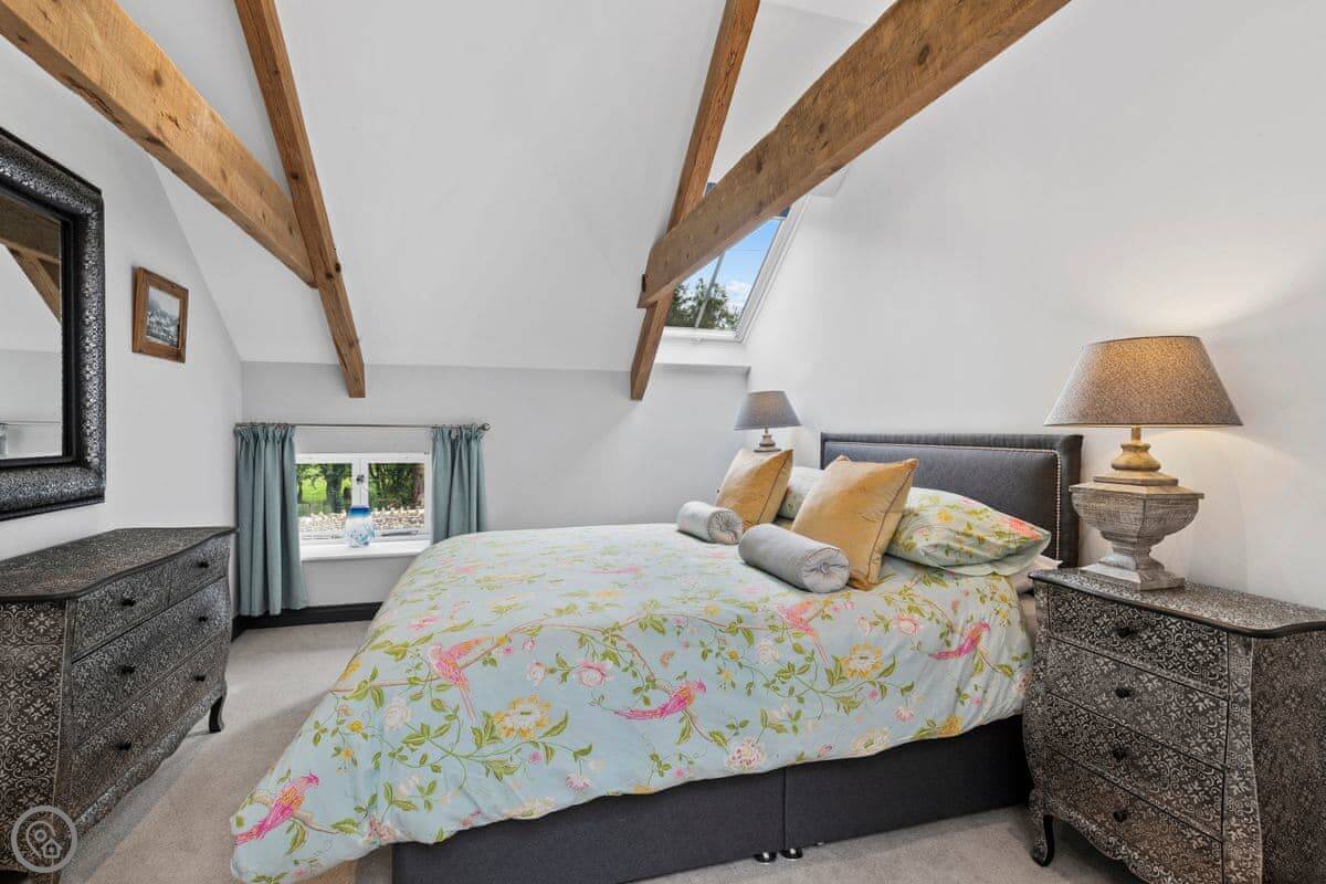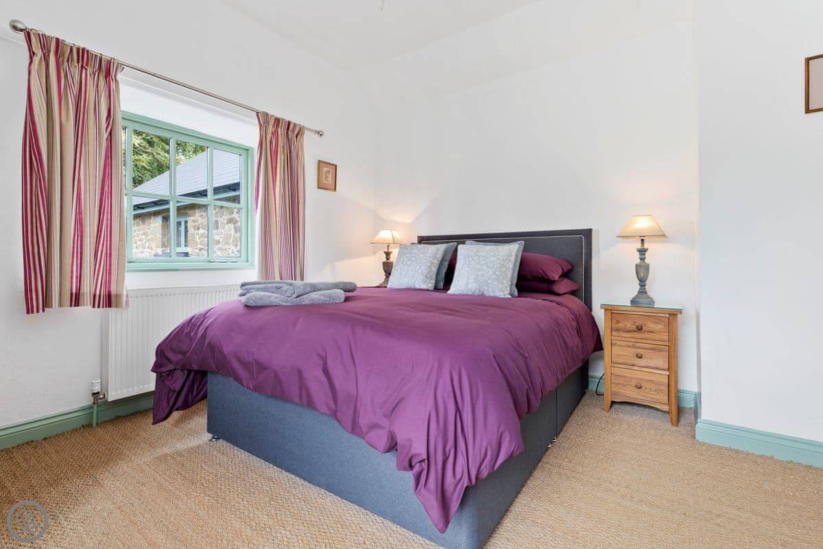 The Coach House is on the Glaneirw Estate, just outside Tan y groes. You turn off the lane onto a private drive lined with beech trees. It's detached and quite big, sleeps nine in five bedrooms. There are three bathrooms and a downstairs loo.