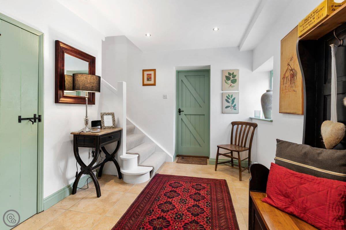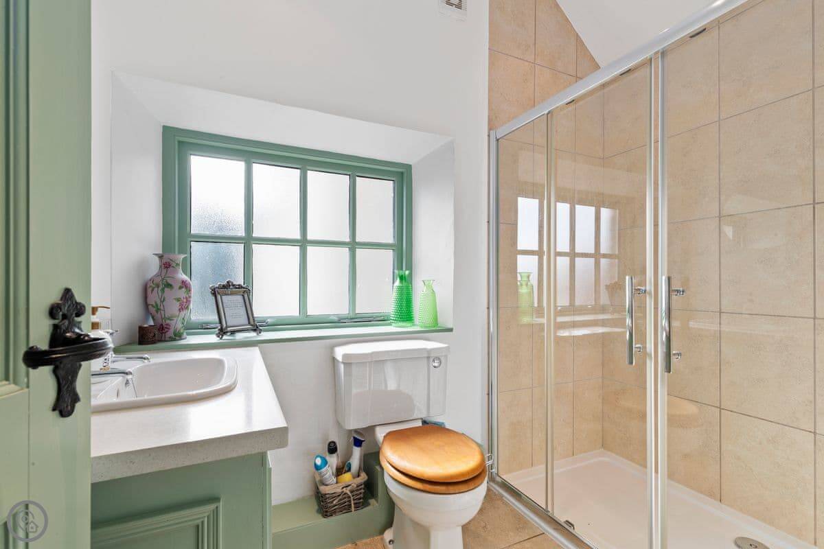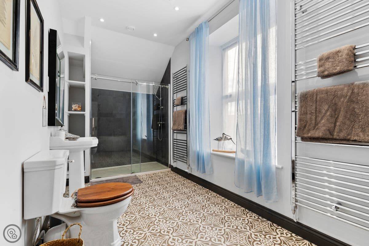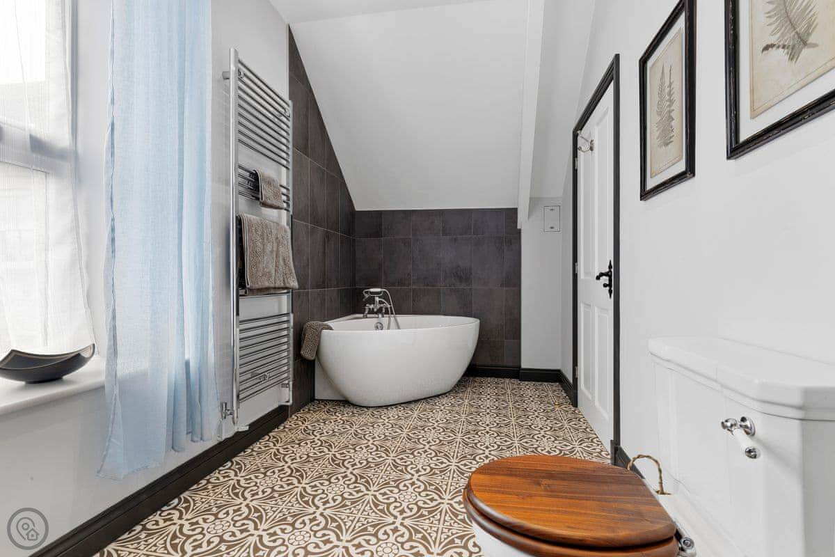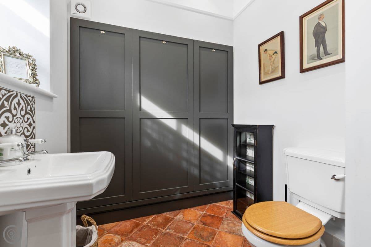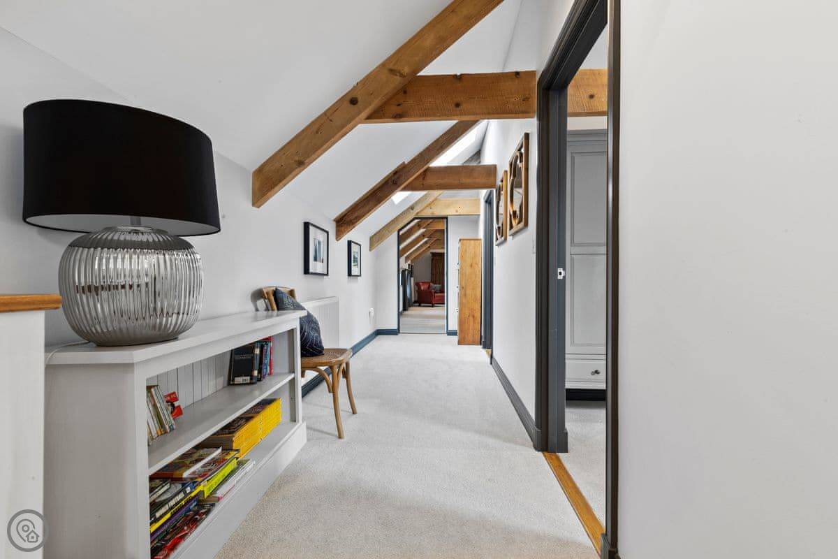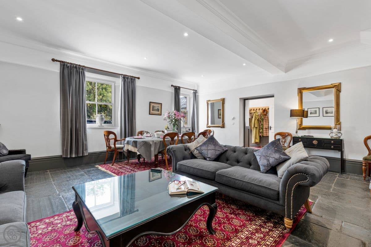 The Coach House is on the Glaneirw Estate, just outside Tan y groes. You turn off the lane onto a private drive lined with beech trees. It's detached and quite big, sleeps nine in five bedrooms. There are three bathrooms and a downstairs loo.