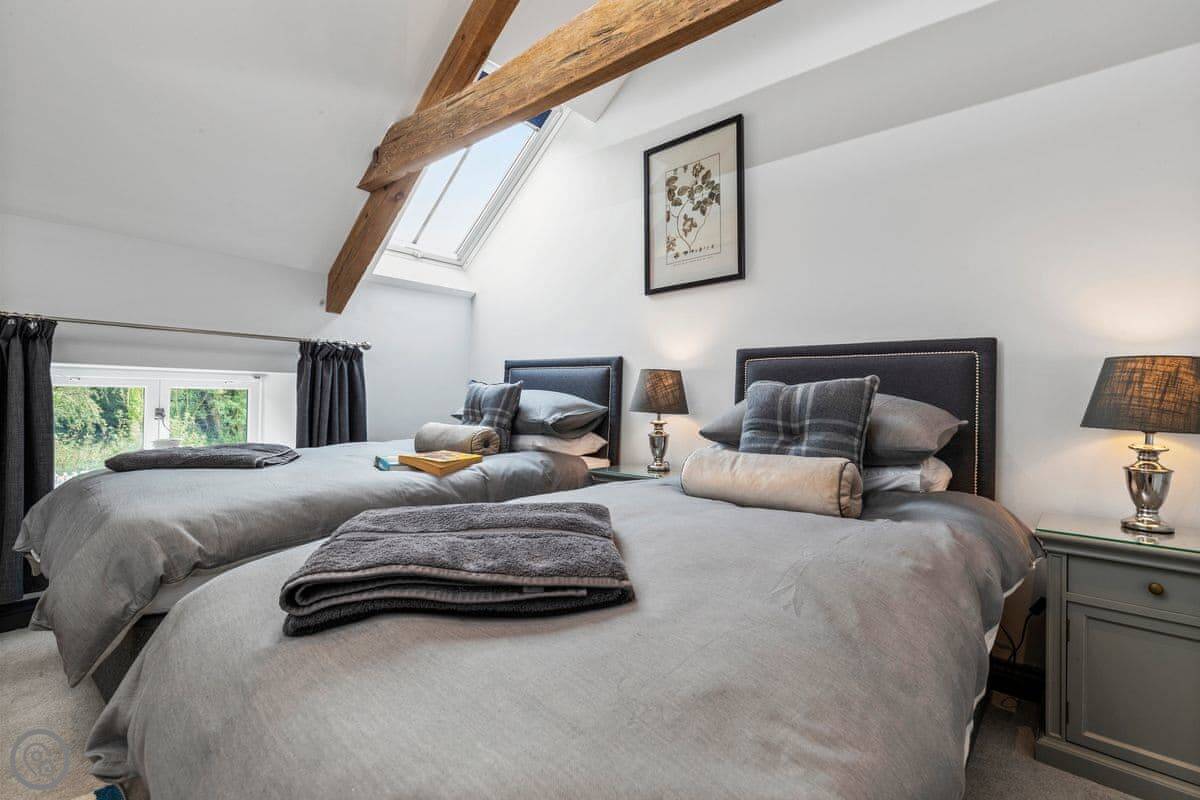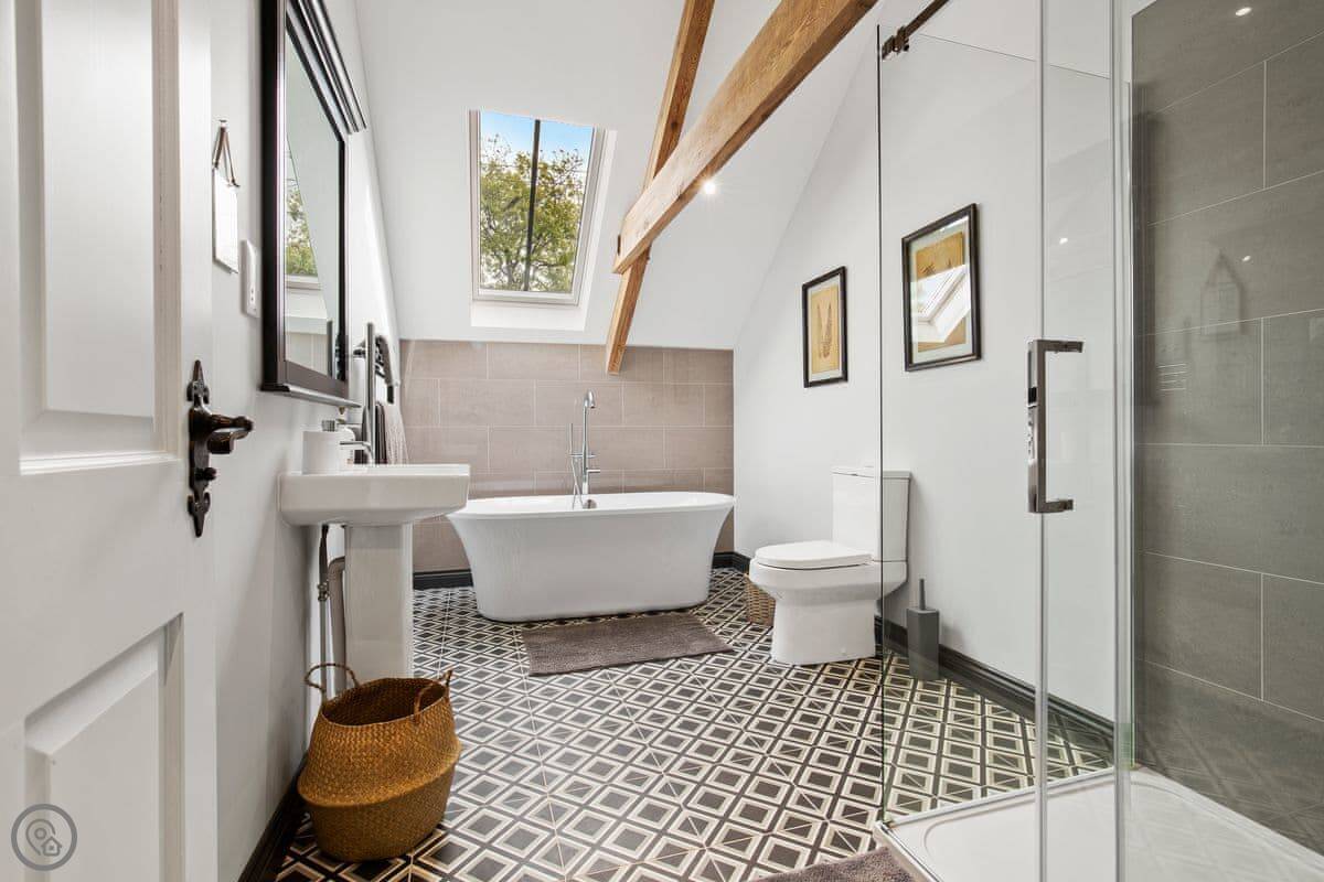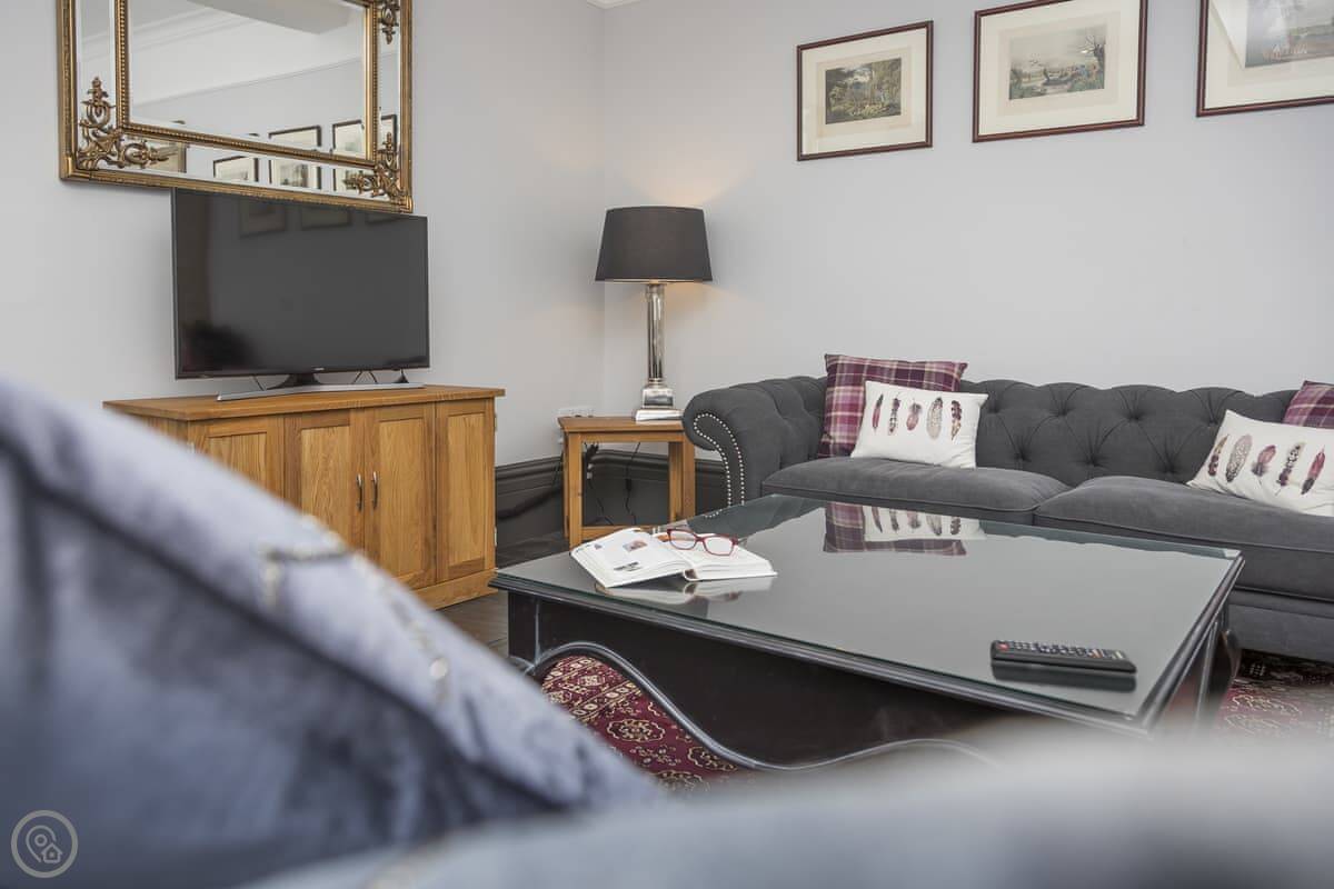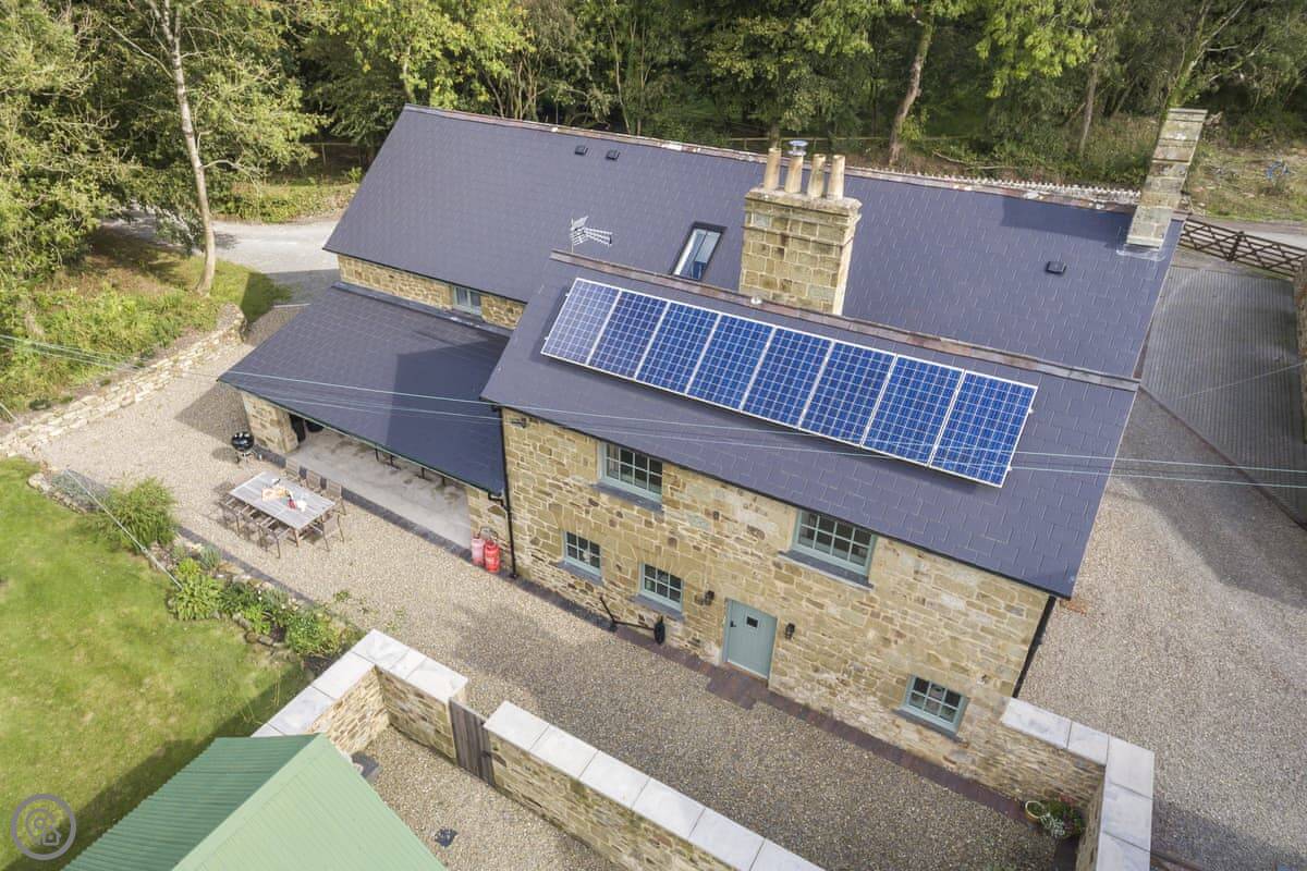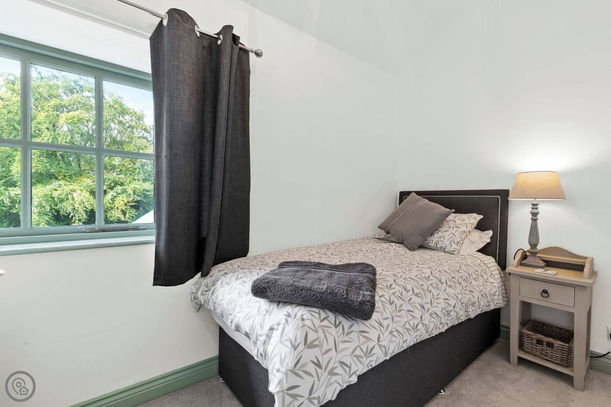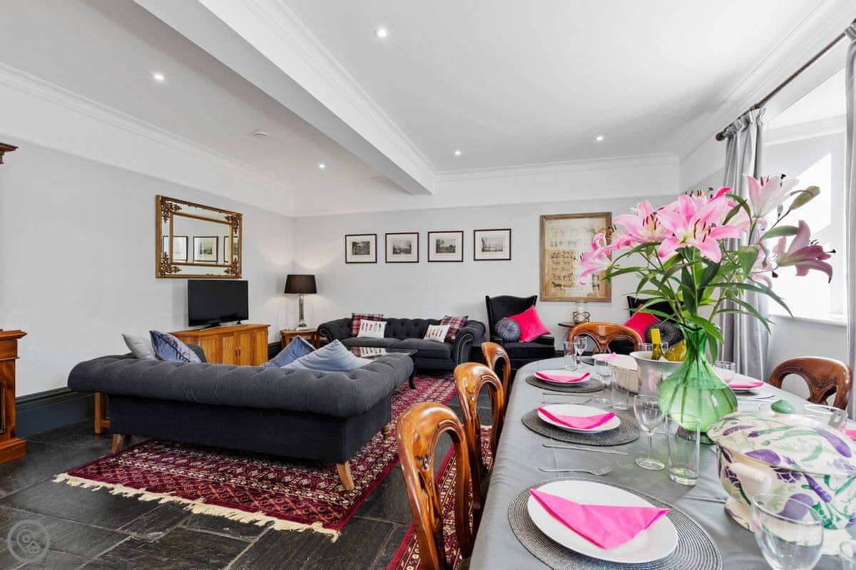 The Coach House is on the Glaneirw Estate, just outside Tan y groes. You turn off the lane onto a private drive lined with beech trees. It's detached and quite big, sleeps nine in five bedrooms. There are three bathrooms and a downstairs loo.