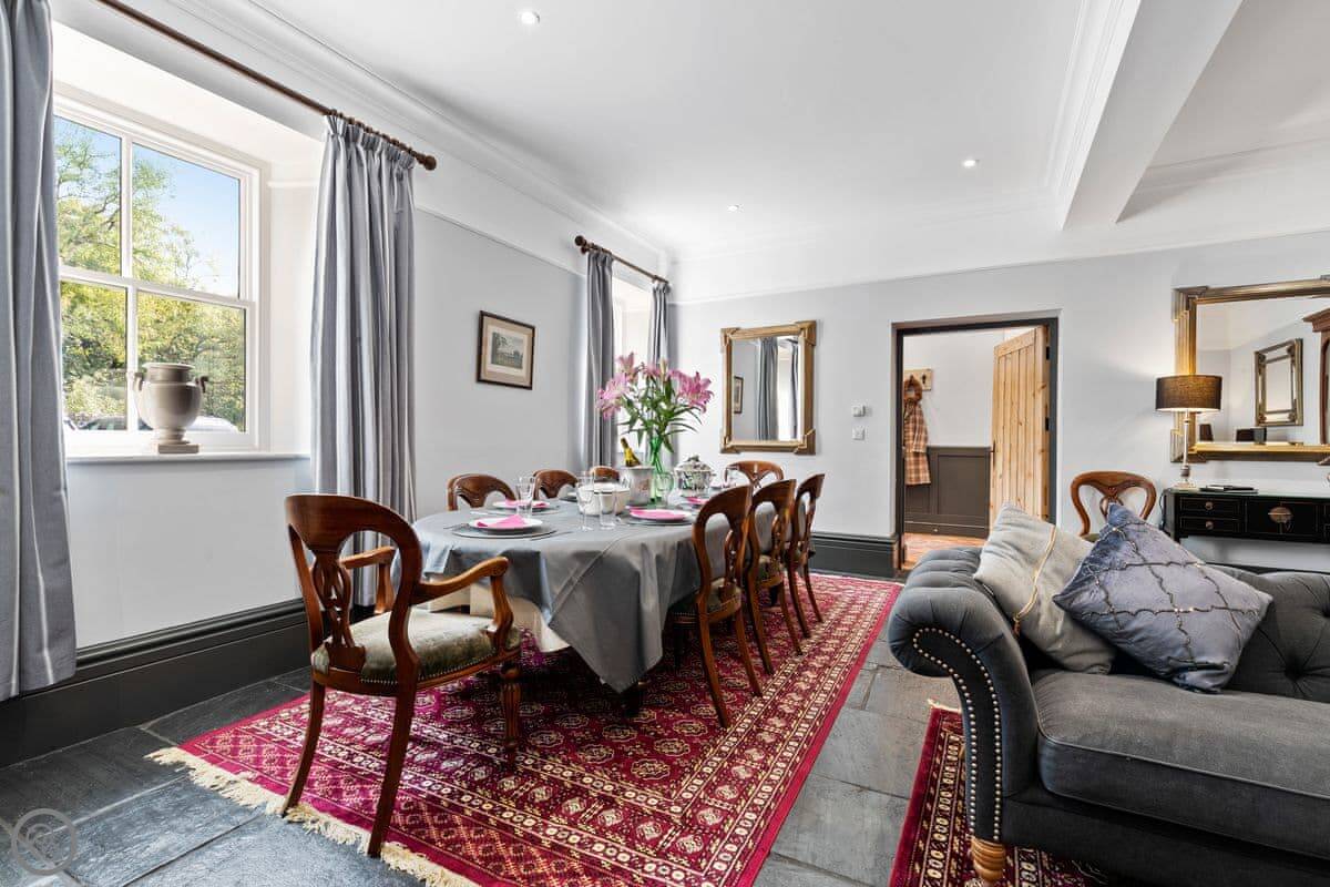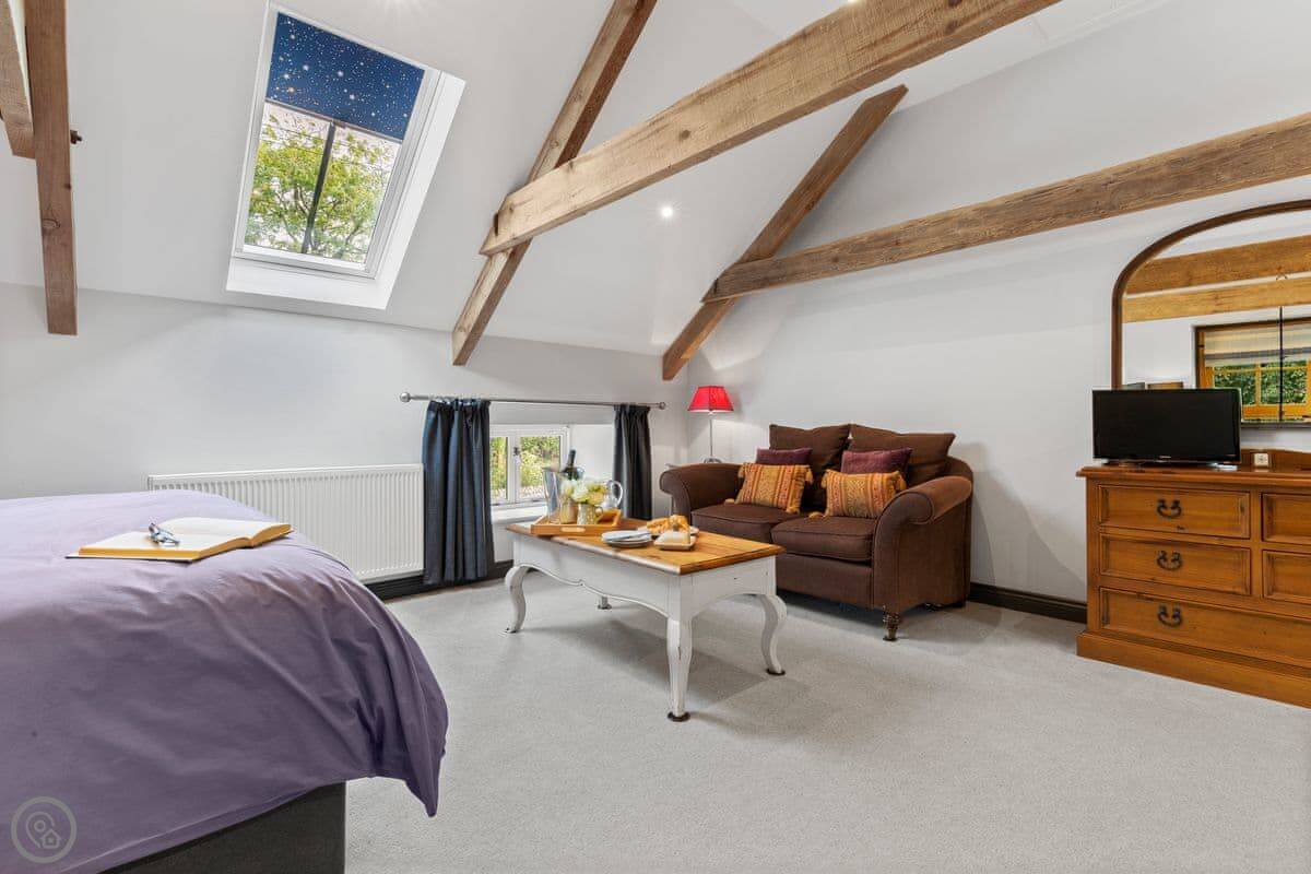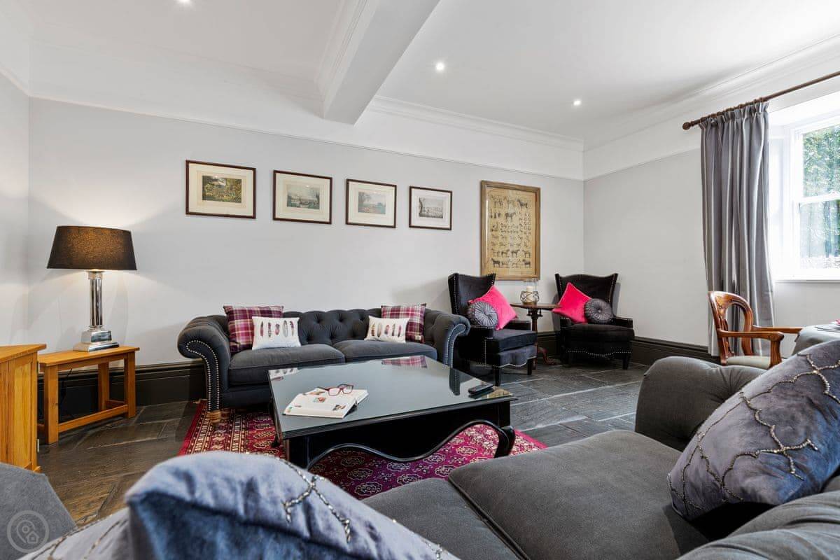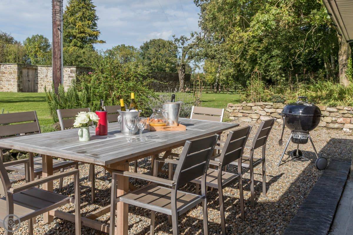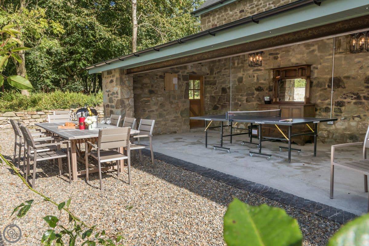 There's a separate lounge with a TV, which is handy if you've got kids with you. The garden is quiet, just fields and trees. You might hear a woodpecker. There's a covered outdoor area with a table and a ping pong table in the games room.