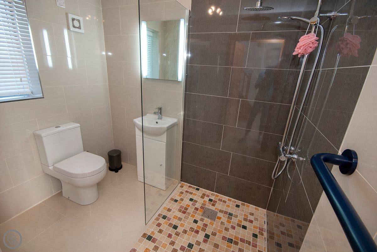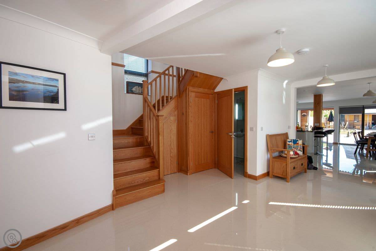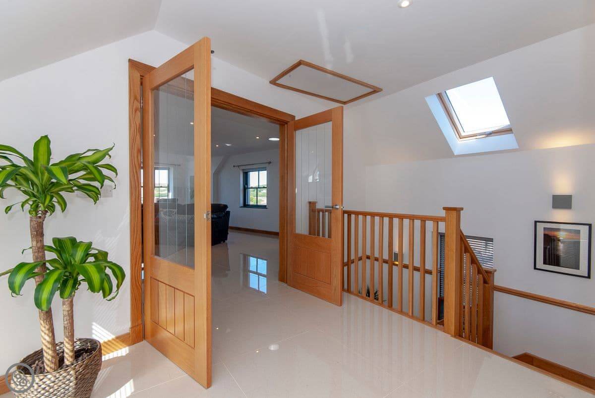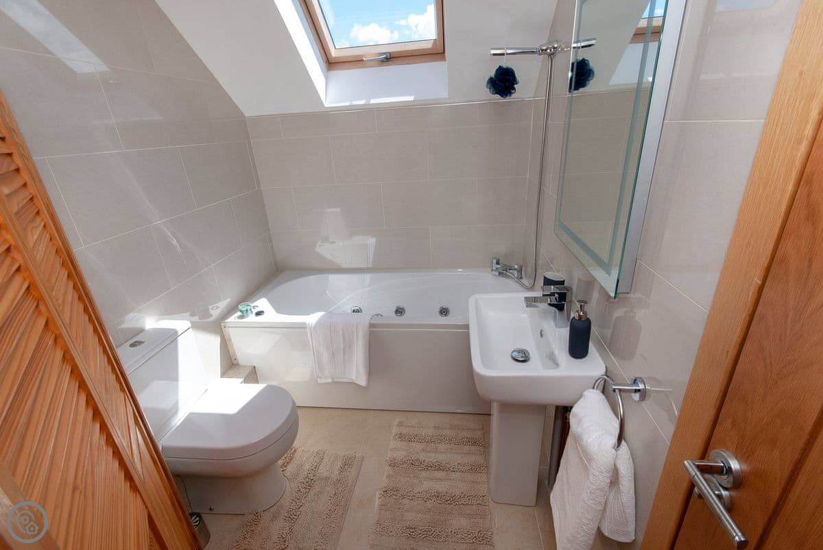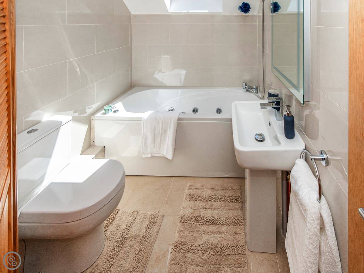It sleeps six, with three bedrooms and three bathrooms, so everyone gets their own space. It's got a 5 Star rating, which means it's well kitted out and comfortable. The bedrooms are all doubles. One is on the ground floor.
