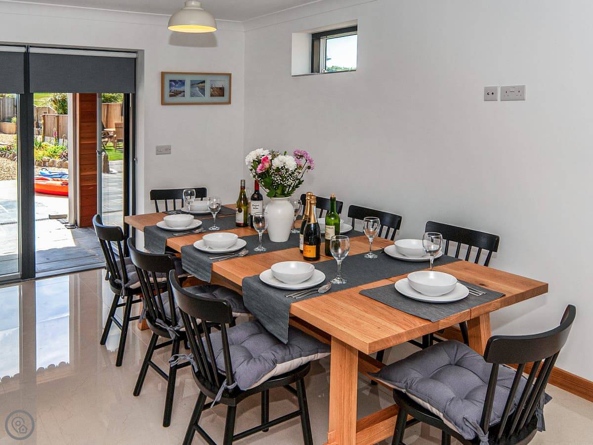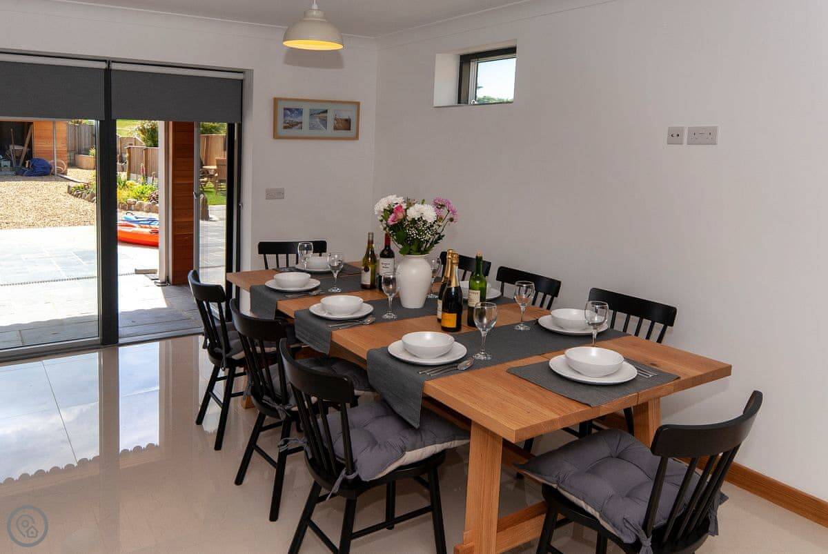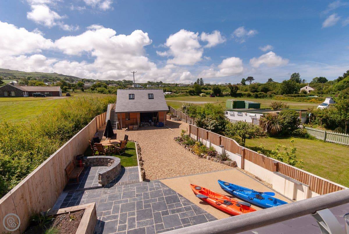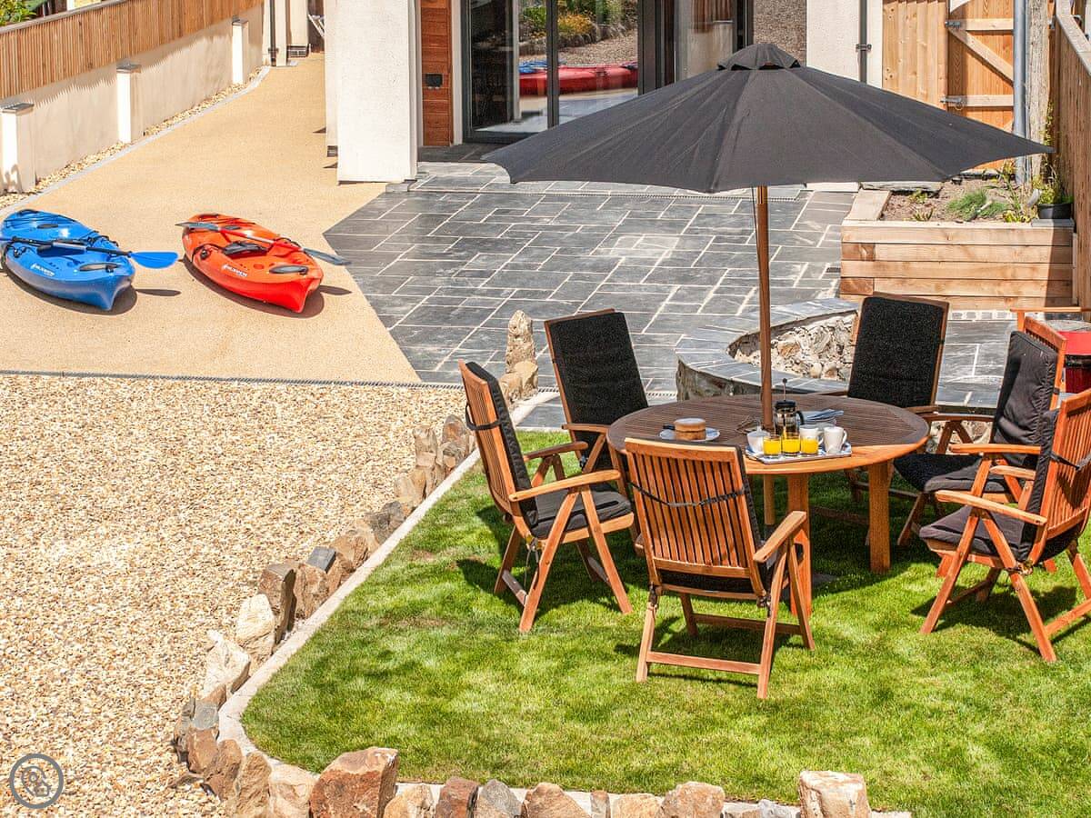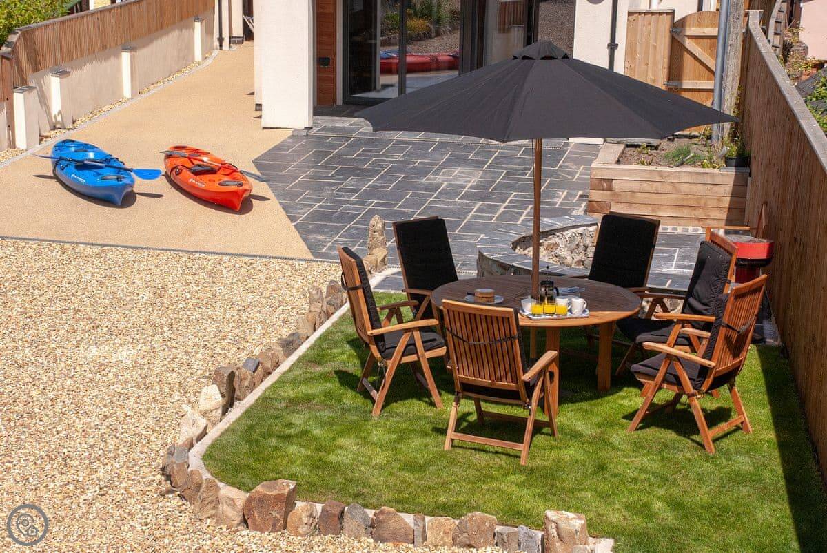 The main living space is open plan on the ground floor. There's a kitchen, dining area, and a snug with a TV. Patio doors open to a garden with a patio and a BBQ.