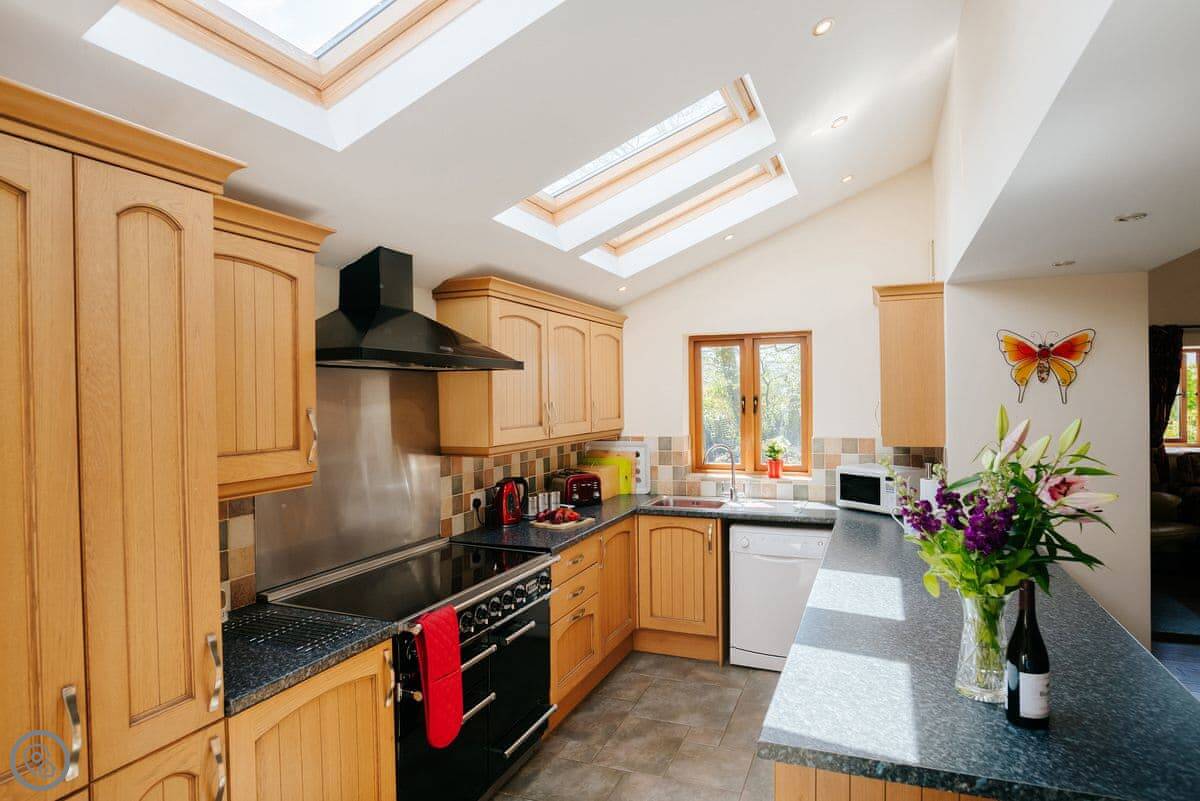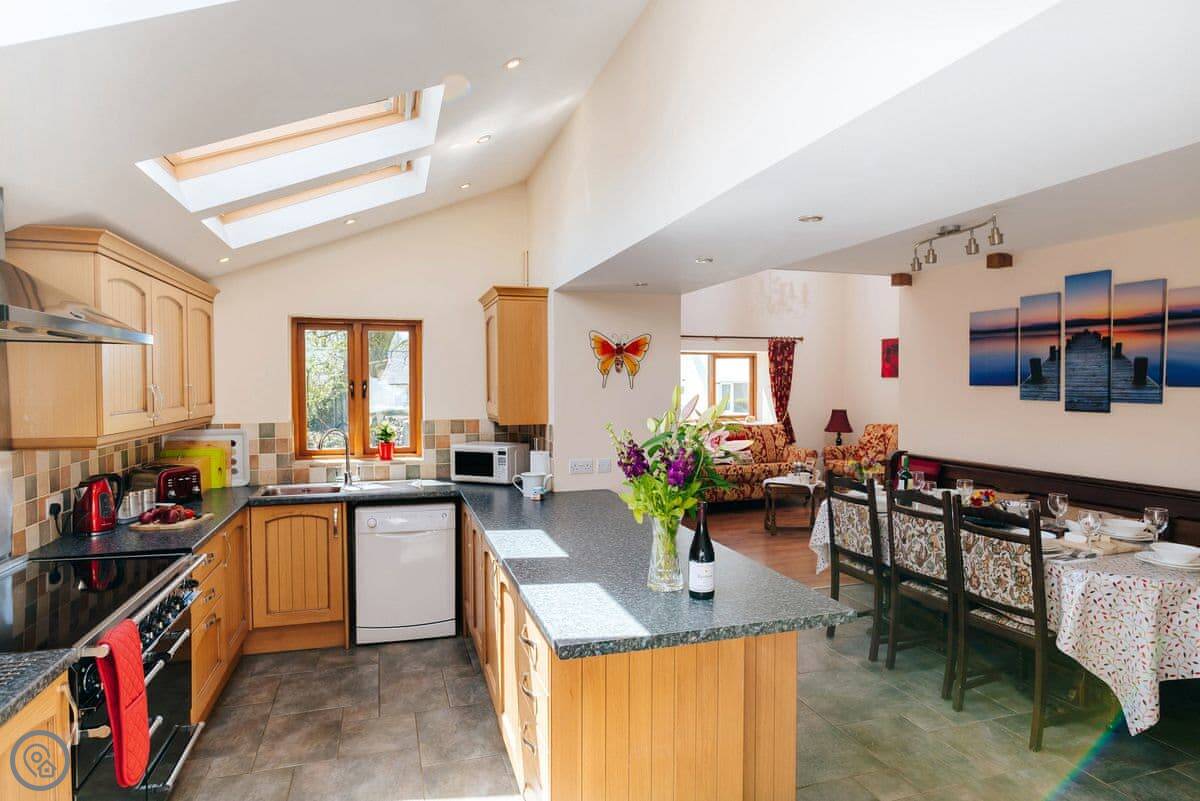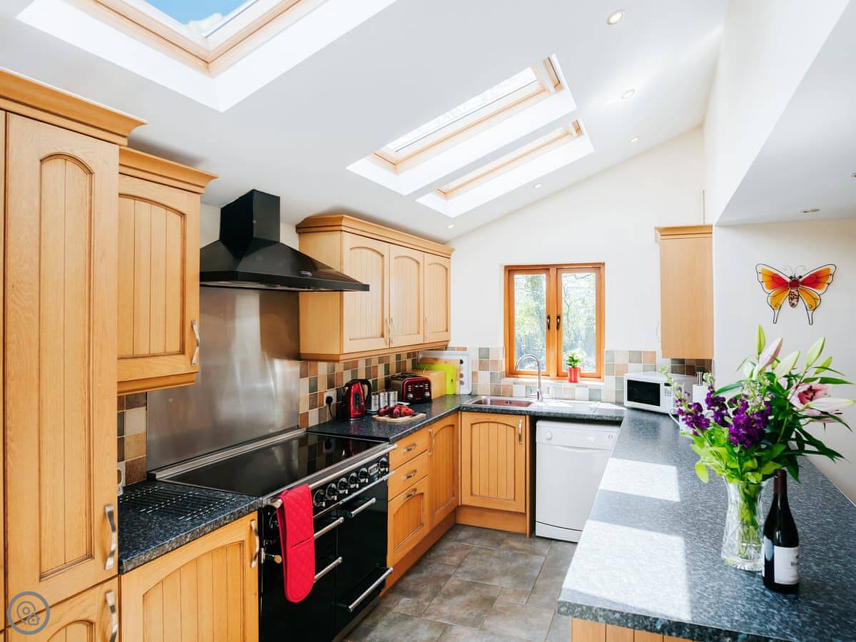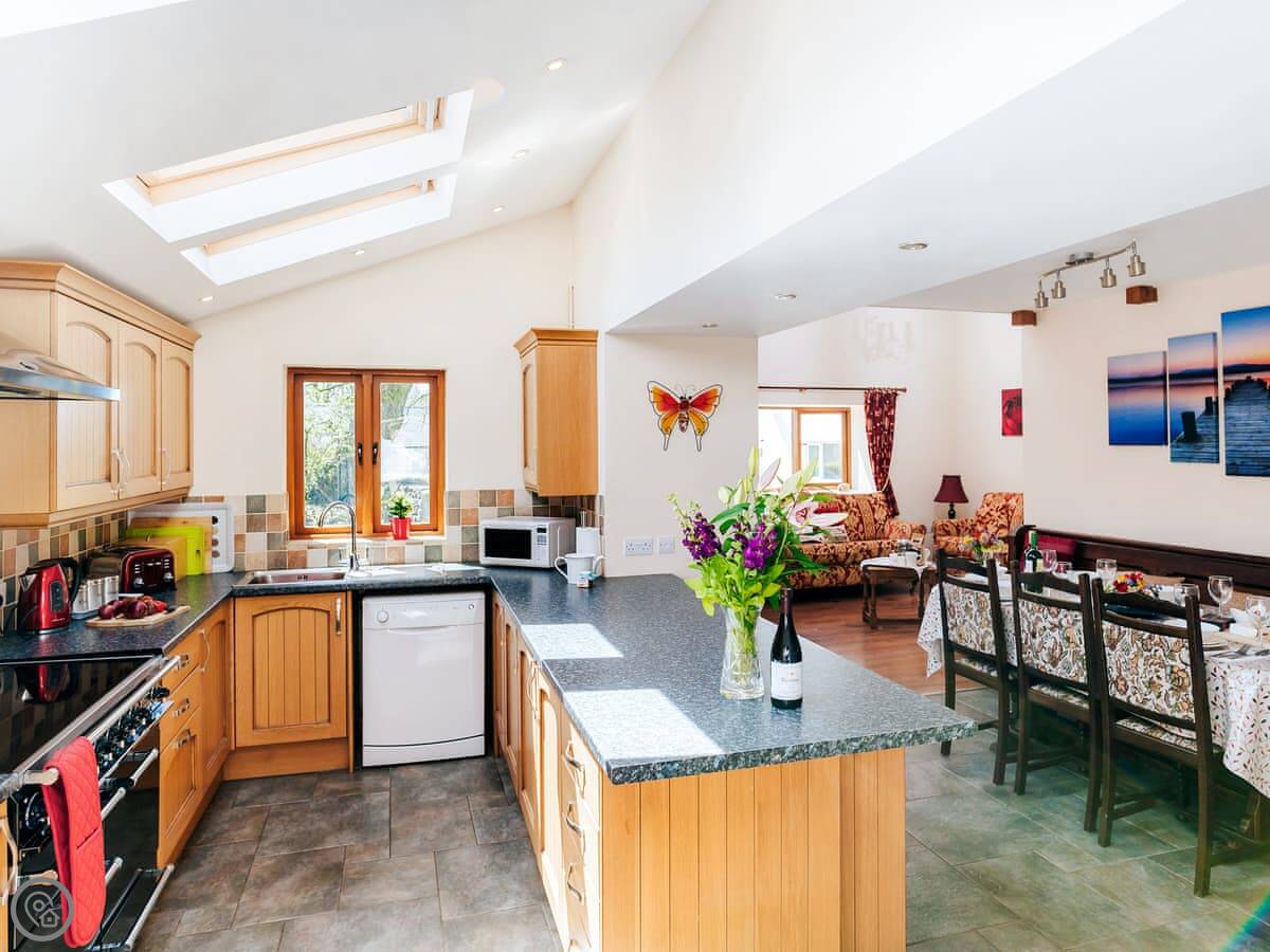 The kitchen has a big range cooker. There's a utility room at the back, which is handy for washing sandy dogs or storing walking gear.